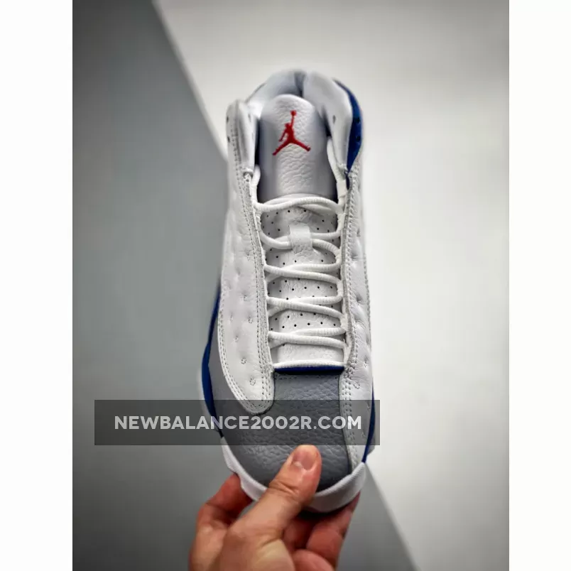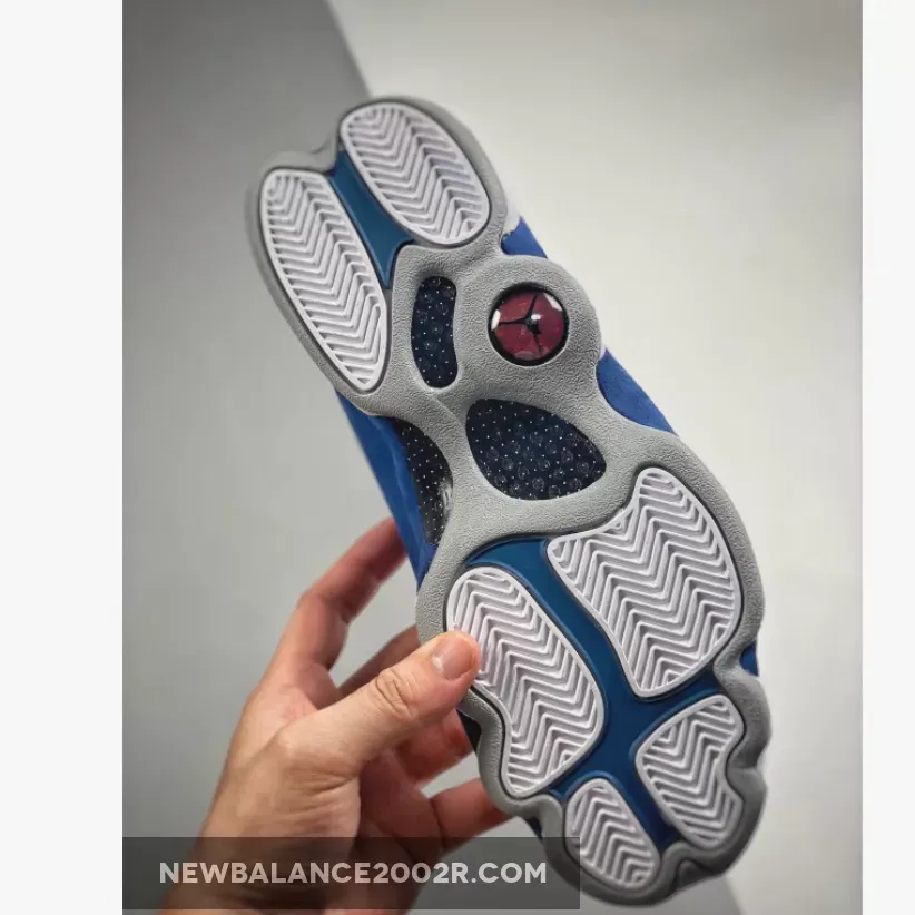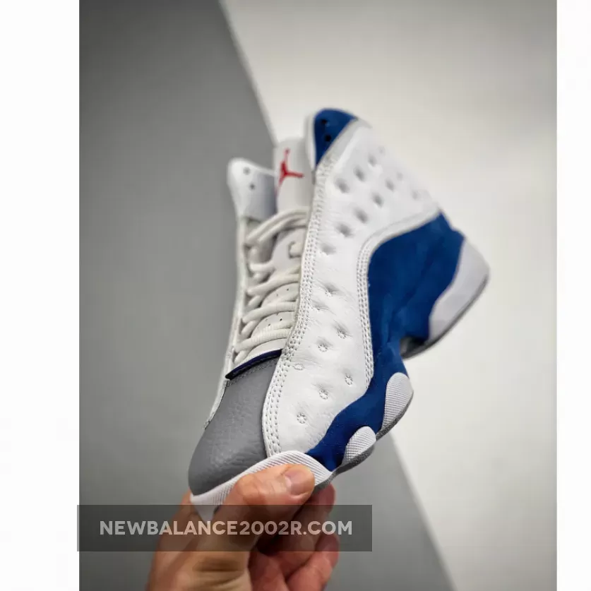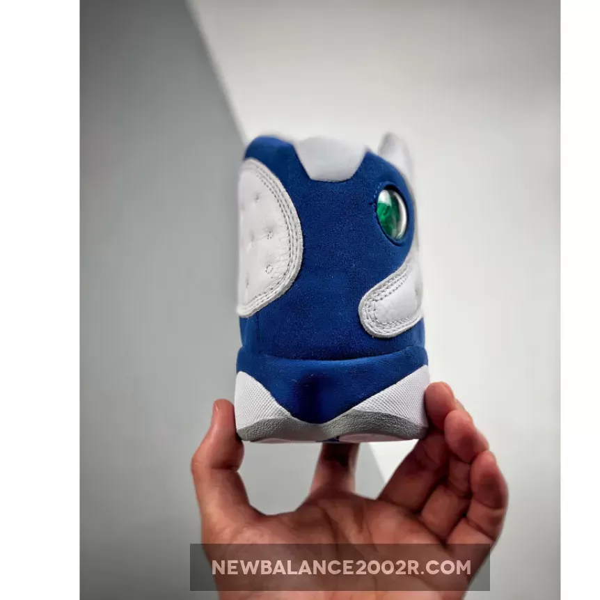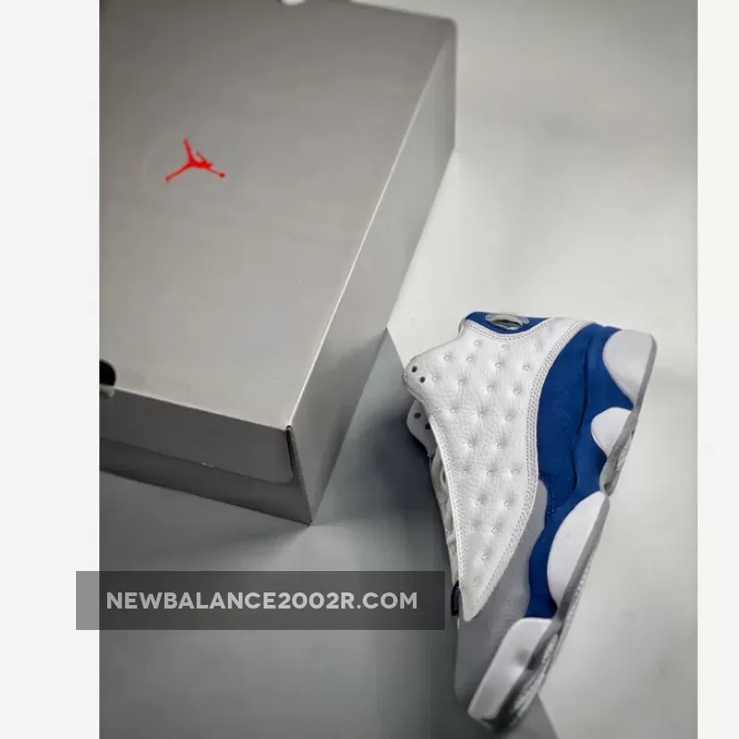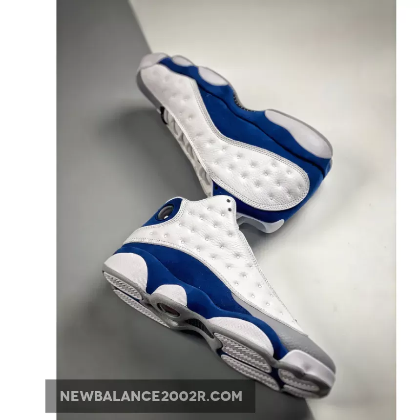 The Air Jordan 13 French Blue features a white perforated leather upper with French Blue Durabuck mudguards and a grey leather toe wrap. Nodding to Michael Jordans “Black Cat” nickname, a signature Jordan holographic emblem at the collar is reminiscent of panther eyes, while a sculptural sole takes the form of cat paws.