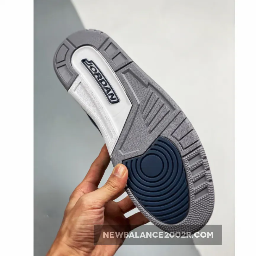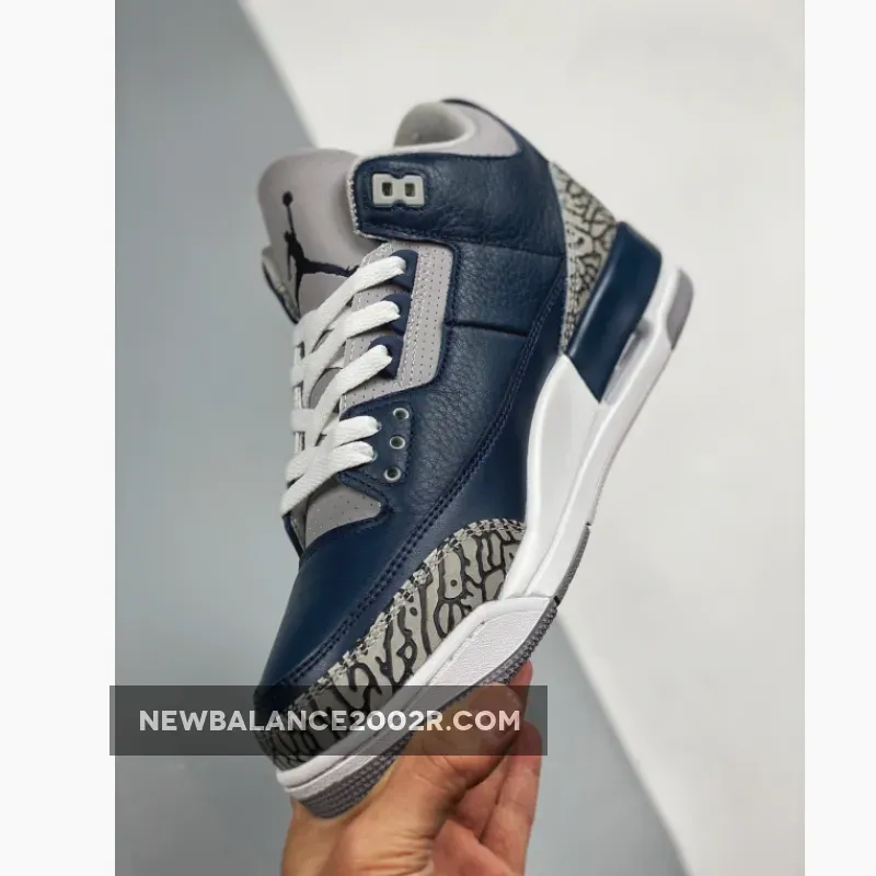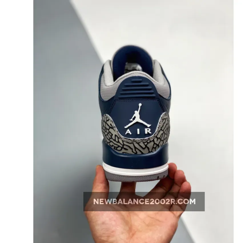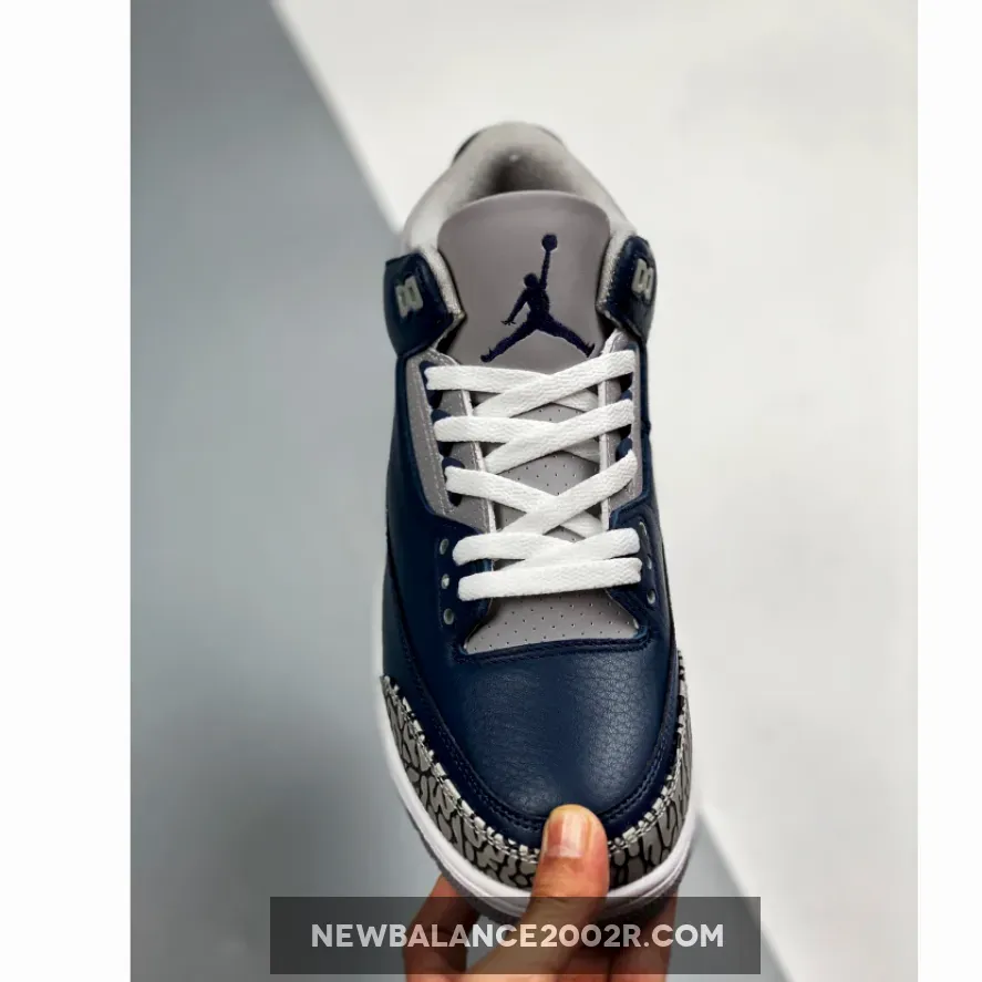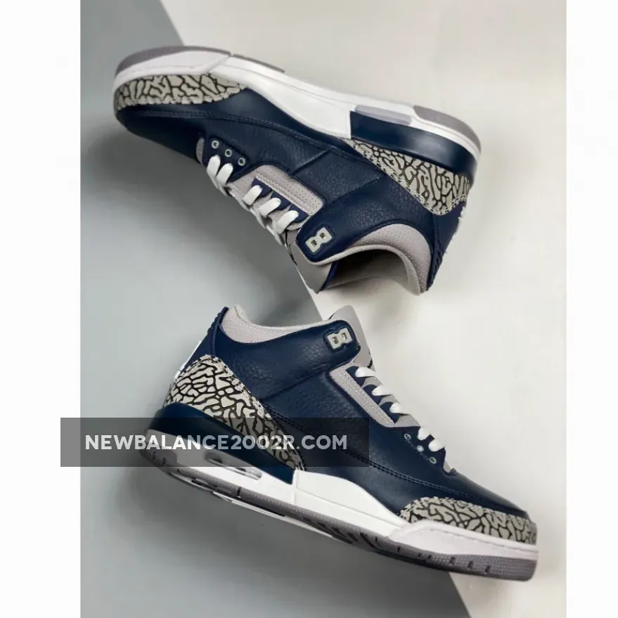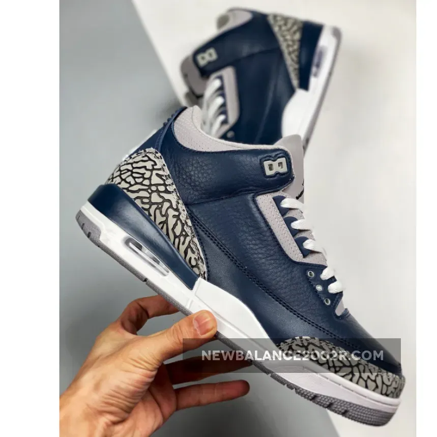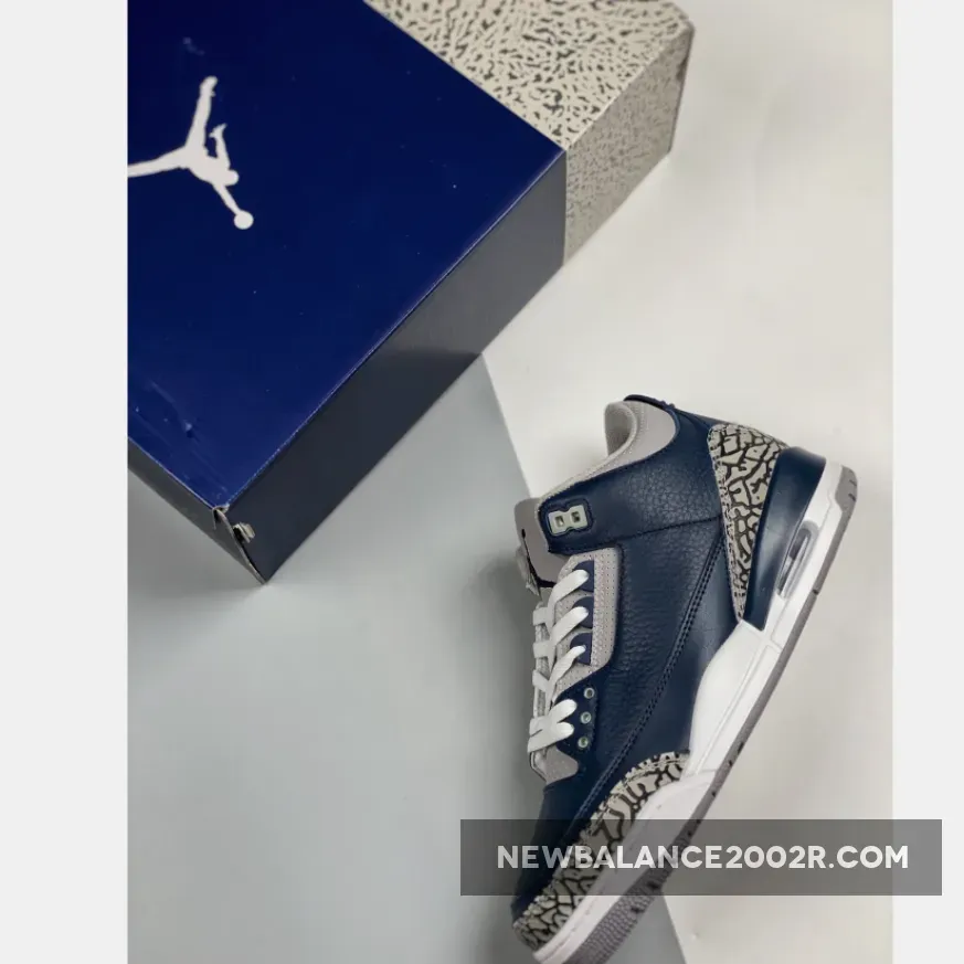 Dressed in a Midnight Navy, Cement Grey, and White color scheme to give off a Georgetown Hoyas vibe. This Air Jordan 3 features a Navy tumbled leather base with Cement Grey overlays atop a White midsole and signature Grey-colored rubber sole.