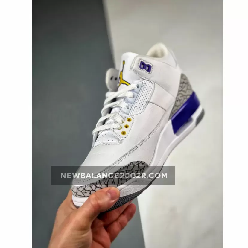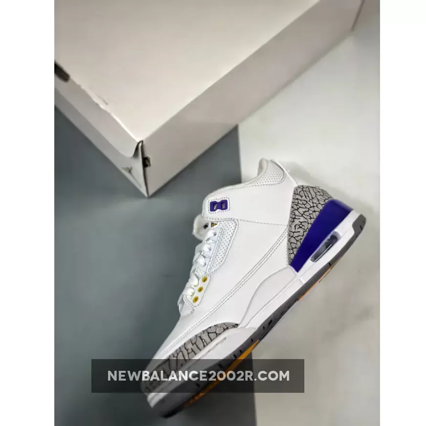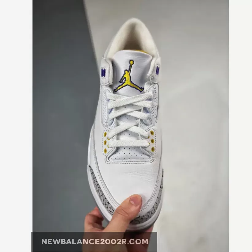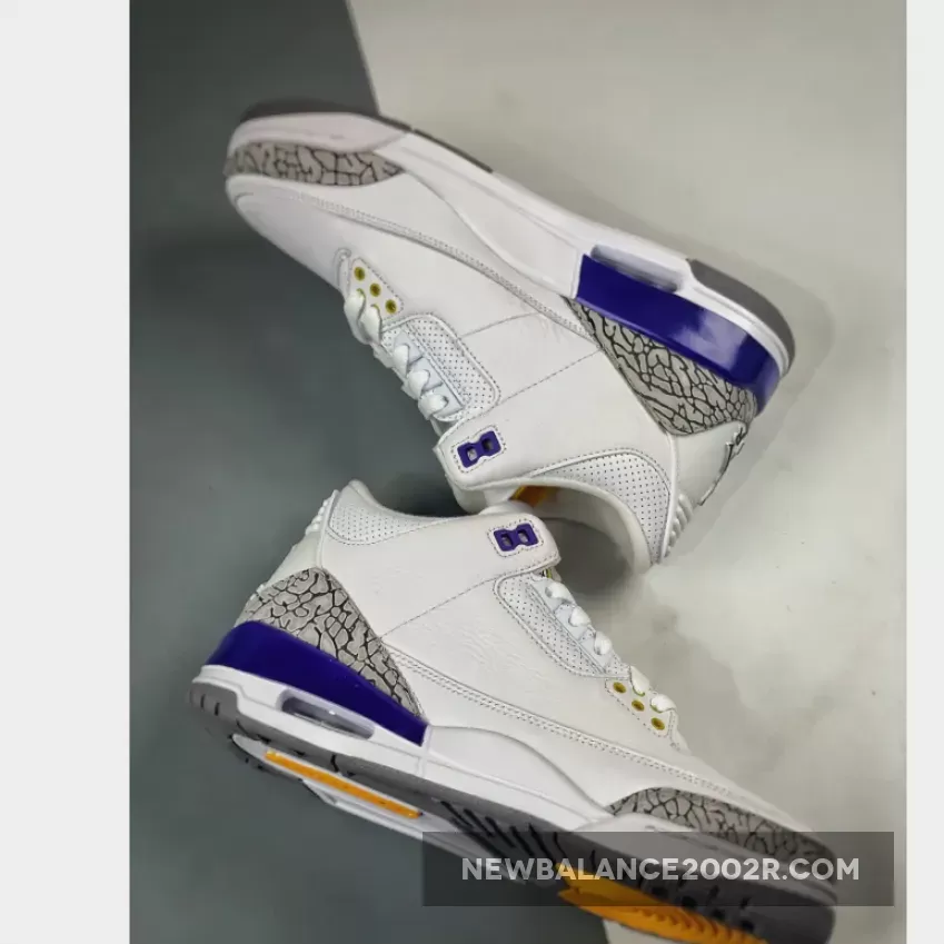 The pair comes with tradition white leather and cement elephant print, but Lakers gold and purple shades hit the heel, Jumpman branding, and lining.
