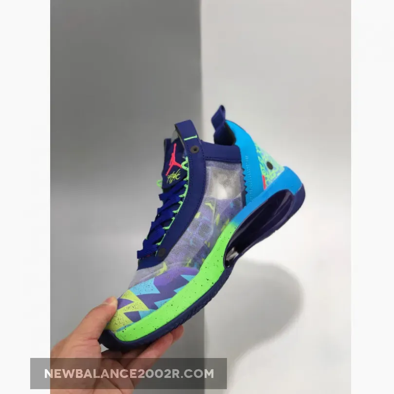 Dressed in a Regency Purple, Rage Green, Persian Violet, and Flash Crimson color scheme. This low-top Air Jordan XXXIV has a vibrant pattern similar to the “Bel-Air” Air Jordan 5 releases that extends onto its rubber outsole.