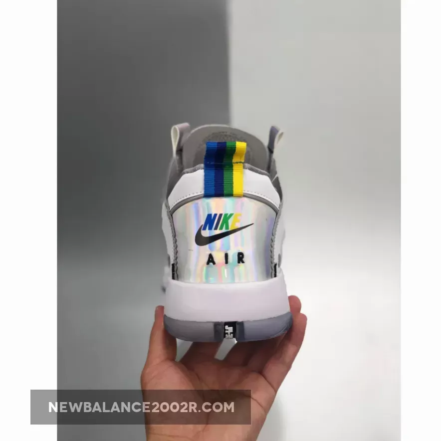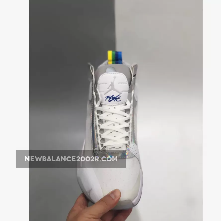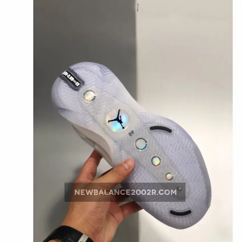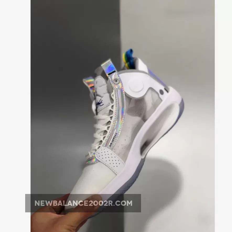 This offering of the Air Jordan XXXIV features a White upper highlighted with iridescent detailing on the lacestay overlay and heels.