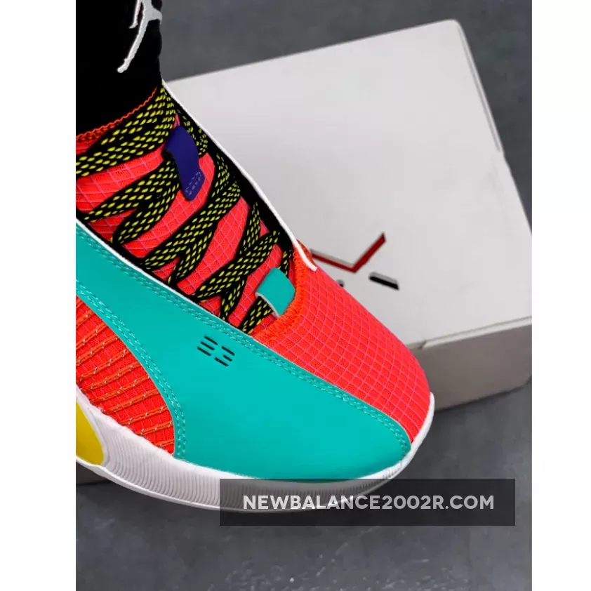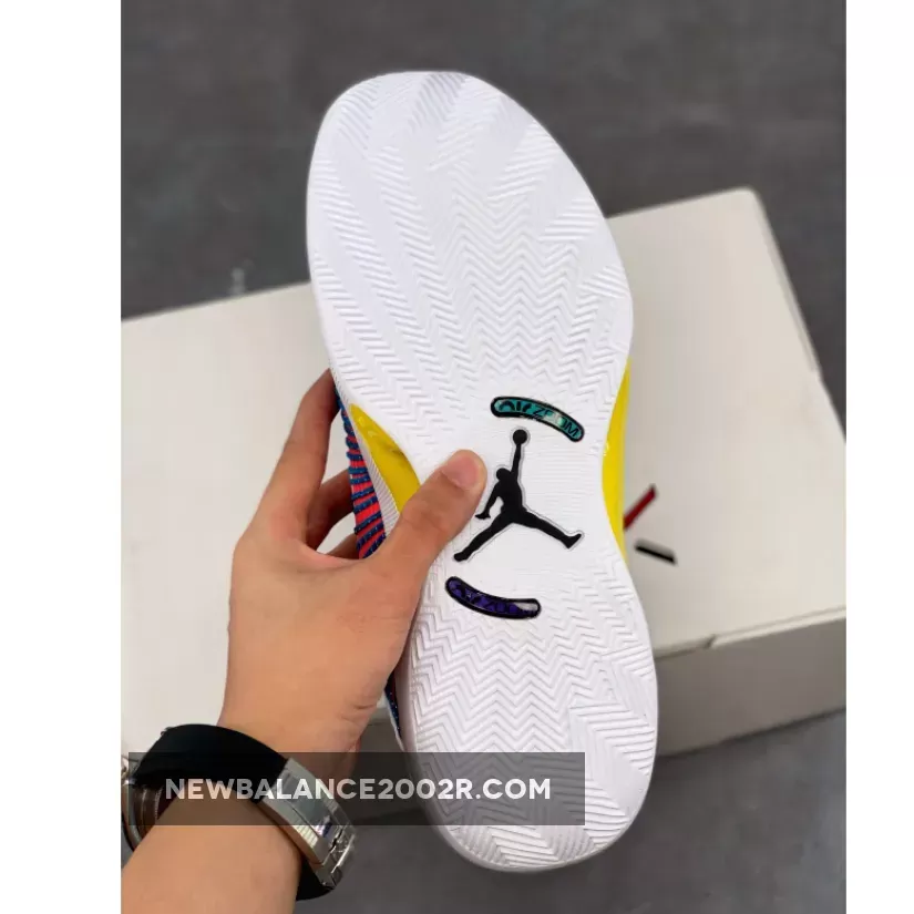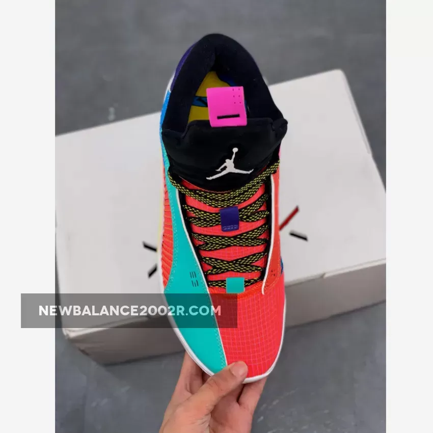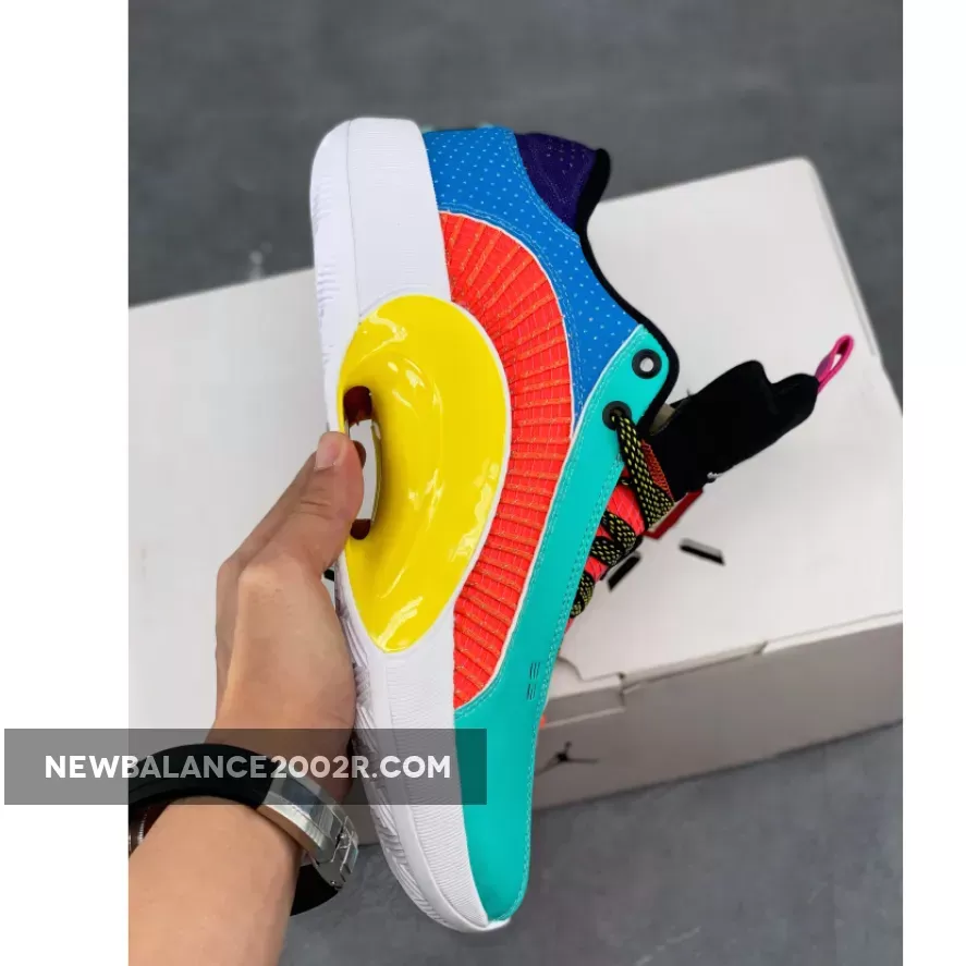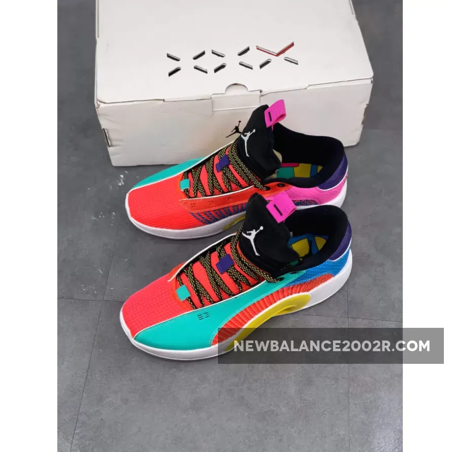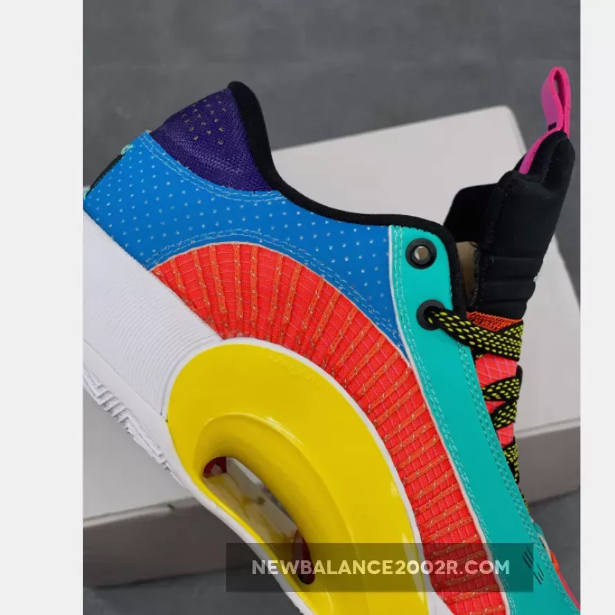 Dressed in a Multi-Color color scheme nodding to the zone therapy color chart. This low-top Air Jordan 35 features a Bright Red mesh base with suede overlays in Aqua and Blue on the lateral, and Orange and Pink on the medial. Other details includes 3M reflective hints, Purple mesh in the rear, Yellow Eclipse plate atop a White rubber sole. Kanji symbols on the heels with vibrant-colored graphic insoles resembling the foot chart completes the design.