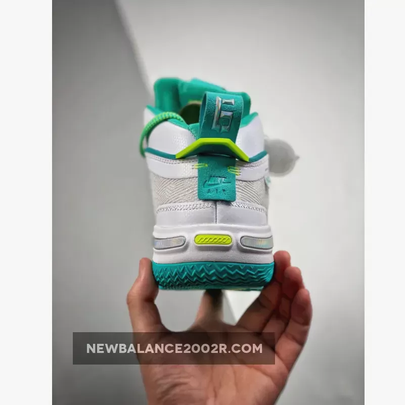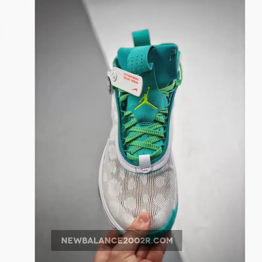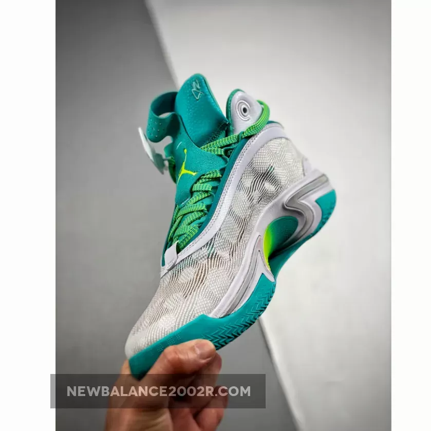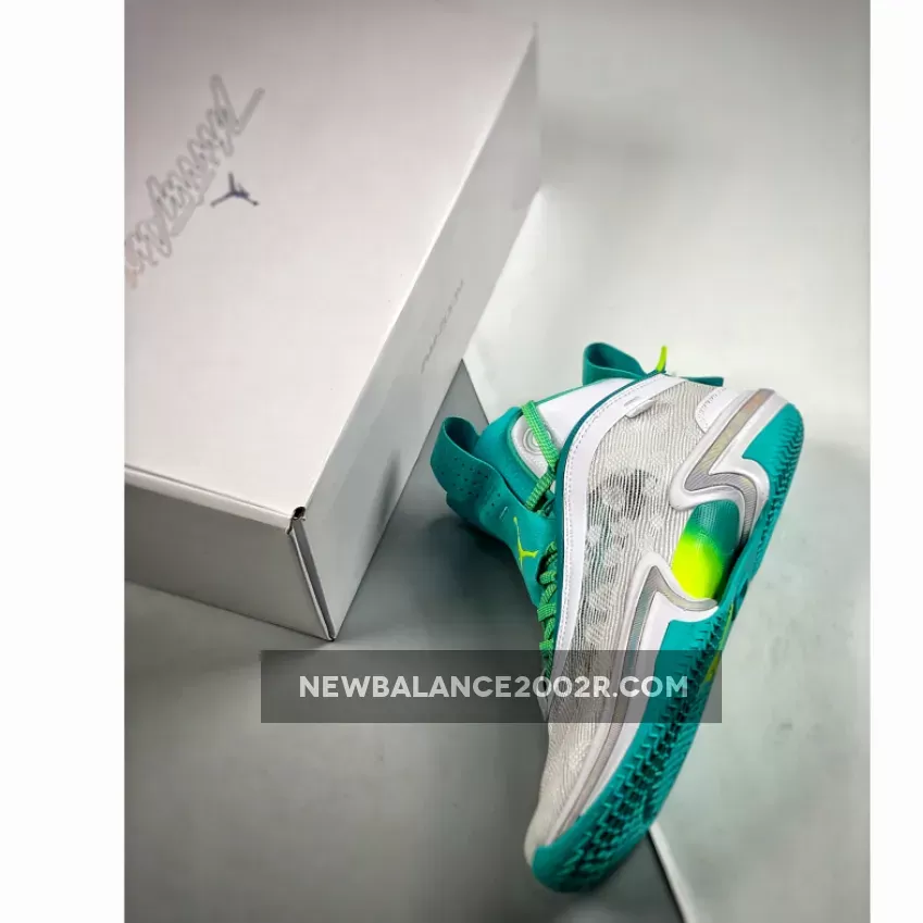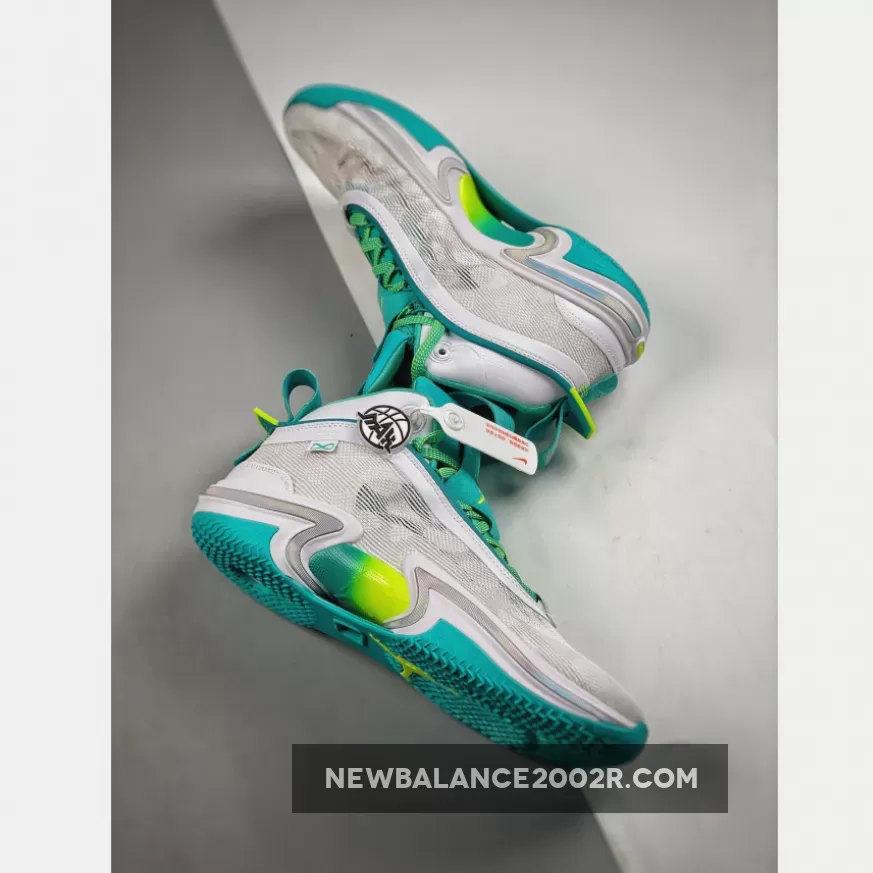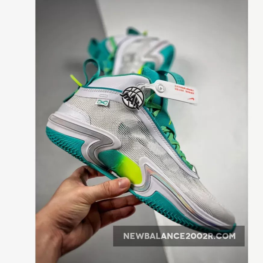 The sneaker uses a white upper that is made of leno-weave which features a spotted pattern with white leather making up the upper half of the sneaker. Mint and Volt accenting is seen throughout, most prominently on the Jumpman on the lace pocket with iridescent striping on the midsole. Guo’s logo is seen on the heel pulltab and the Air Jordan 36 uses a Zoom strobel setup with a metallic teal and volt plate and a mint outsole to finish off the sneaker.