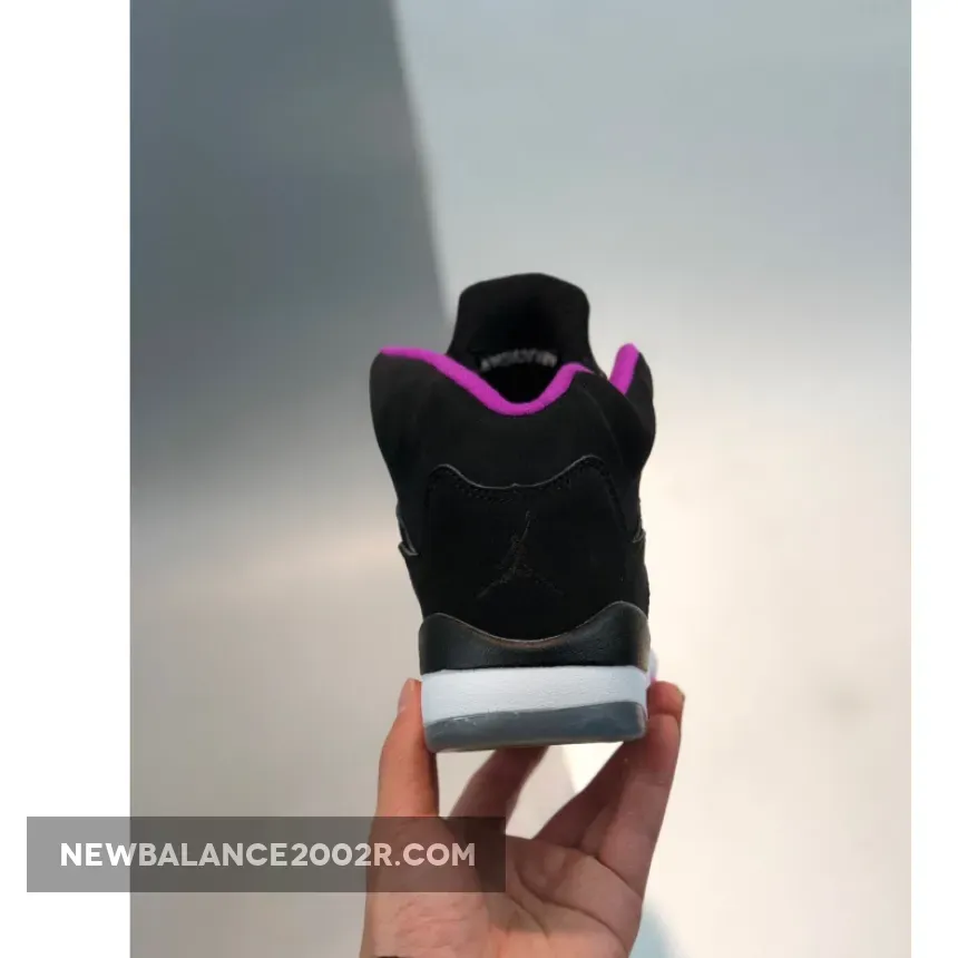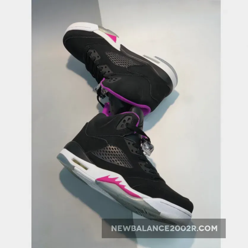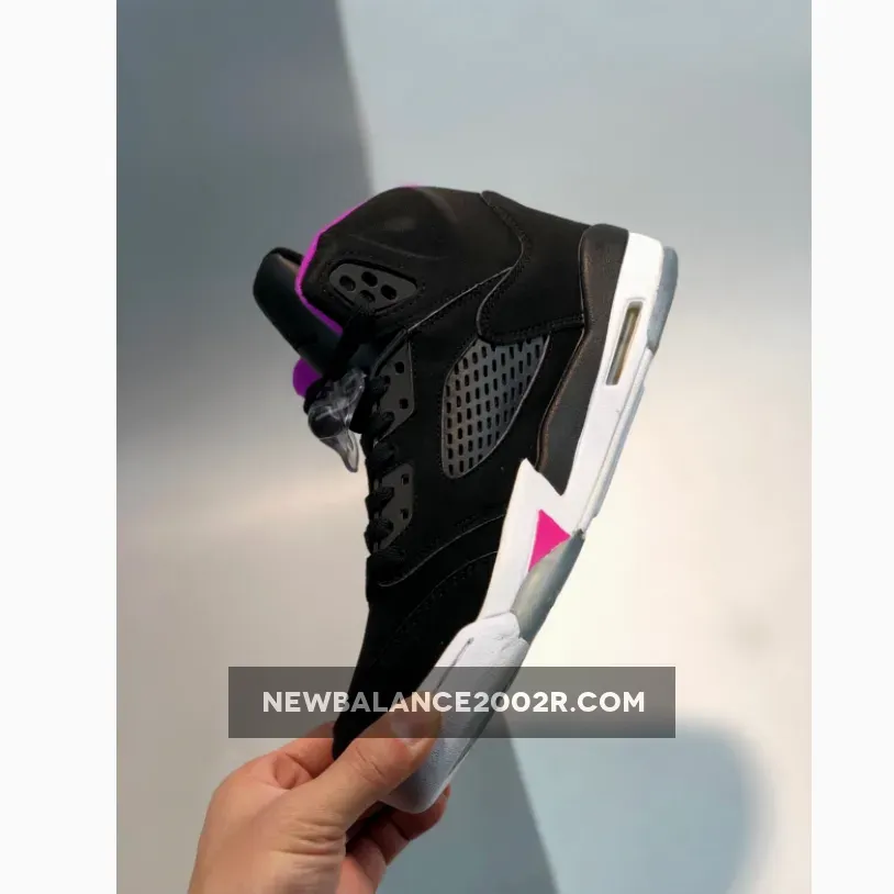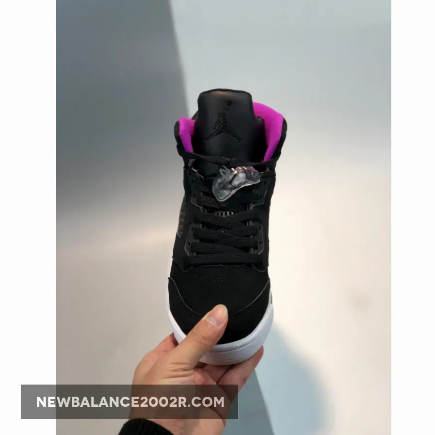 This Air Jordan 5 GS features a full Black nubuck upper with a ribbed textured tongue. Deadly Pink accents is seen on the inner tongue and Shark Teeth overlaying the White midsole. An icy translucent and White outsole completes the design.