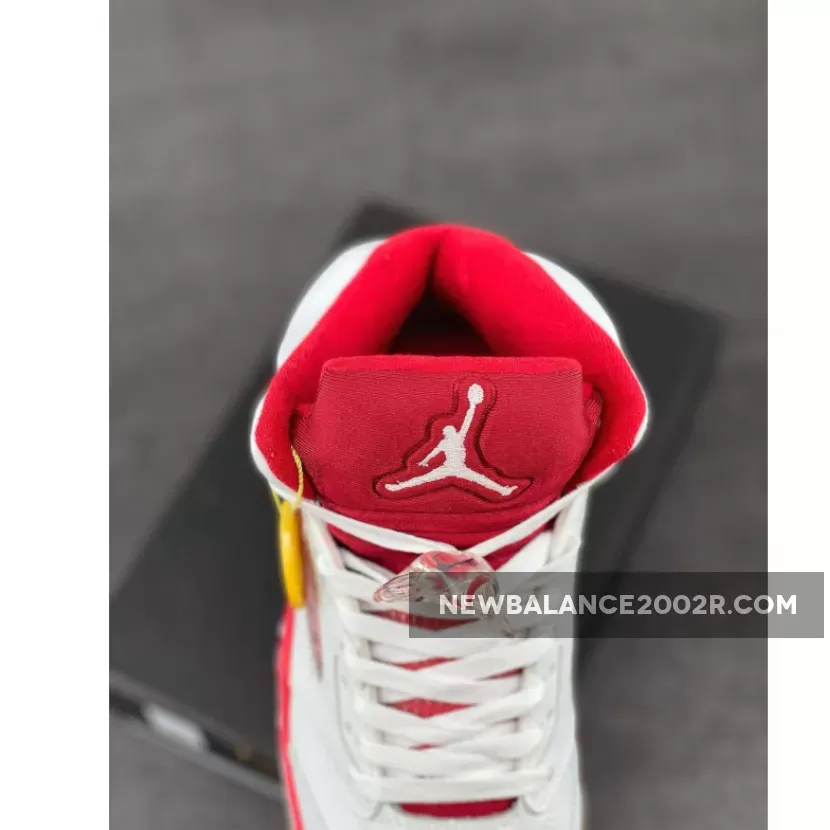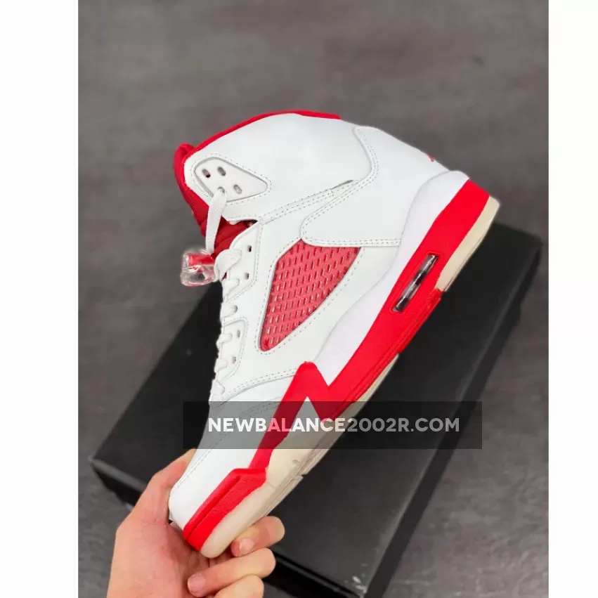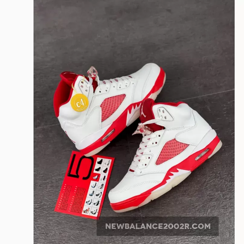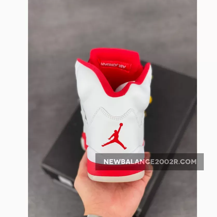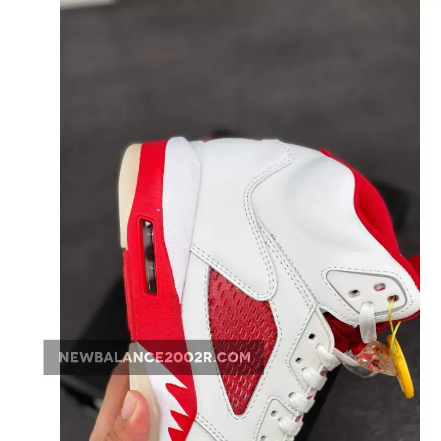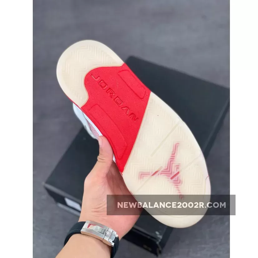 Dressed in a White, Pink Foam, and Gym Red color scheme. This kids Air Jordan 5 features a White leather upper with Pink accents on the netting and midsole. Red detailing throughout atop a milky translucent outsole completes the design.