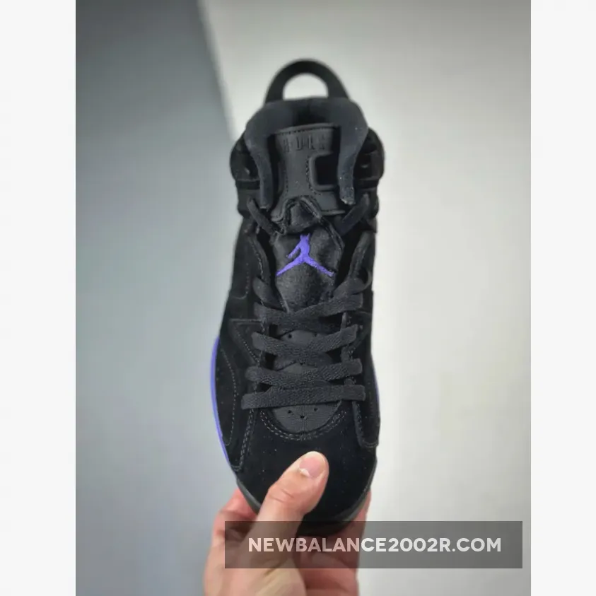 The lower half is where the reference becomes clear, an electric blue and deep purple mixing together on the AJ6’s traditional midsole, foregoing the abstract paint strokes seen on the AJ8 version. Rounding out the final design cues is the black rubber outsole and semi-translucent icy blue rubber near the heel and forefoot.