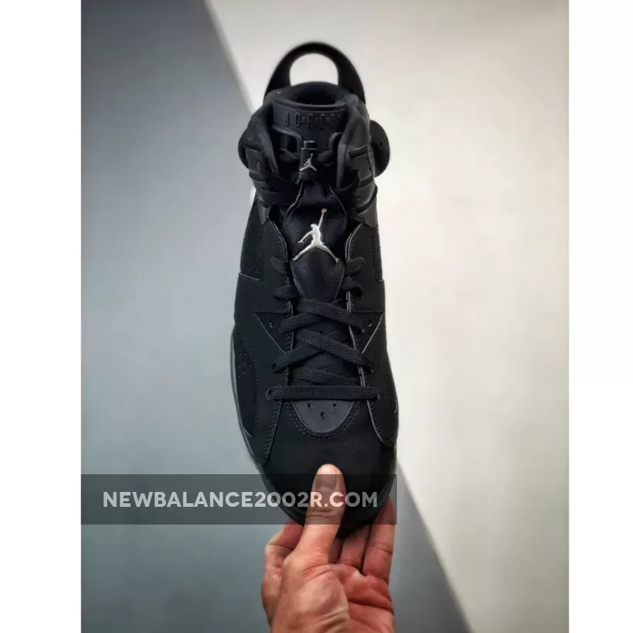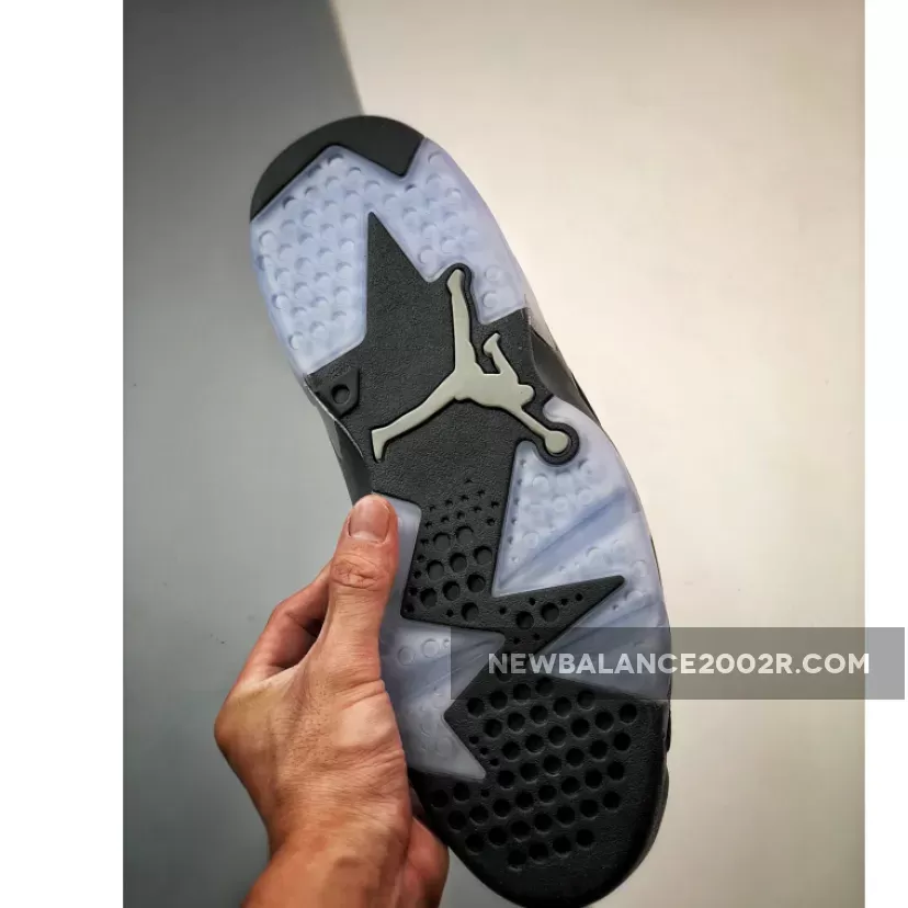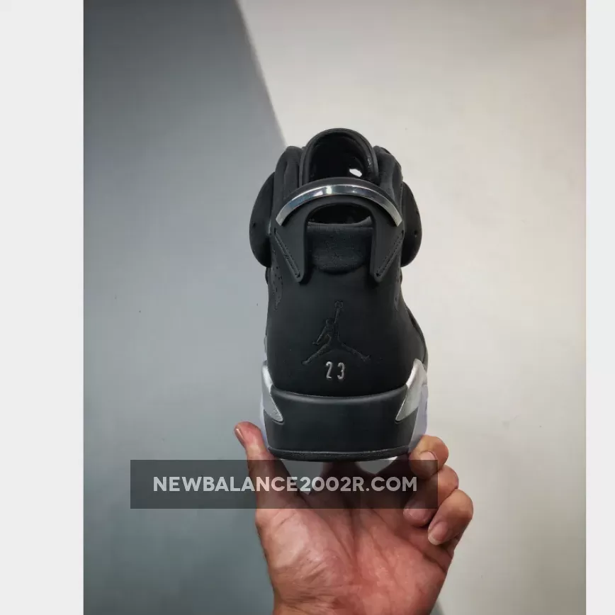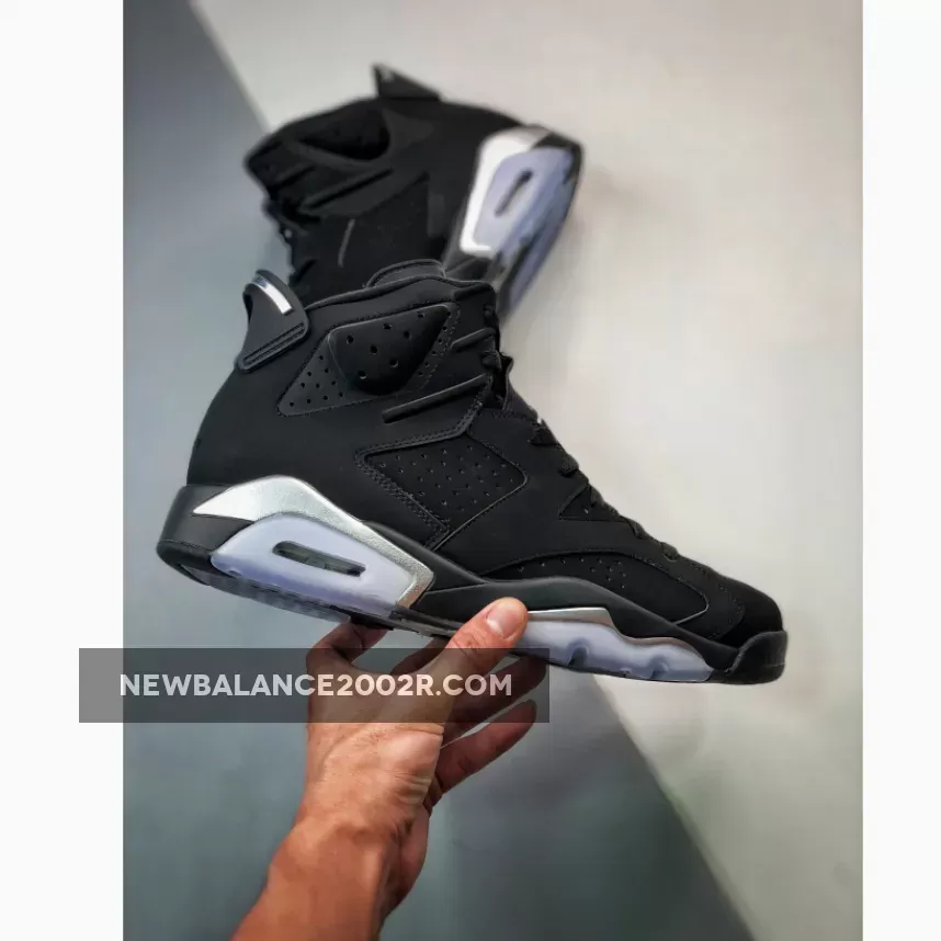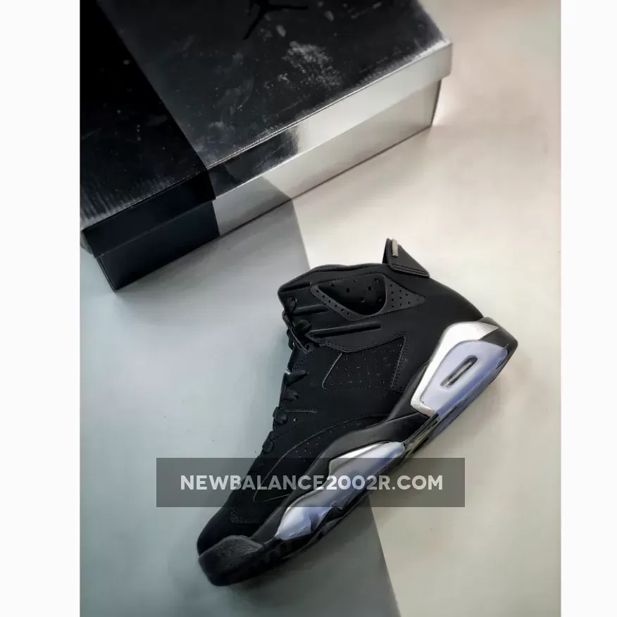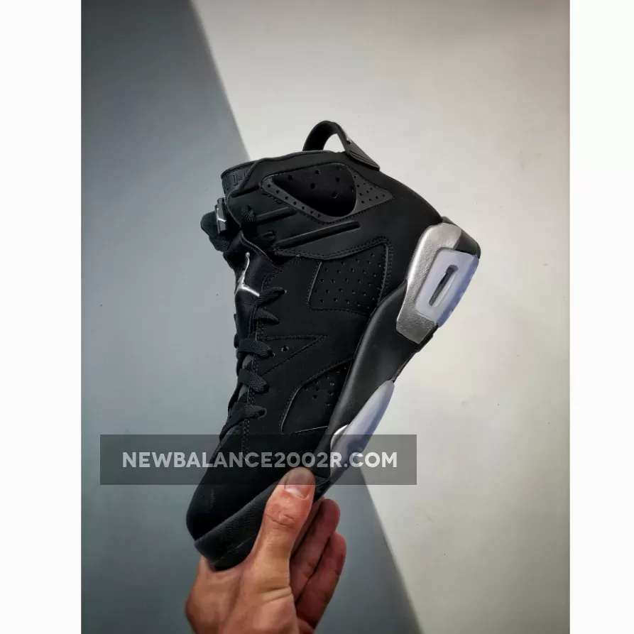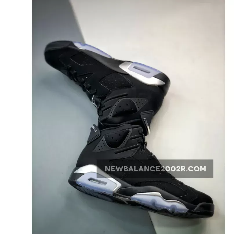 This Retro Air Jordan 6 comes in a black/metallic silver-chrome colorway. The sneaker has a mid-top mounted on a black polyurethane midsole, highlighted with metallic silver accents and supported by a translucent rubber outsole. The shoe has a branding of silver Jumpman on the lace guard. It also has a windowed tongue, lace locks, and a spoiler-like heel tag.