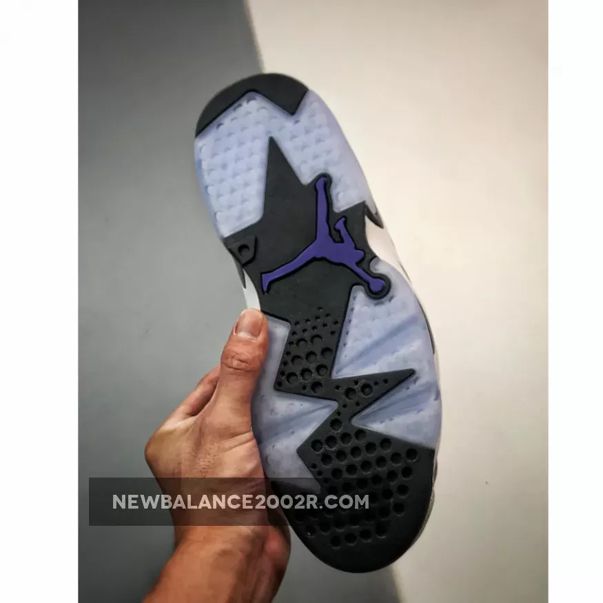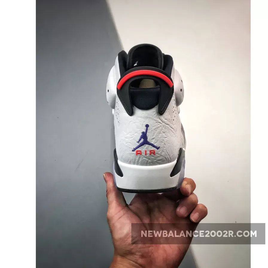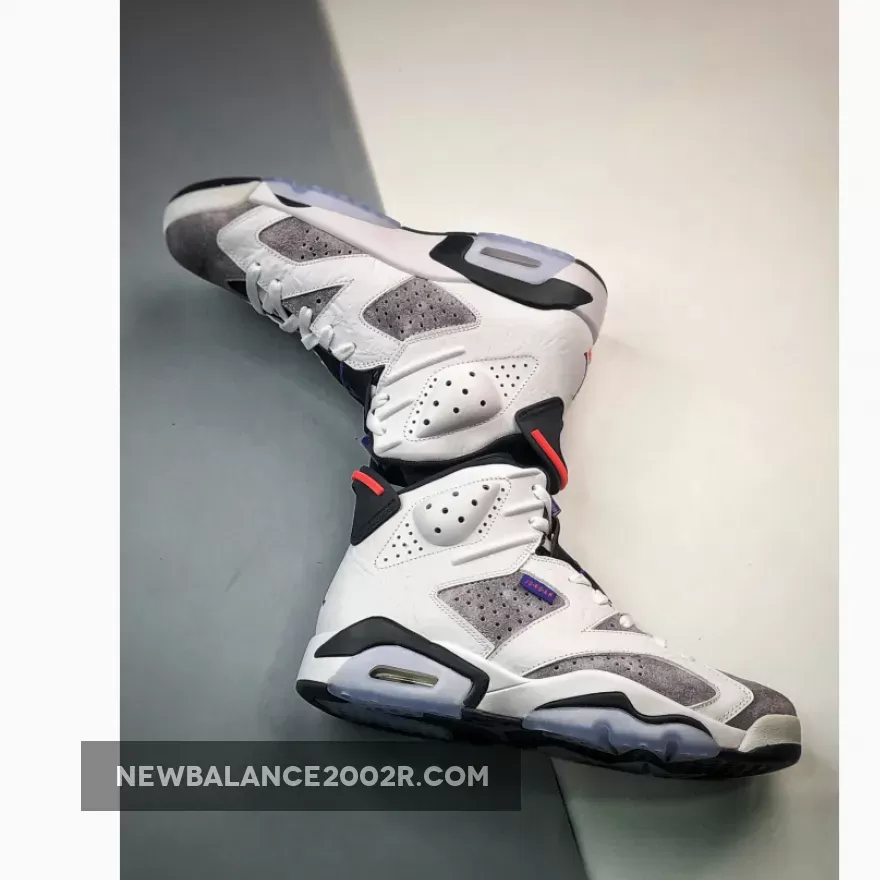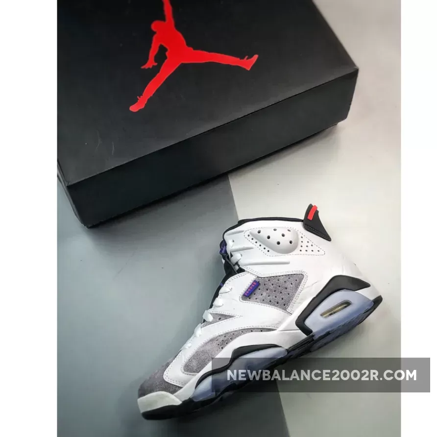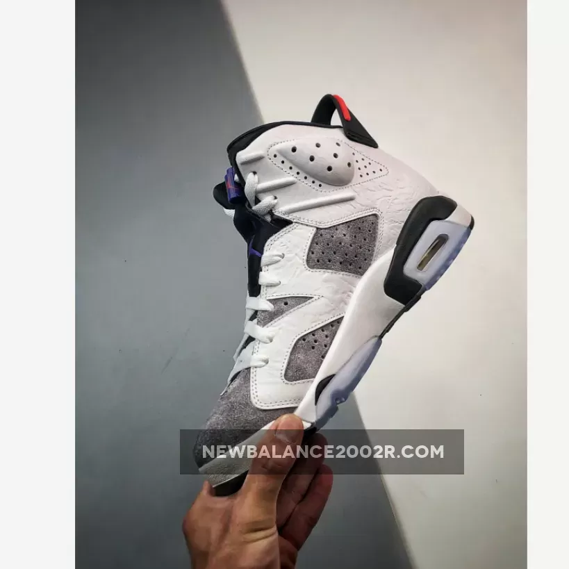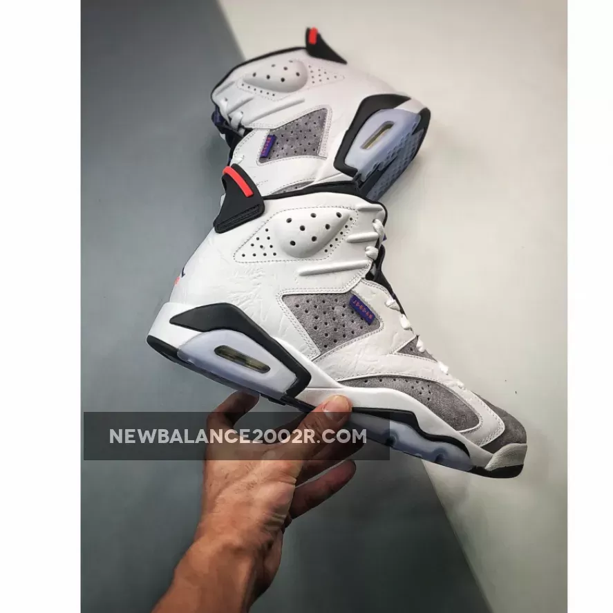 Dressed in a White, Infrared 23, Neutral Grey, White, and Sail color scheme. This Air Jordan 6 features a White leather upper with Grey underlays. Darker tones with Infrared accents atop an icy outsole completes the design.