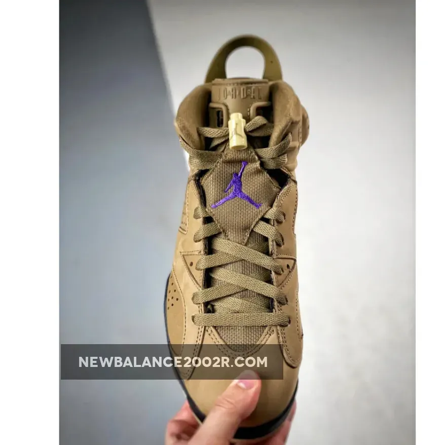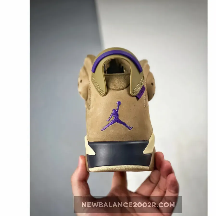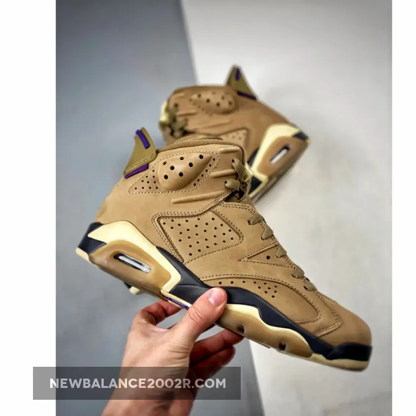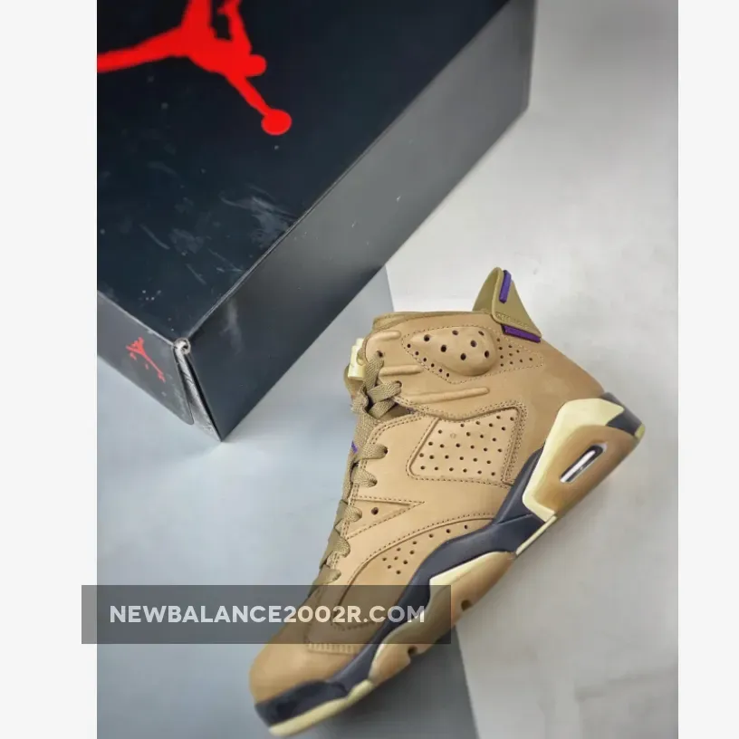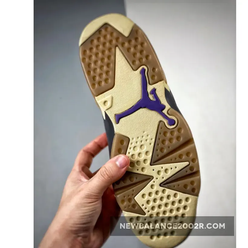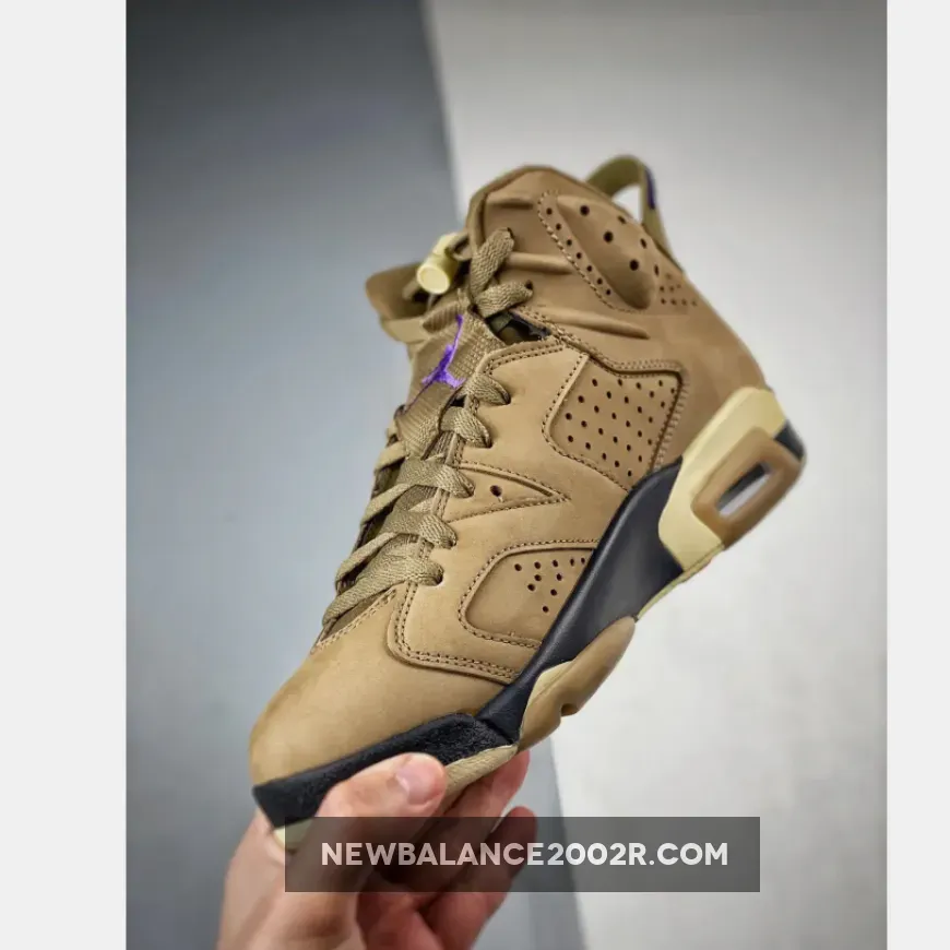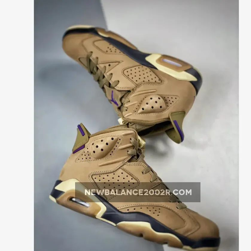 Solid colorway on the Air Jordan 6. Gore-Tex tech makes them ideal for wet weather. The combination of brown and purple accents looks sleek. Overall, a well-designed and functional sneaker that offers both style and performance.
