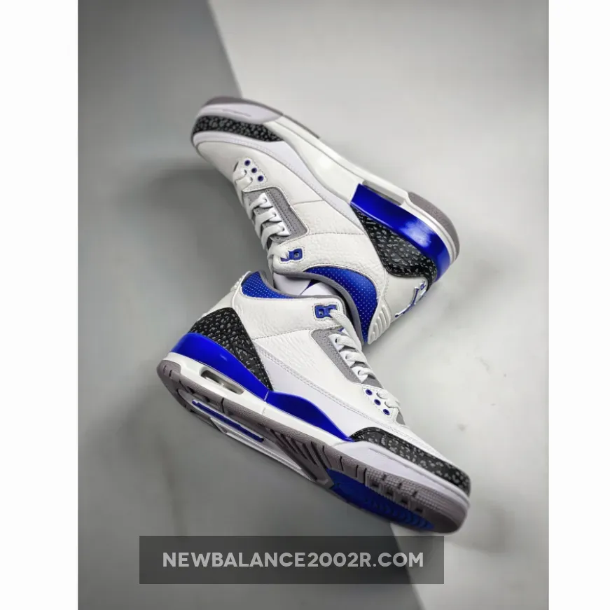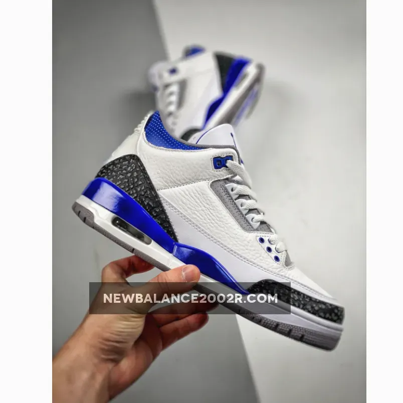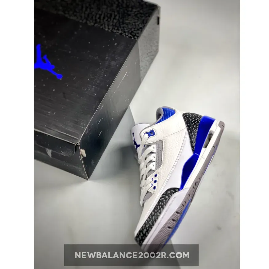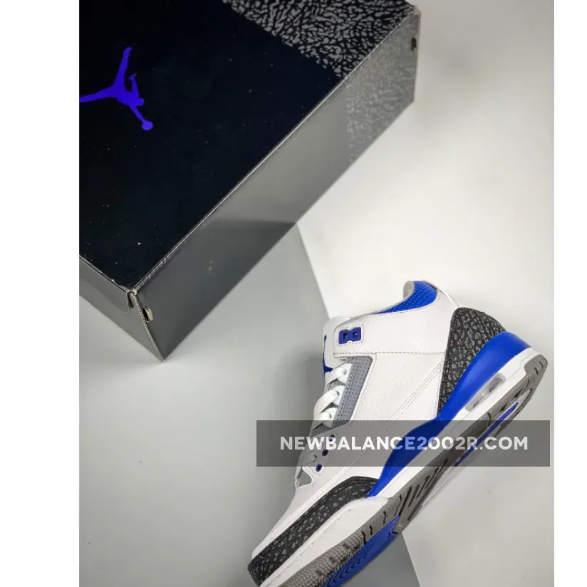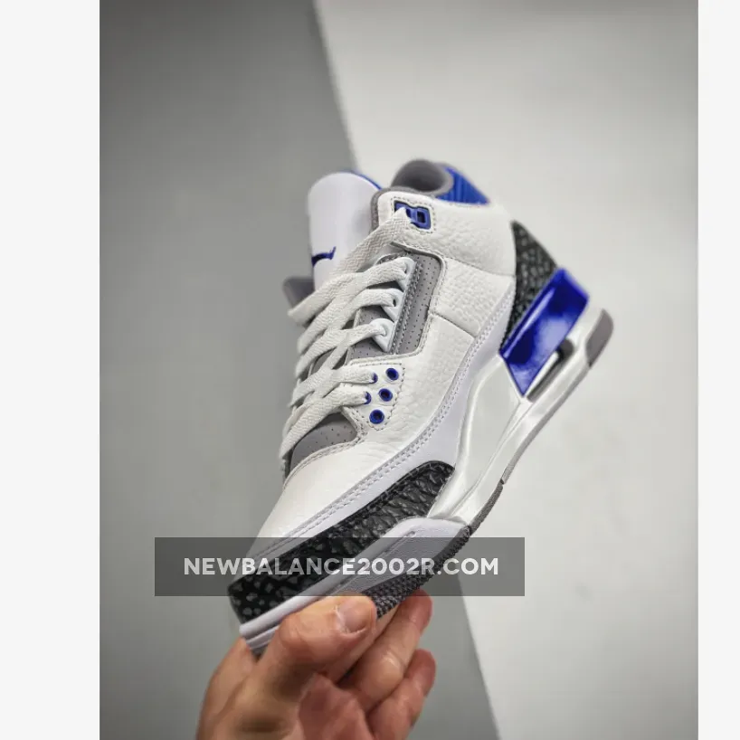 This Air Jordan 3 features a White leather base with Black 3M reflective elephant print overlays highlighted with Blue contrasting accents atop a signature Grey rubber outsole. Tumbled leather base layers and perforated mid-foot and lower throat panels opt to go with the classic white and light gray color-blocking. Reflective cement overlays that land along the toe tips and heels are dialed with dark gray tint, while the eyelets, tongue branding and Jumpman logos on the heels are swathed in the shoe’s titular shade. The midsoles which house an exposed Air unit towards the rear are offset with more “Racer Blue” accents that apply to the molds that rest just above.