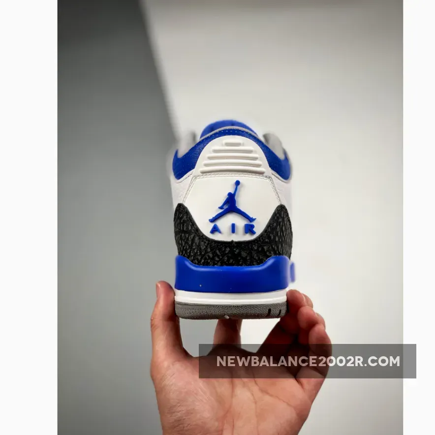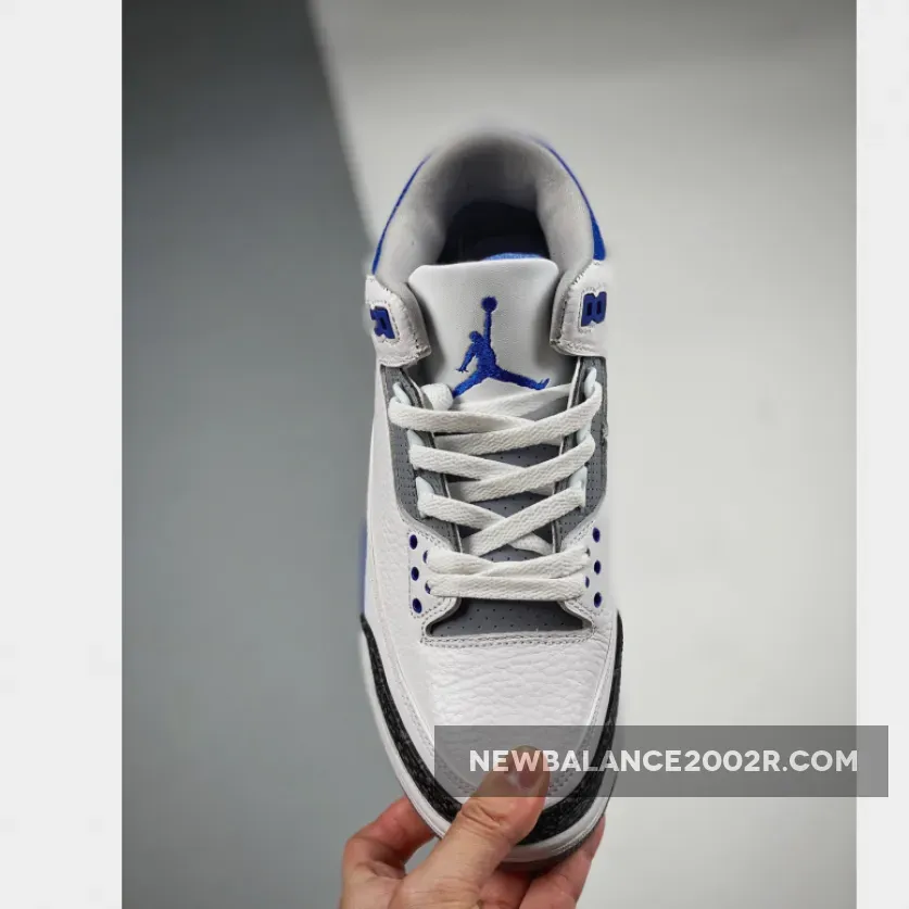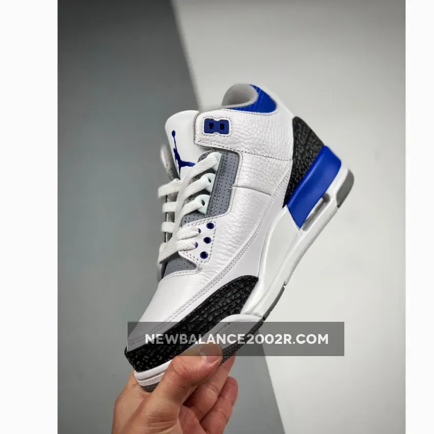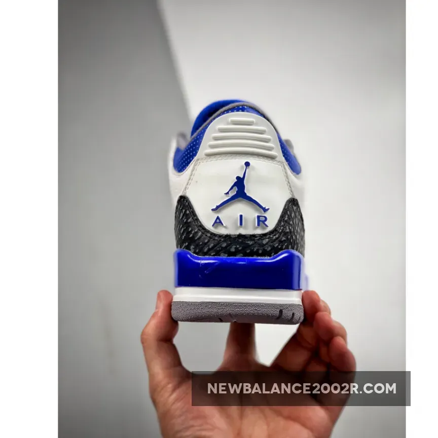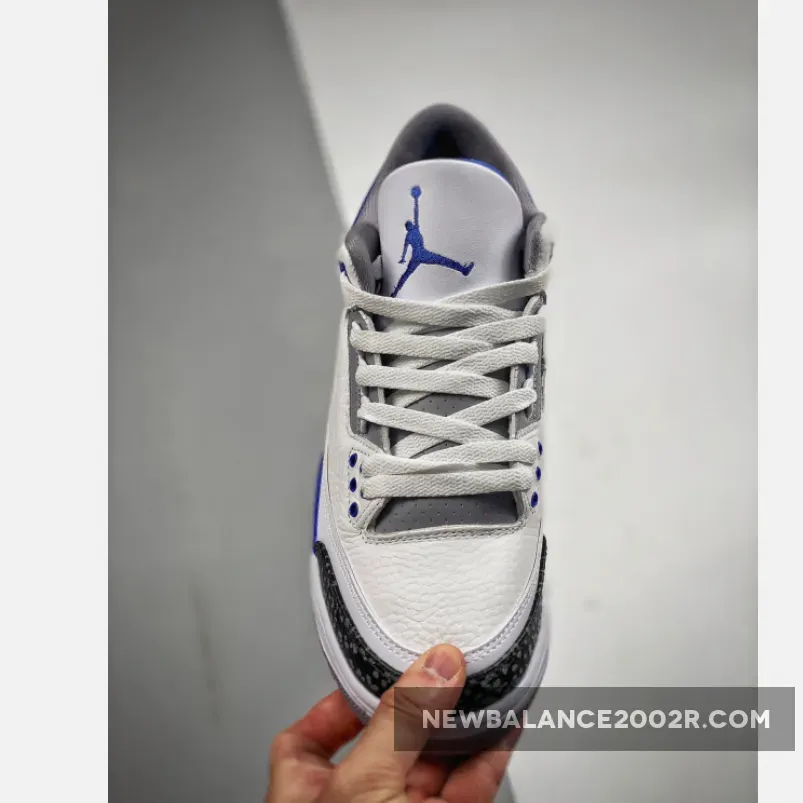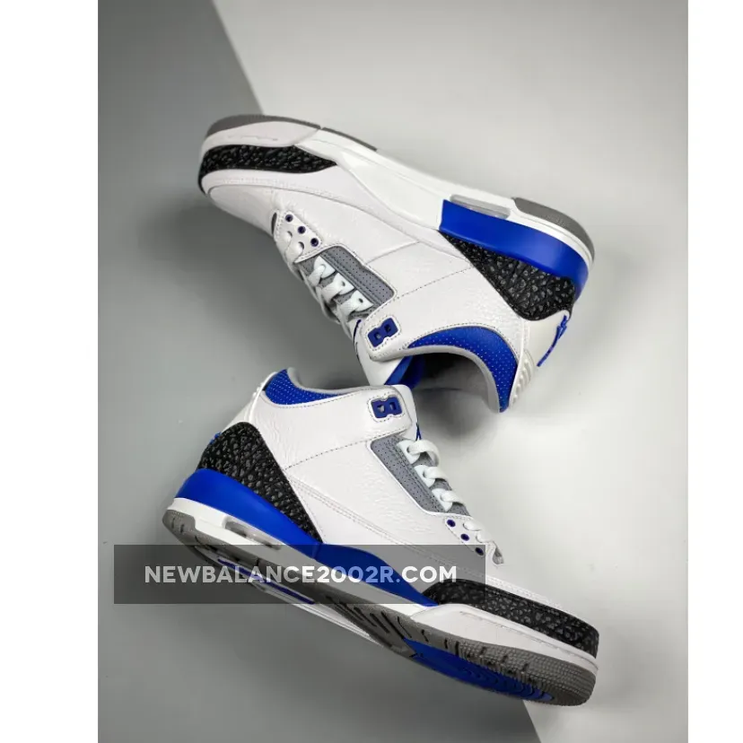 This Air Jordan 3 features a White leather base with Black 3M reflective elephant print overlays highlighted with Blue contrasting accents atop a signature Grey rubber outsole. Tumbled leather base layers and perforated mid-foot and lower throat panels opt to go with the classic white and light gray color-blocking. Reflective cement overlays that land along the toe tips and heels are dialed with dark gray tint, while the eyelets, tongue branding and Jumpman logos on the heels are swathed in the shoe’s titular shade. The midsoles which house an exposed Air unit towards the rear are offset with more “Racer Blue” accents that apply to the molds that rest just above.