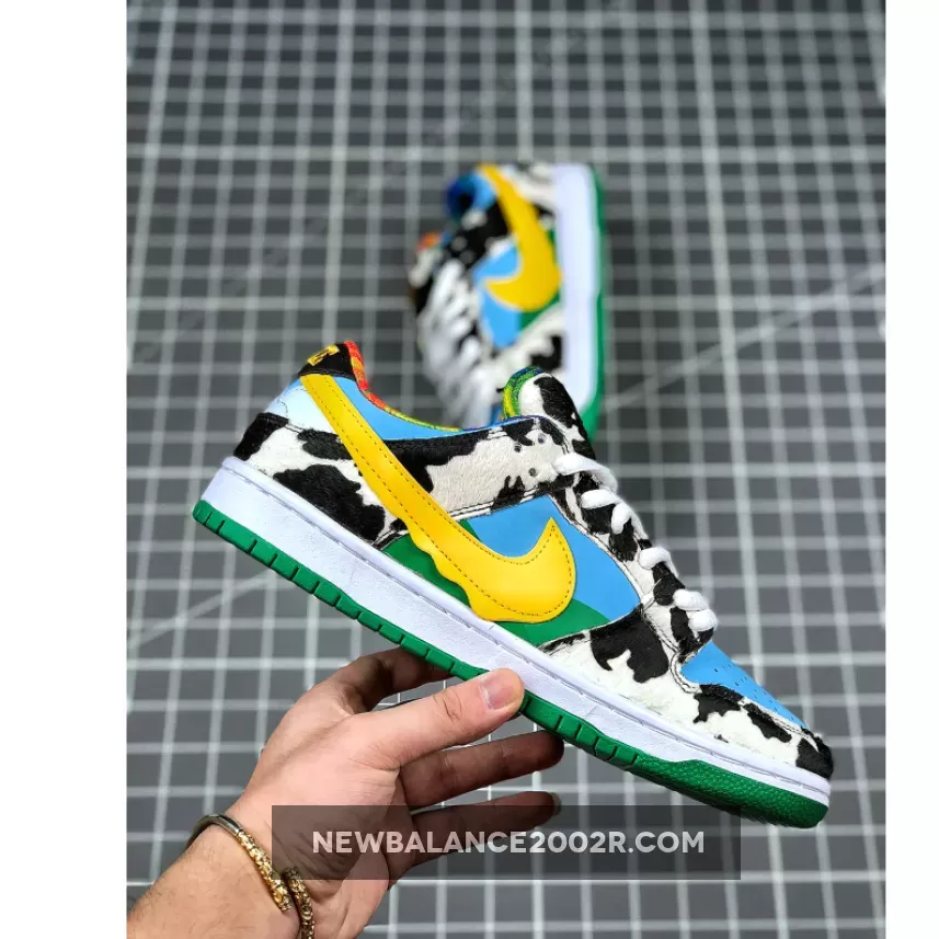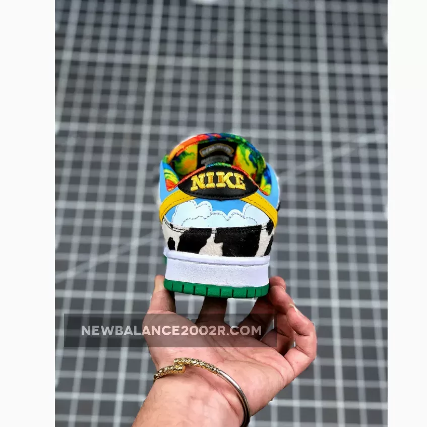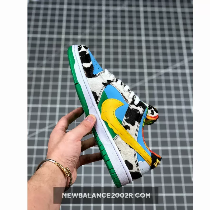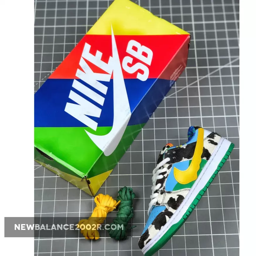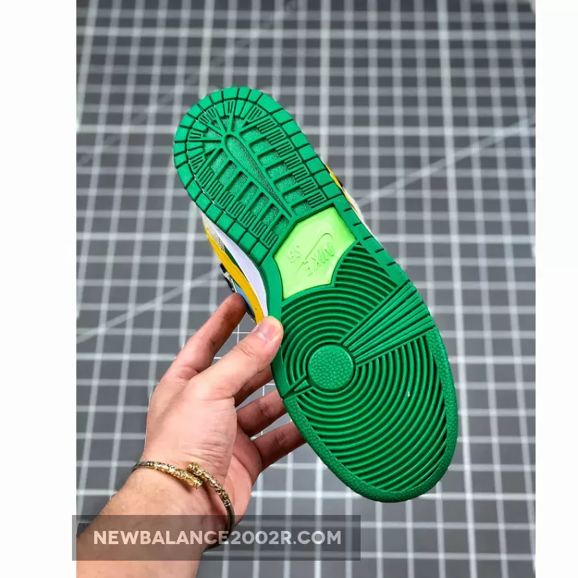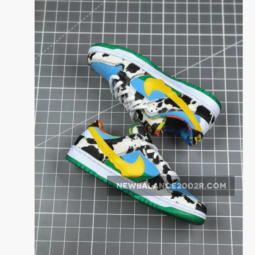 This Nike SB Dunk Low is composed of a cloudy blue sky and green meadow leather upper with faux cowhide on the overlays and tongues. Yellow Swooshes on the side resemble melting ice cream with leather protruding the standard pattern in a drip-like fashion. Tie-dye interiors, Ben & Jerry’s style Nike branding on the heel tab, and a white and green sole completes the design. These sneakers released in May of 2020 and retailed for $100 USD.