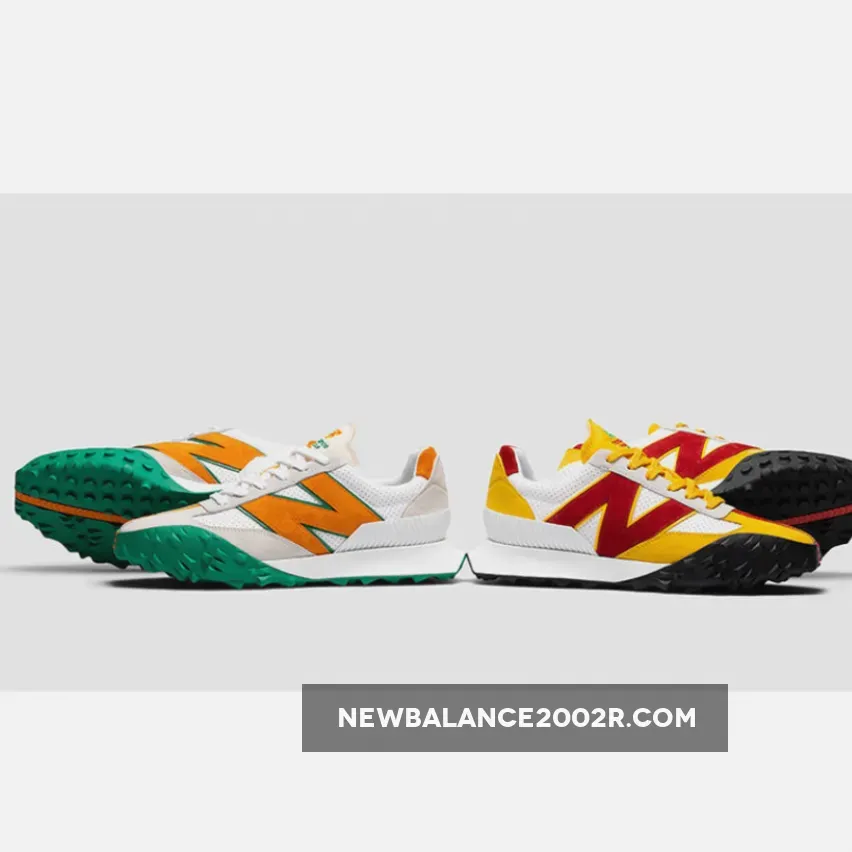 The lead colorway directly references the duo’s original capsule, mirroring its oranges and greens atop just one upper. The warm tone takes the helm along the oversized “N,” while its opposite brings attention to the split-patterned tread underfoot. Elsewhere, cream and white neutrals trade blows adjacent, dressing up the perforated base and suede overlays. In contrast, the accompanying pair leans towards reds and yellows, further drawing from luxury sports cars and their signature racing tires.