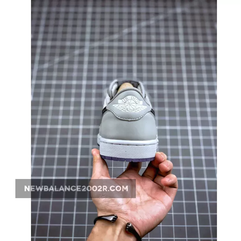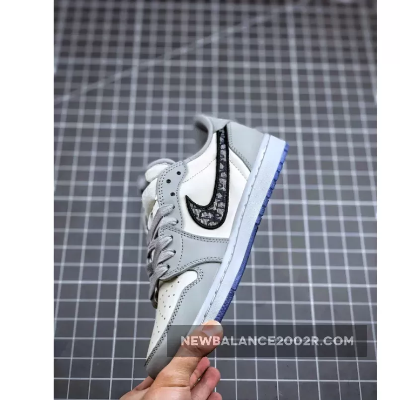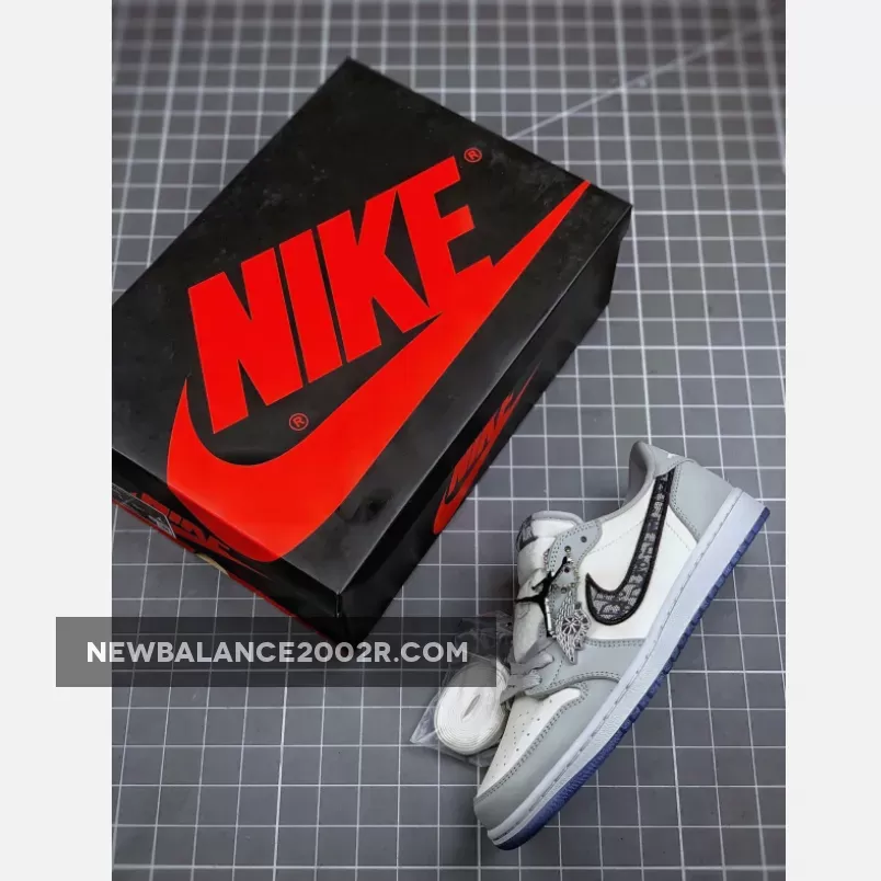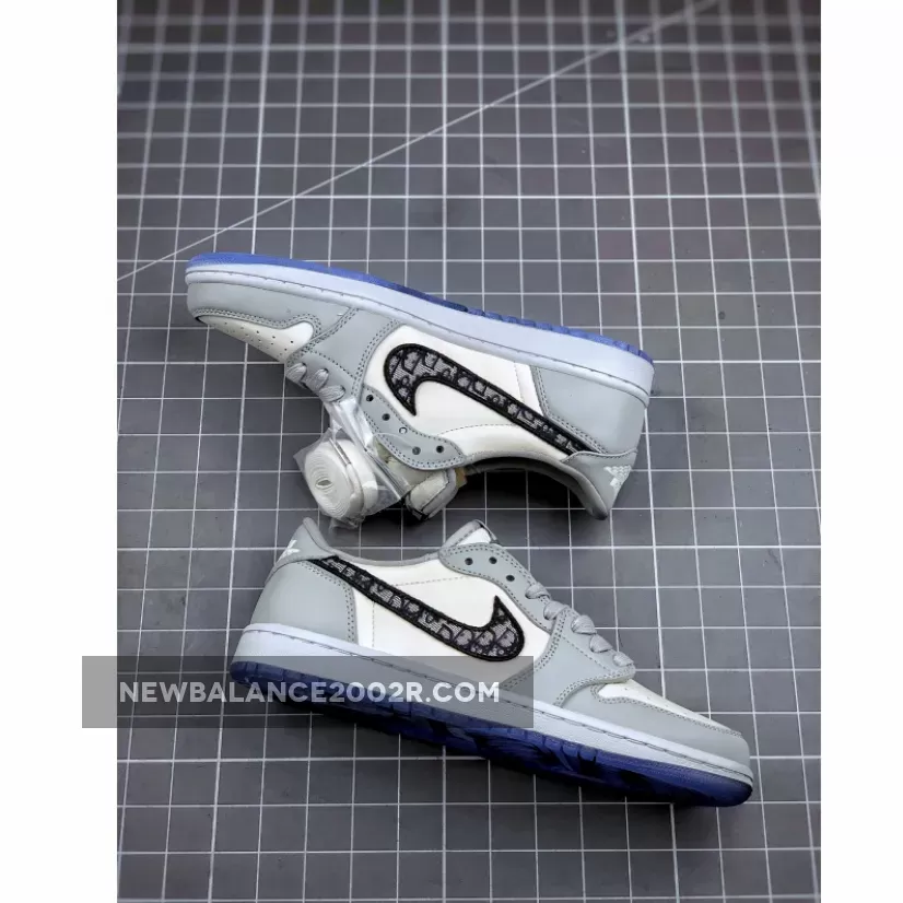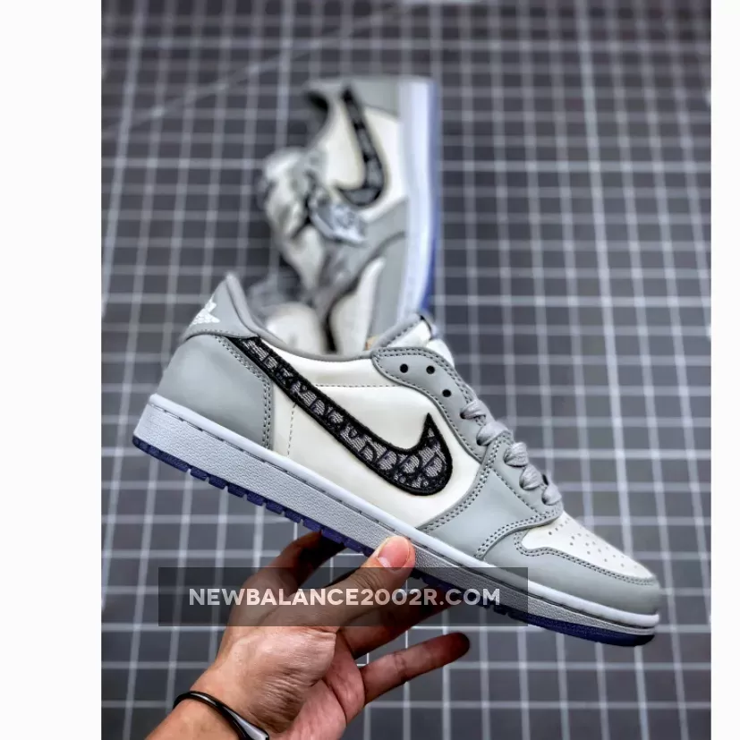 This Dior x Air Jordan 1 Low comes with a similar color blocking and design as the high-top featuring a White and Grey upper with “Air Dior” branding on the tongues and Wings logo on the heel. An all-over printed Swoosh logo on the sides atop a co-branded icy translucent outsole completes the design.
