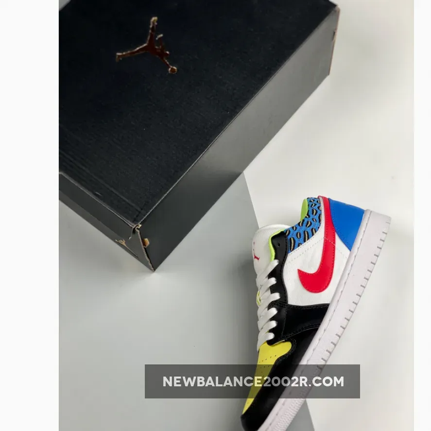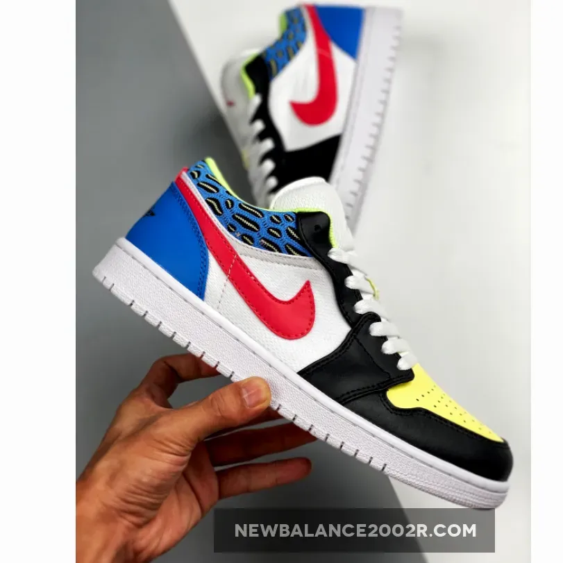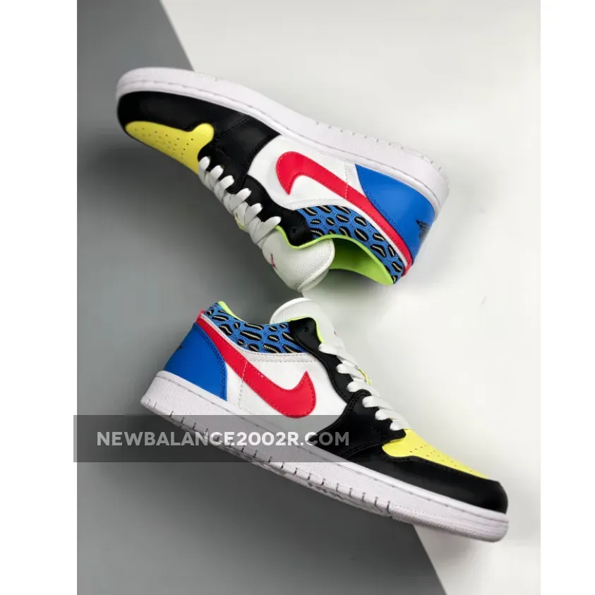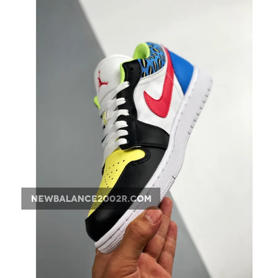 This low-top Air Jordan 1 comes dressed in a Black, Light Fusion Red, White, and Coast color combination. Highlighted with White mesh on the panels and tongue with Lemon Yellow across the toe. Next, Black leather appears on the overlays with Lime Green on the liner and Blue on the heel. Fusion Red hits the Swoosh logos and Jumpman on the tongue with a weave pattern on the collar. Finally, a graphic on the insole and White on the midsole and rubber outsole finishes the look.