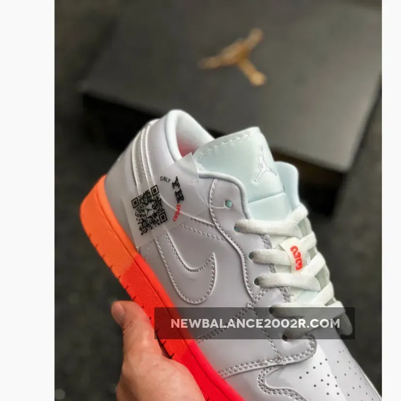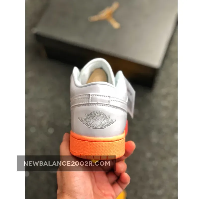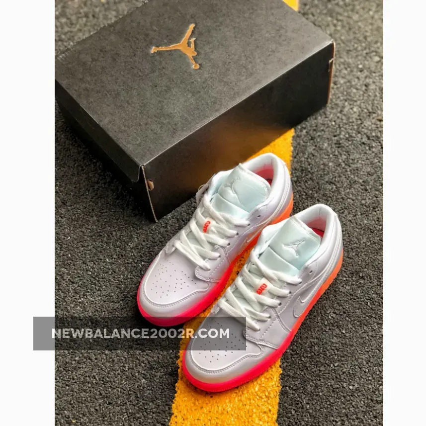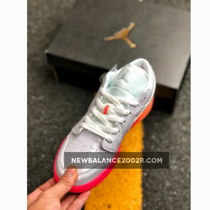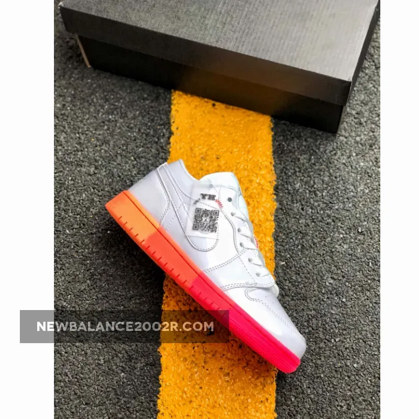 Dressed in a White, Bright Crimson, and Bright Mango color scheme. This low-top Air Jordan 1 features a White leather upper paired with Pink accents on the tongues and insole highlighted with a gradient-like midsole and outsole.