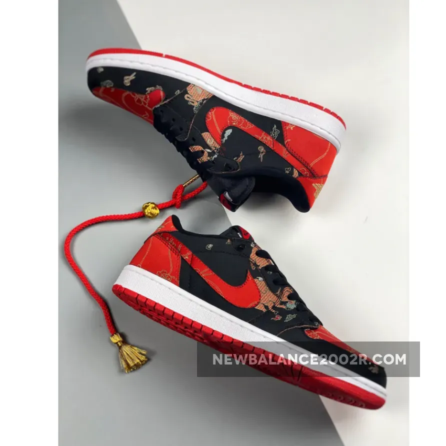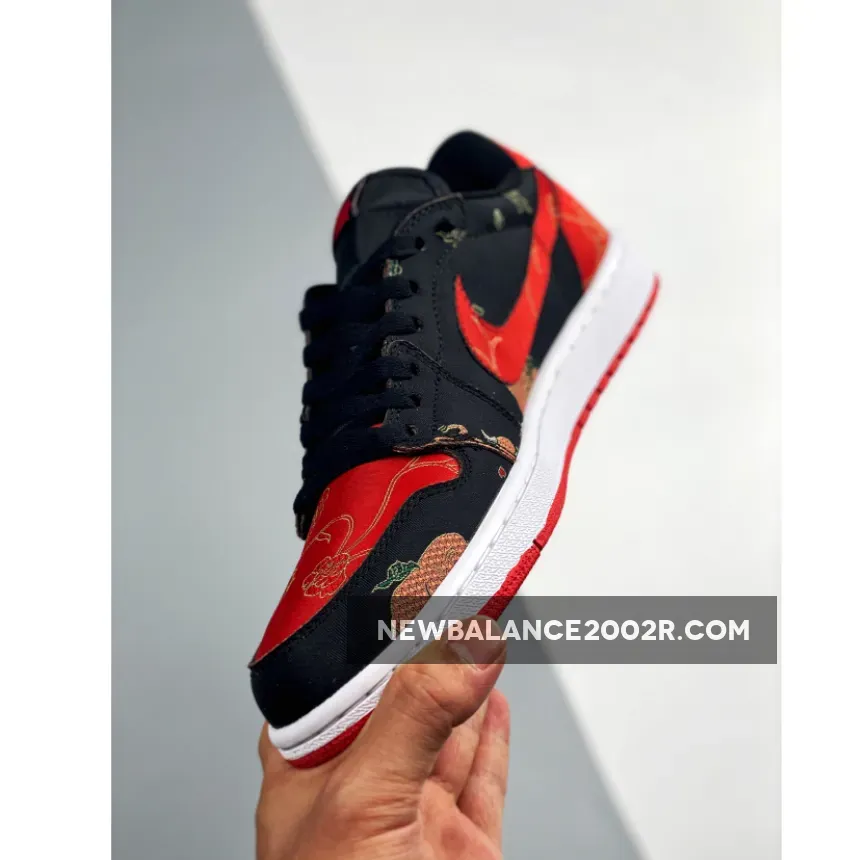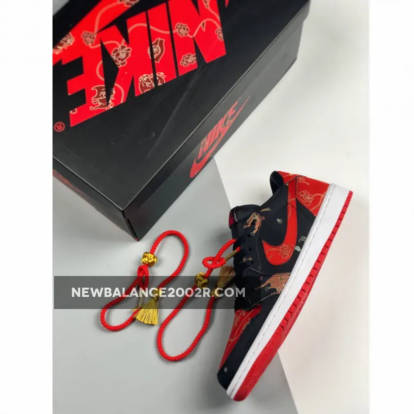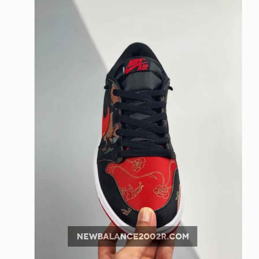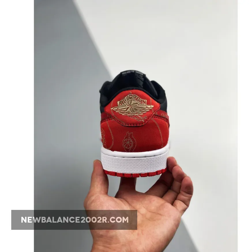 Dressed in a Black, University Red, Metallic Gold, and White color scheme. This Chinese New Year offering of the low-top Air Jordan 1 features a Black and Red canvas upper covered in embroidered Chinese graphics that includes multiple depictions of an Ox (the current zodiac of the year). “Nike Air” is branded on the Black mesh tongues and Red-colored insoles along with Gold embroidered “Wings” heel logos. Red lacing around the ankle collar with Gold Jumpman tips and hanging tassel atop a White midsole and Red rubber outsole completes the design.