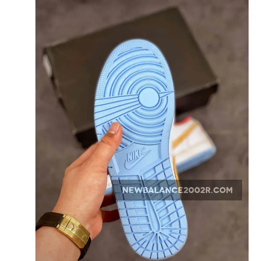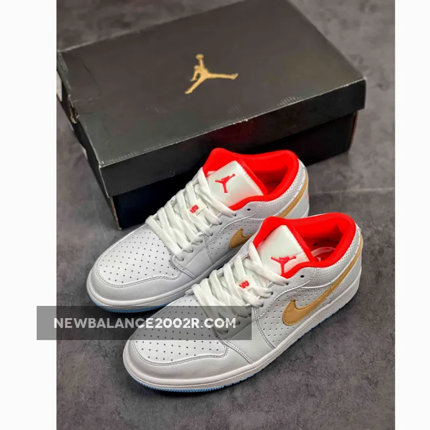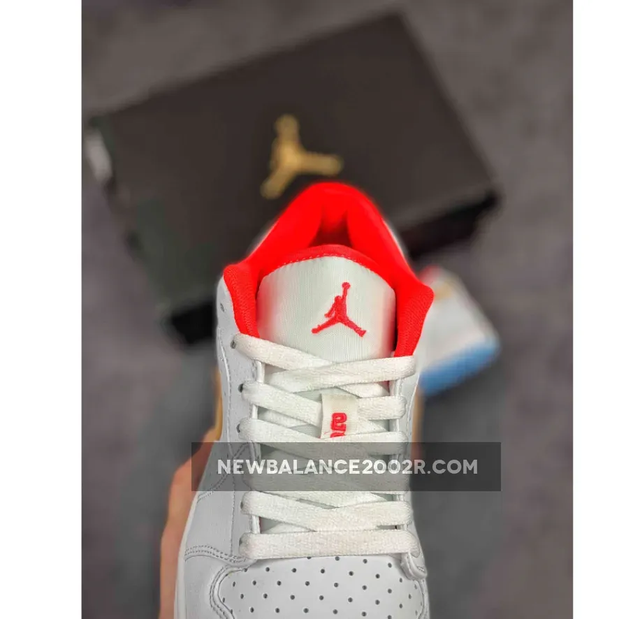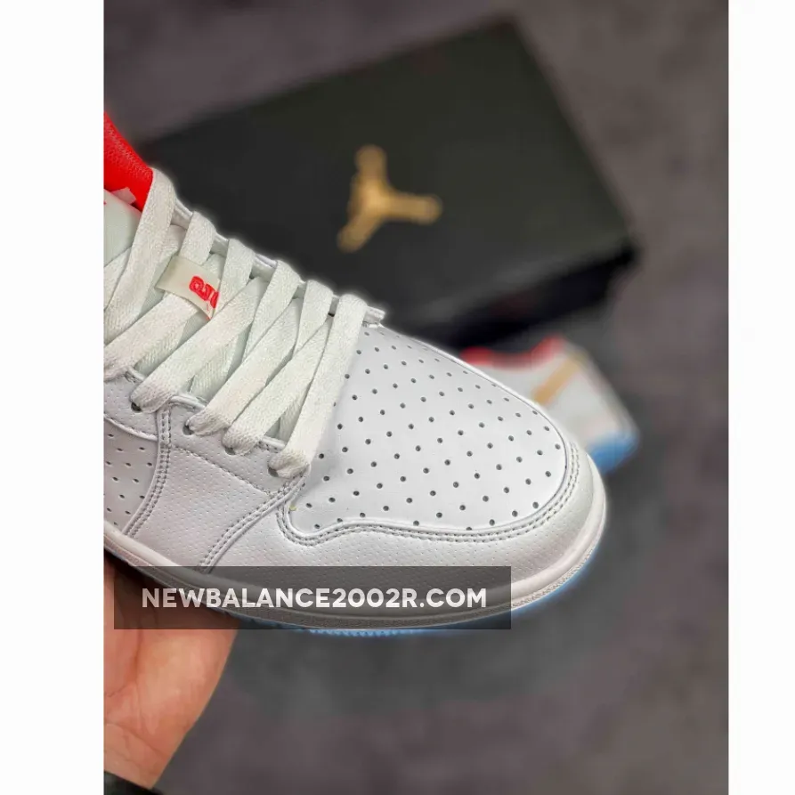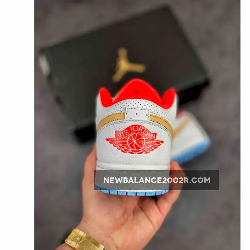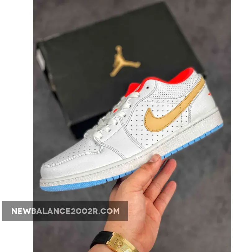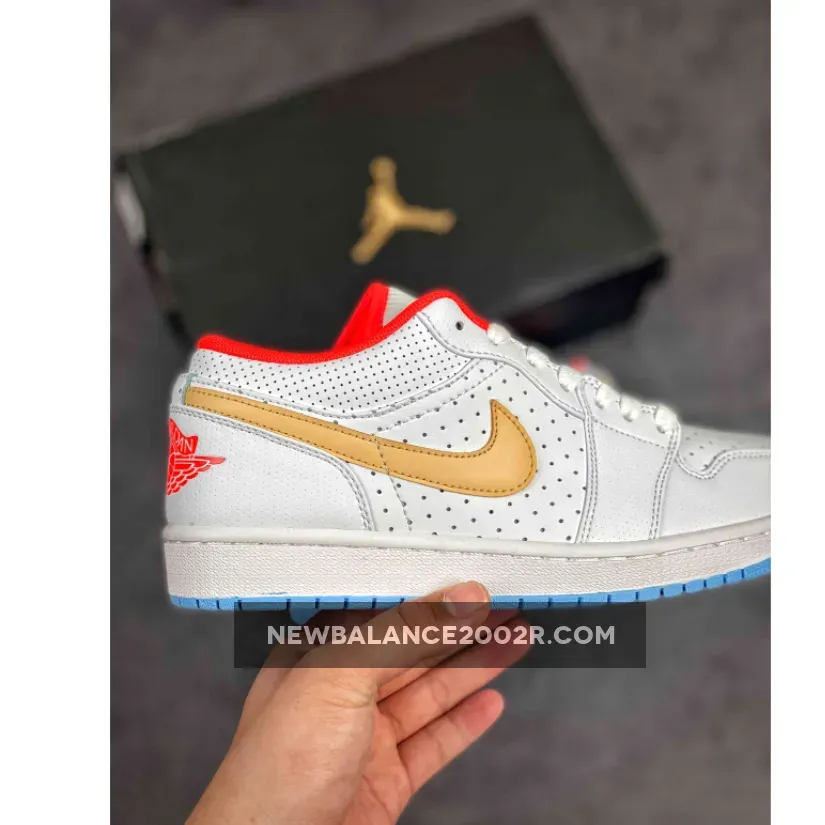Dressed in a White, Sesame, Flash Crimson, and Psychic Blue color scheme. This low-top Air Jordan 1 features a full White perforated leather upper with Sesame leather Swooshes, Crimson inner lining, tongue and heel branding completed with a Light Blue rubber outsole.
