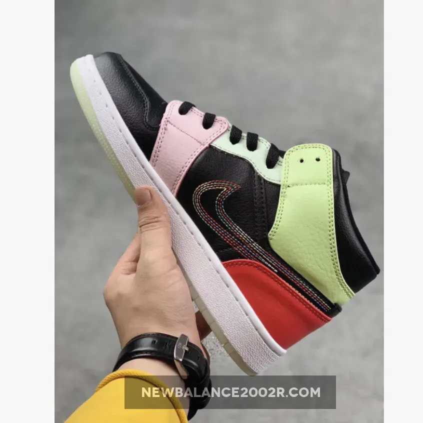 This offering features a Black leather upper with pastel Pink, fluorescent Yellow and Crimson overlays. A stitched Swoosh logo on the sides atop a White midsole and glow-in-the-dark rubber outsole completes the design.