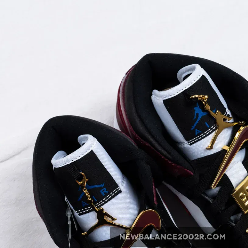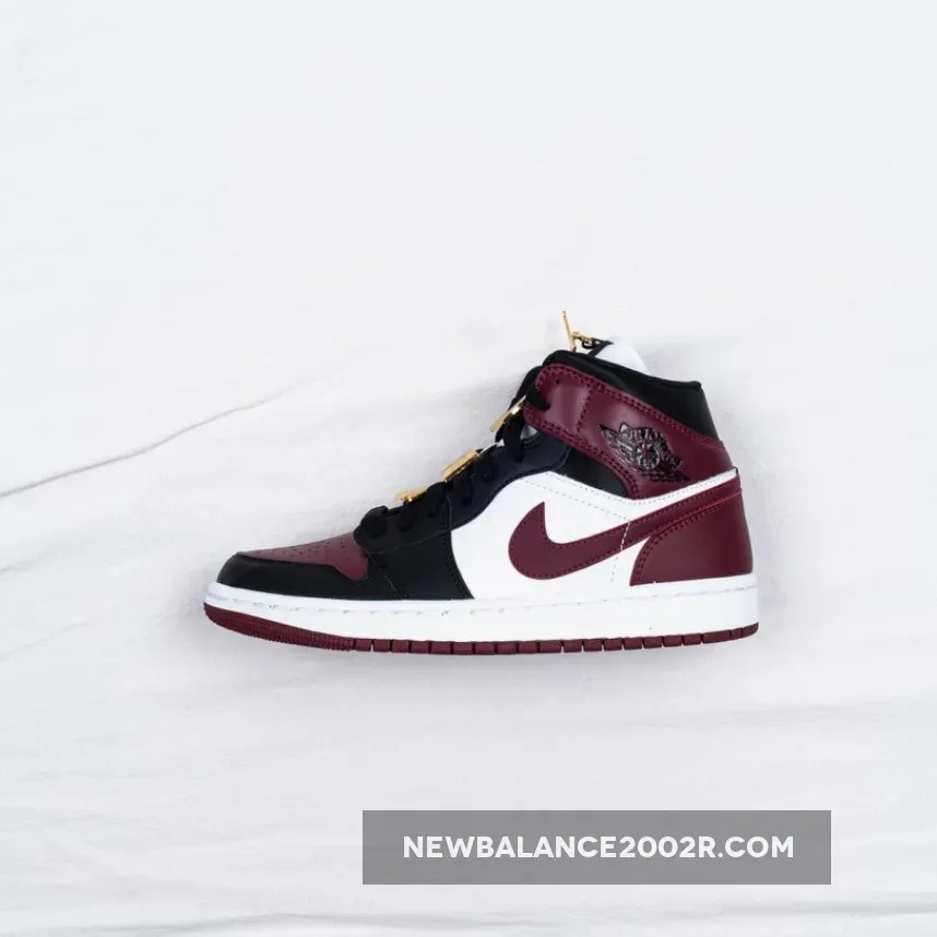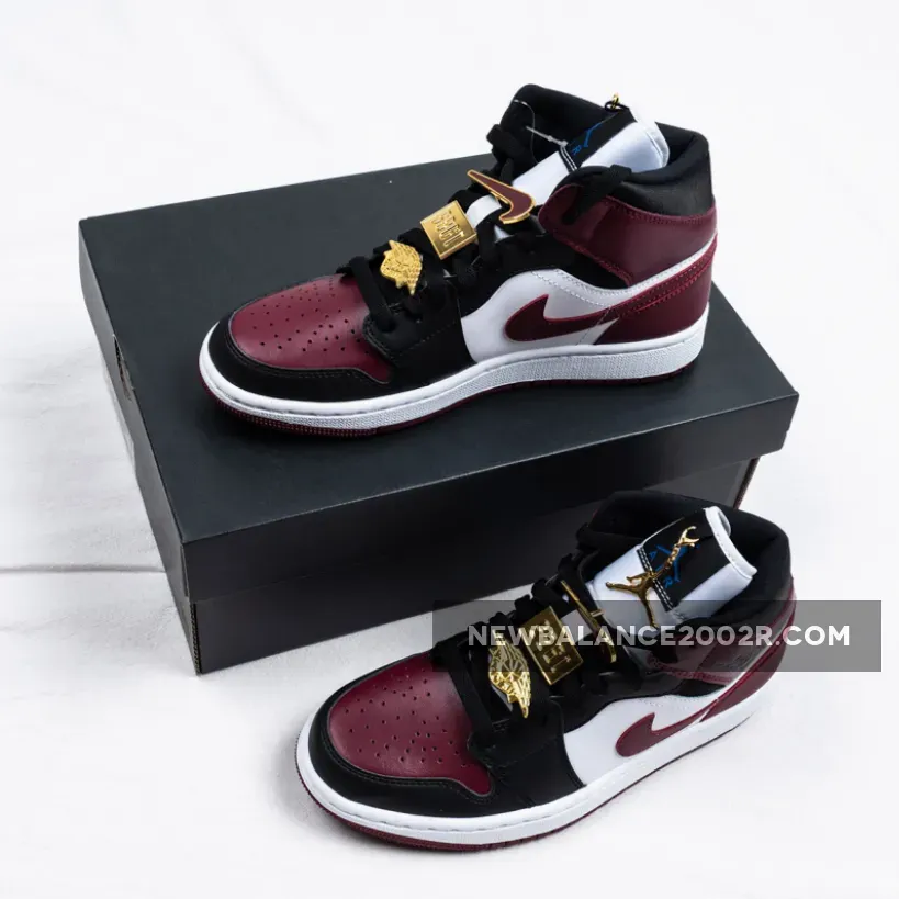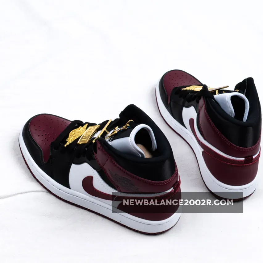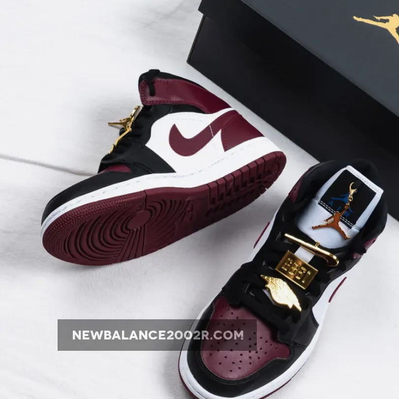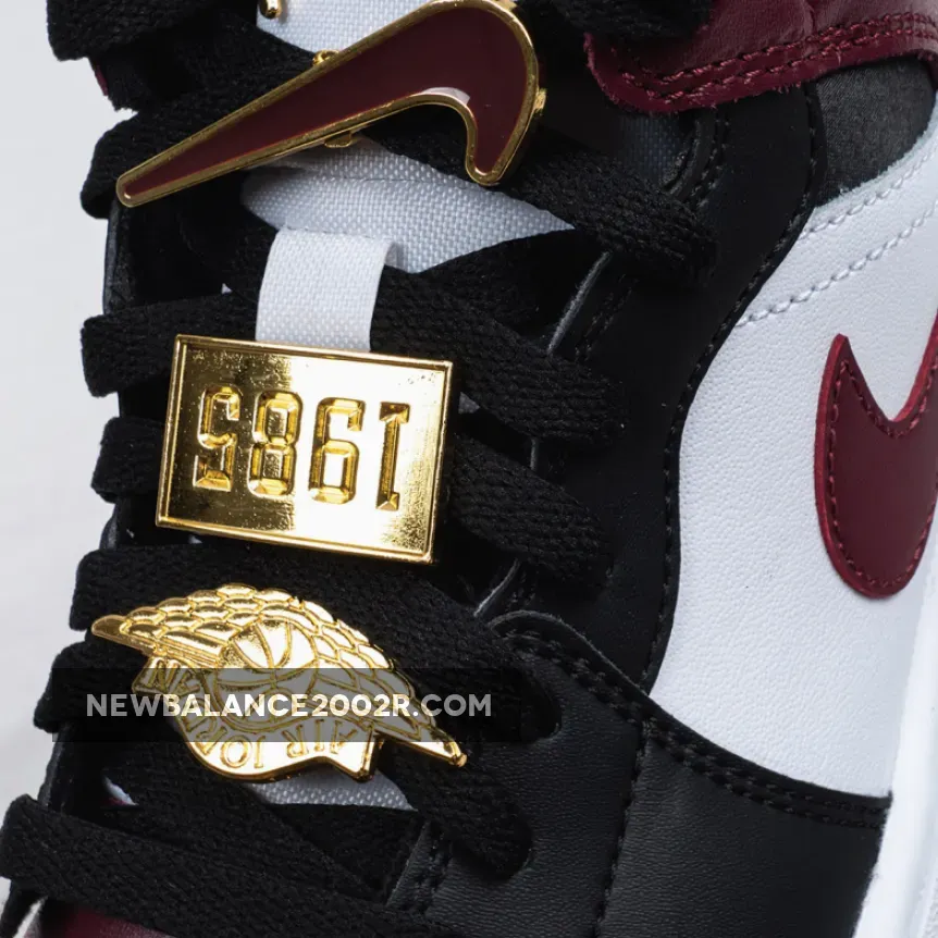 this mid-top Air Jordan 1 uses leather throughout for a premium theme. White covers the panels while Dark Red or even Burgundy lands on the toe, Swoosh, heel, and ankle overlay. Blue then lands on the tongue branding and insoles and White on the midsole, and Dark Red on the rubber outsole. However, the true highlight is the Gold pendants running down the tongue and laces, which features a Jumpman, Wings, 1985, ‘Jordan,’ and ‘Women.’