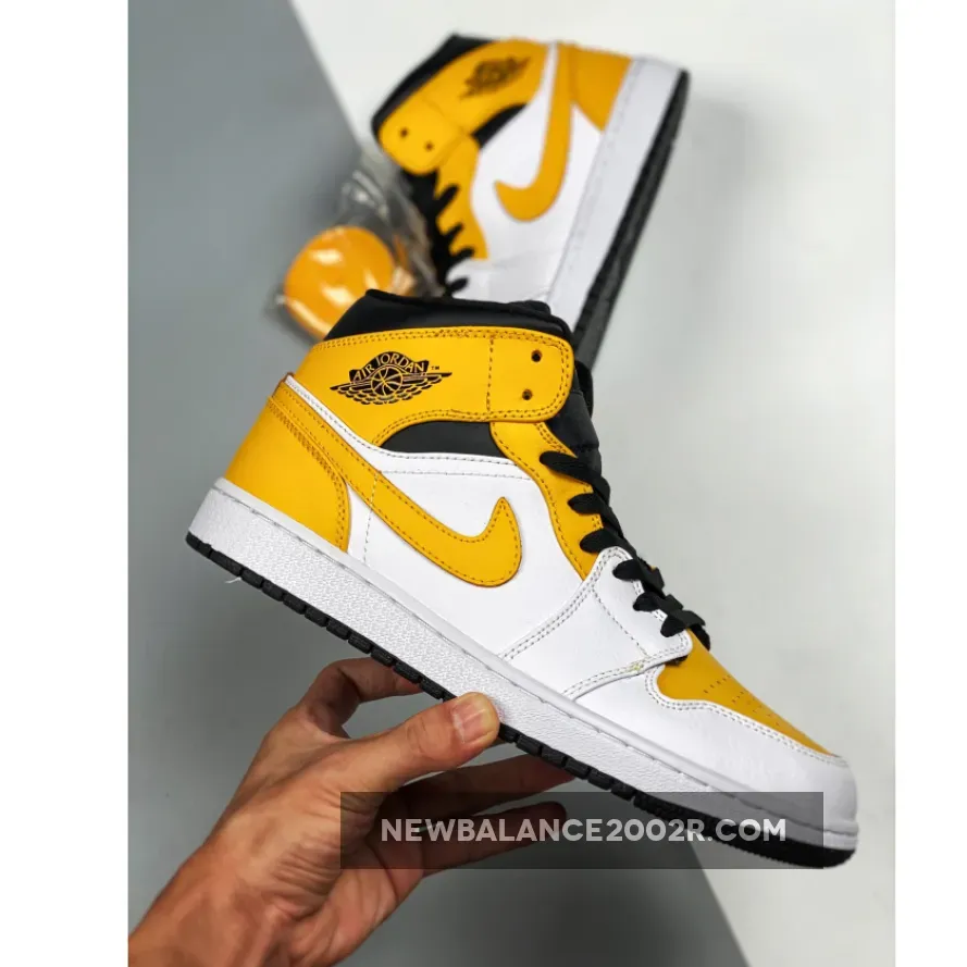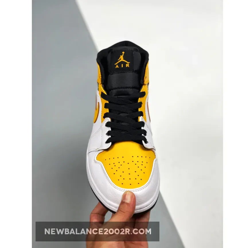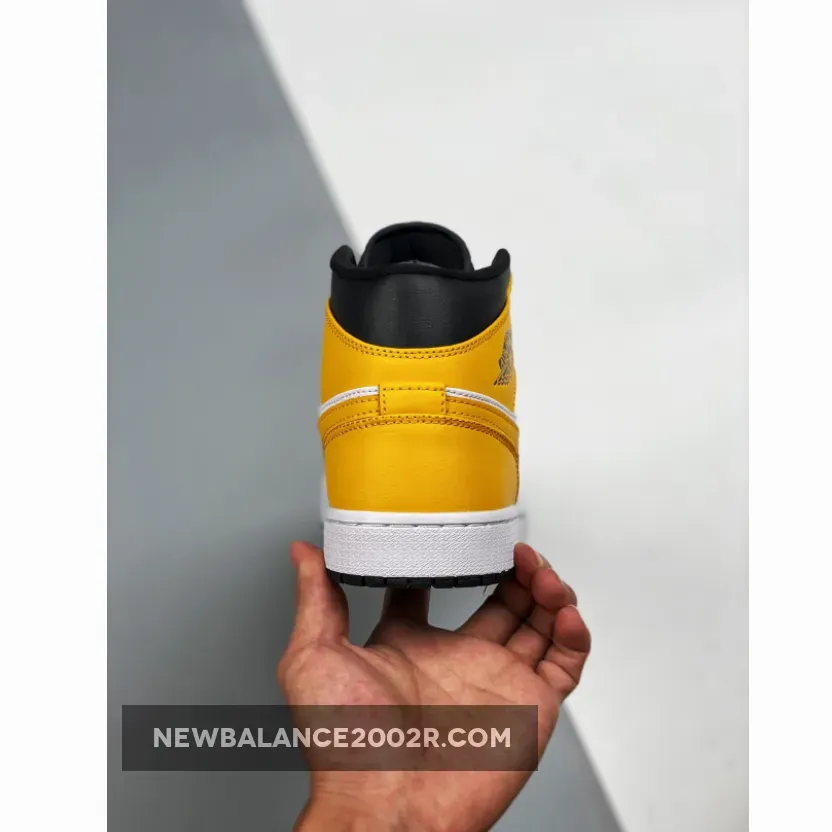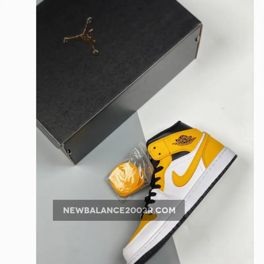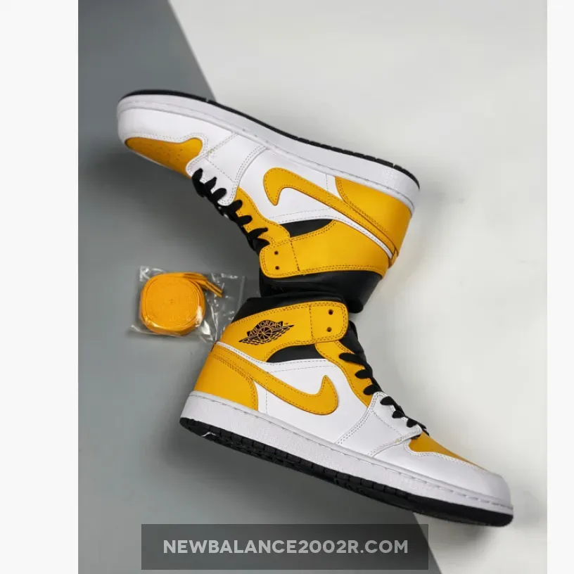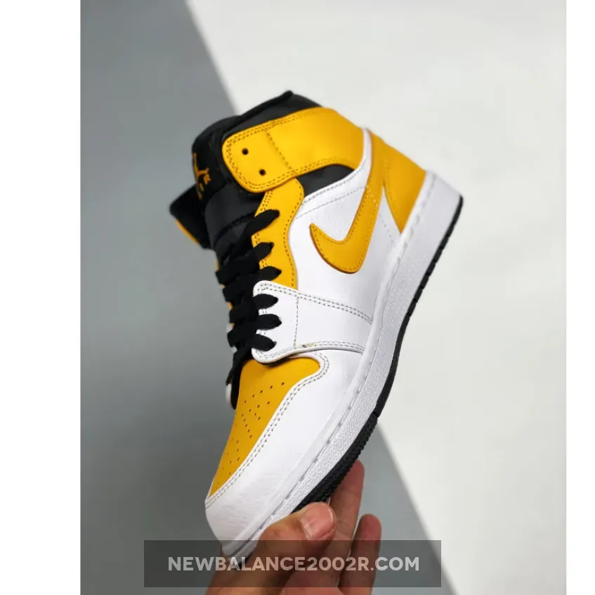 Dressed in a White, University Gold, and Black color scheme. This Air Jordan 1 Mid features Gold on the perforated toe box, upper eyelets, ankle flap, Swooshes logos, heels, and branded insoles. White overlays and midsole with Black mesh tongues, matching-colored laces, leather ankle collar, Wings logos, insoles, and rubber outsole completes the design.