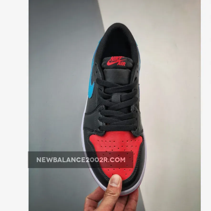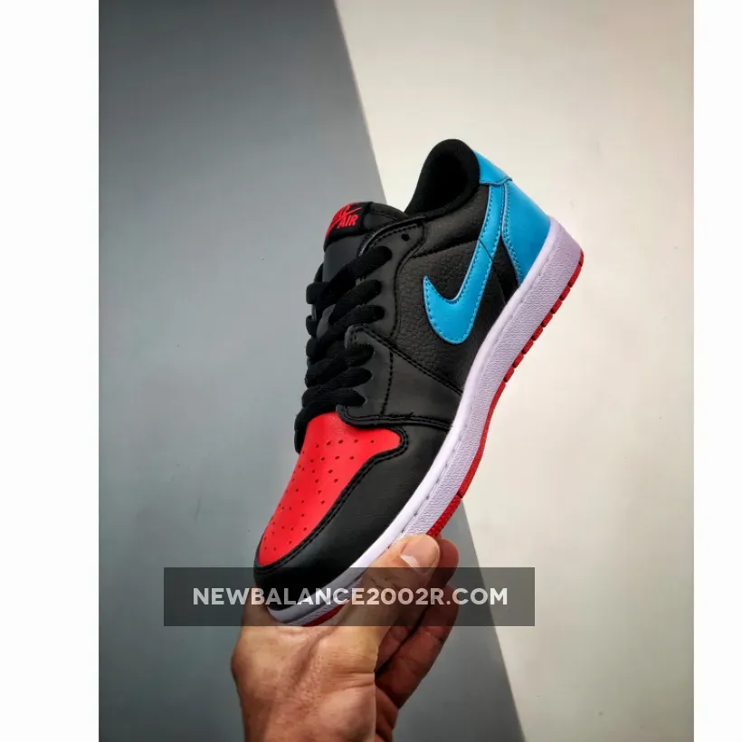 The upper of the Jordan 1 OG NC to Chi is constructed using leather material, and features a unique color blocking design that combines the UNC light blue with Chicago Bulls black and red. Light blue covers the rear portion and the Swoosh, while black covers the rest of the upper – apart from the toebox, which is red.