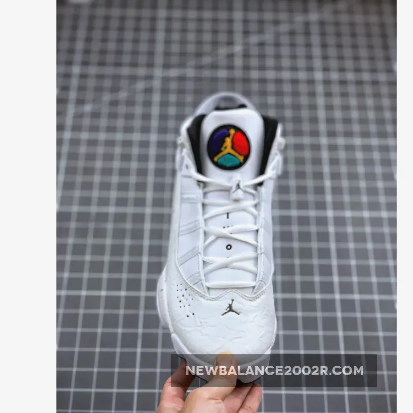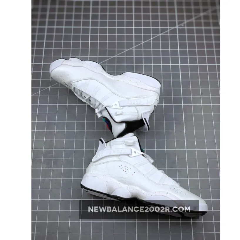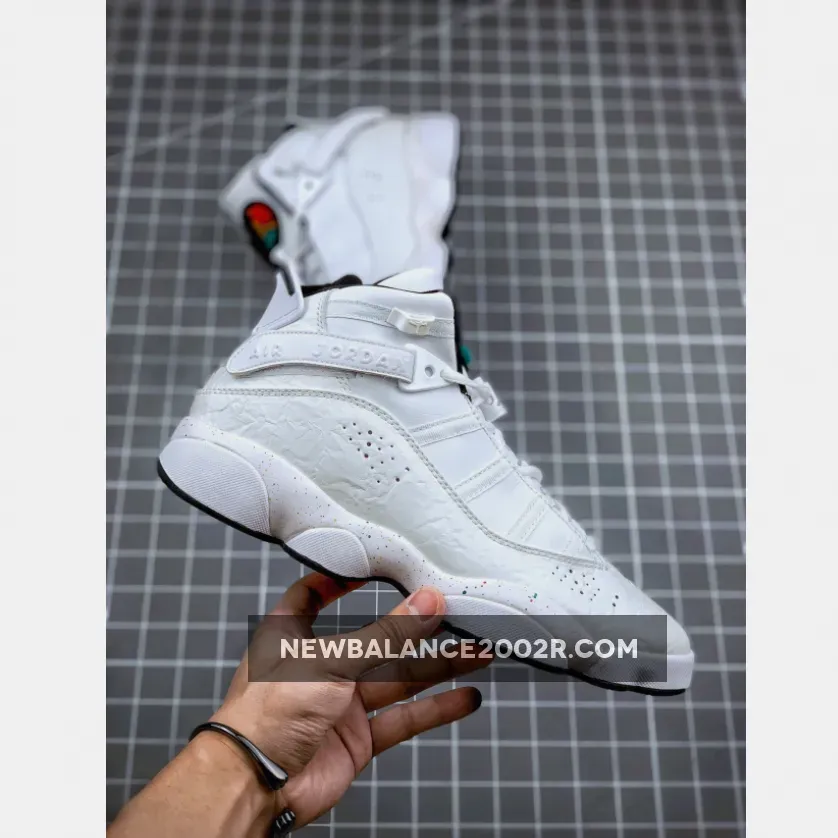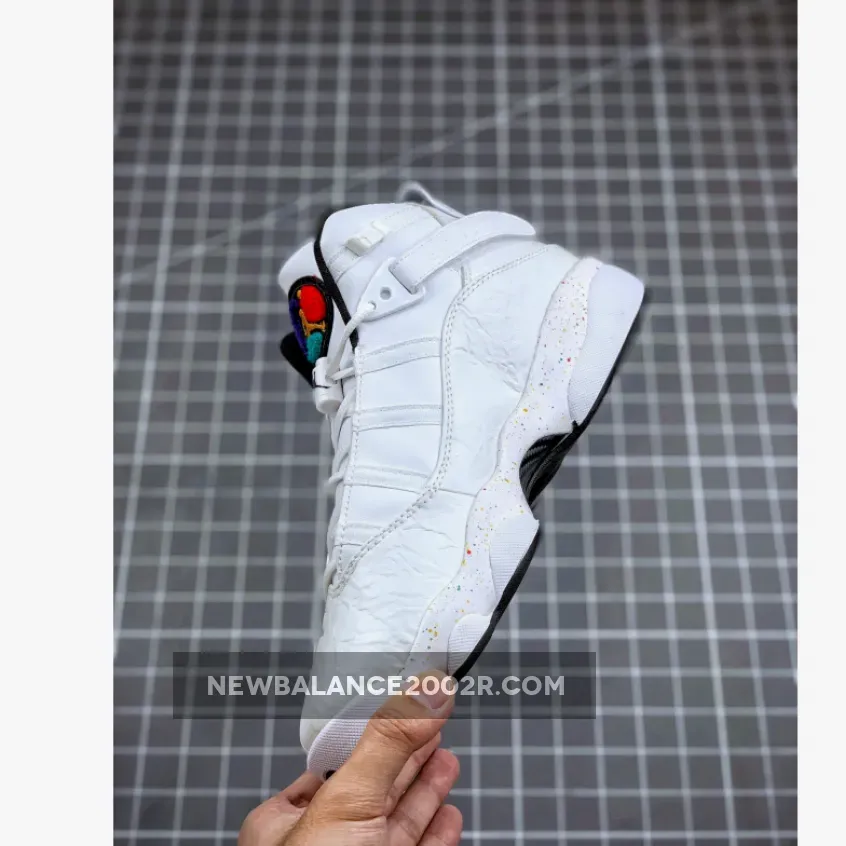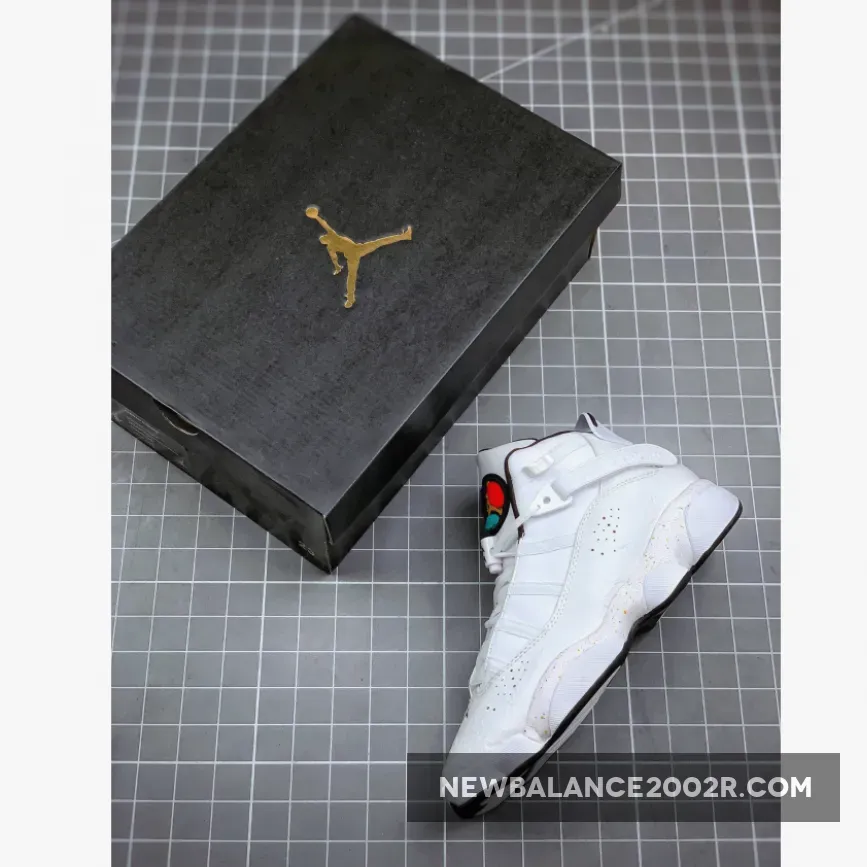 The shoe was crafted in a mash up of iconic Air Jordans that MJ wore while capturing each of those six titles. This particular release features a clean White upper with a tongue inspired by the Air Jordan 8 dressed in hits of Red, Purple, Green, and Golden Yellow. A paint speckled midsole completes the design.