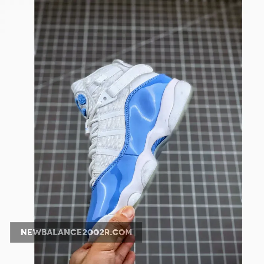 Dressed in a White, Valor Blue, and Ice color scheme. This Jordan 6 Rings features a White mesh and leather upper paired with a Carolina Blue patent leather mudguard. An icy translucent outsole completes the design.