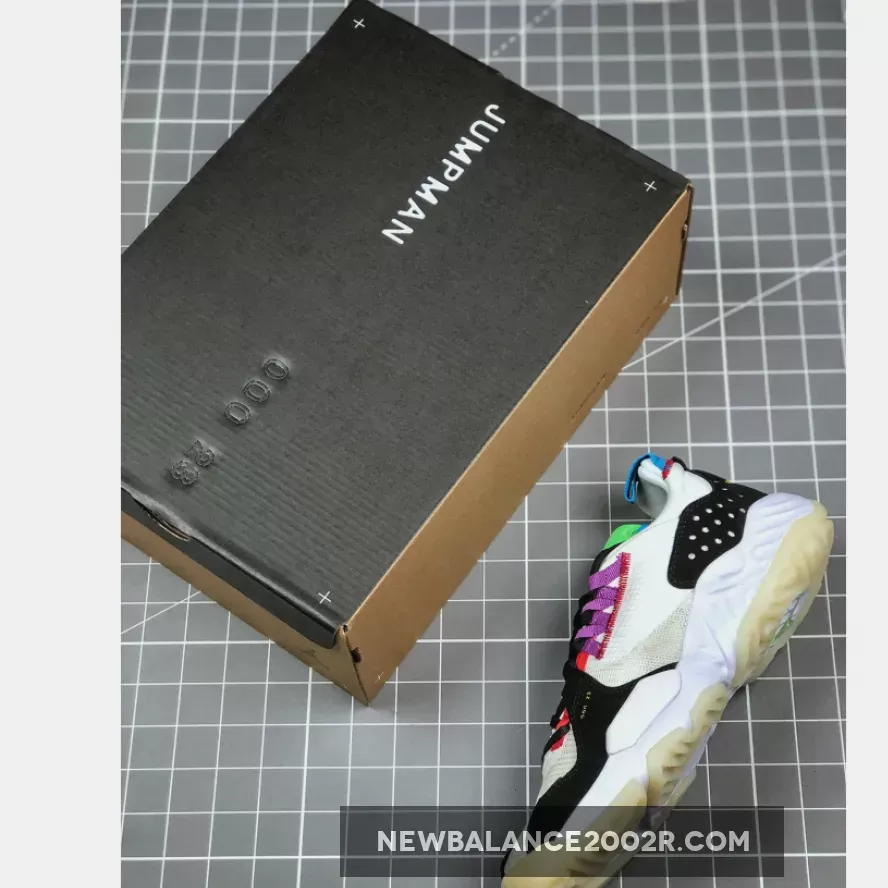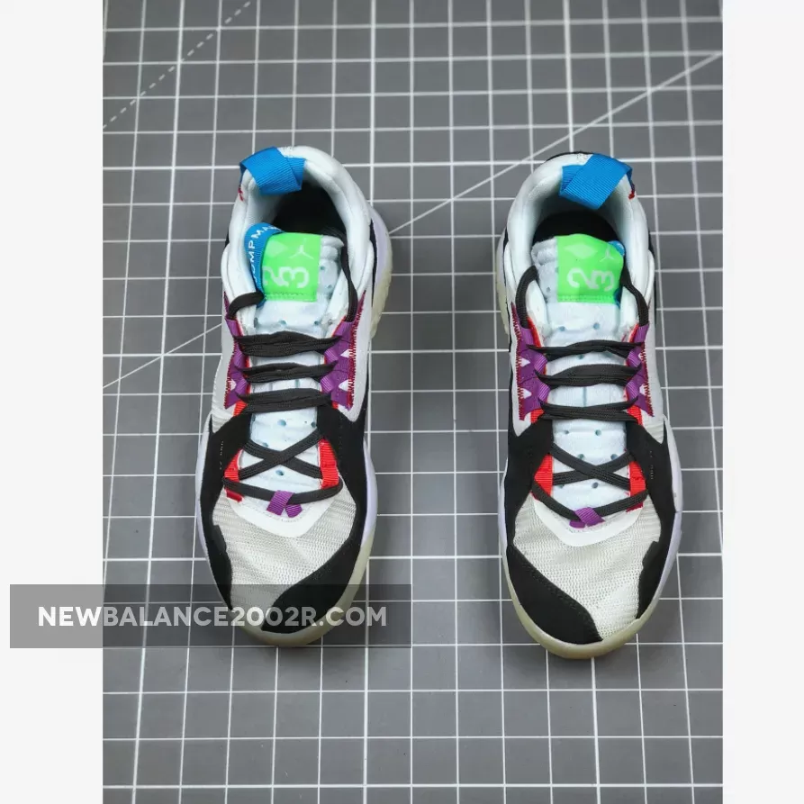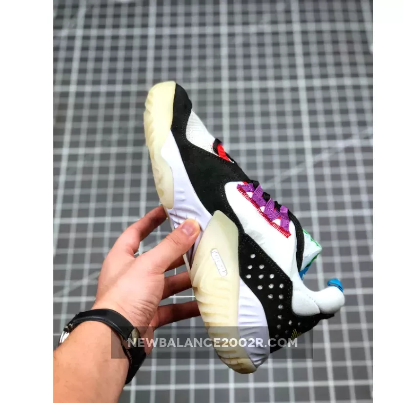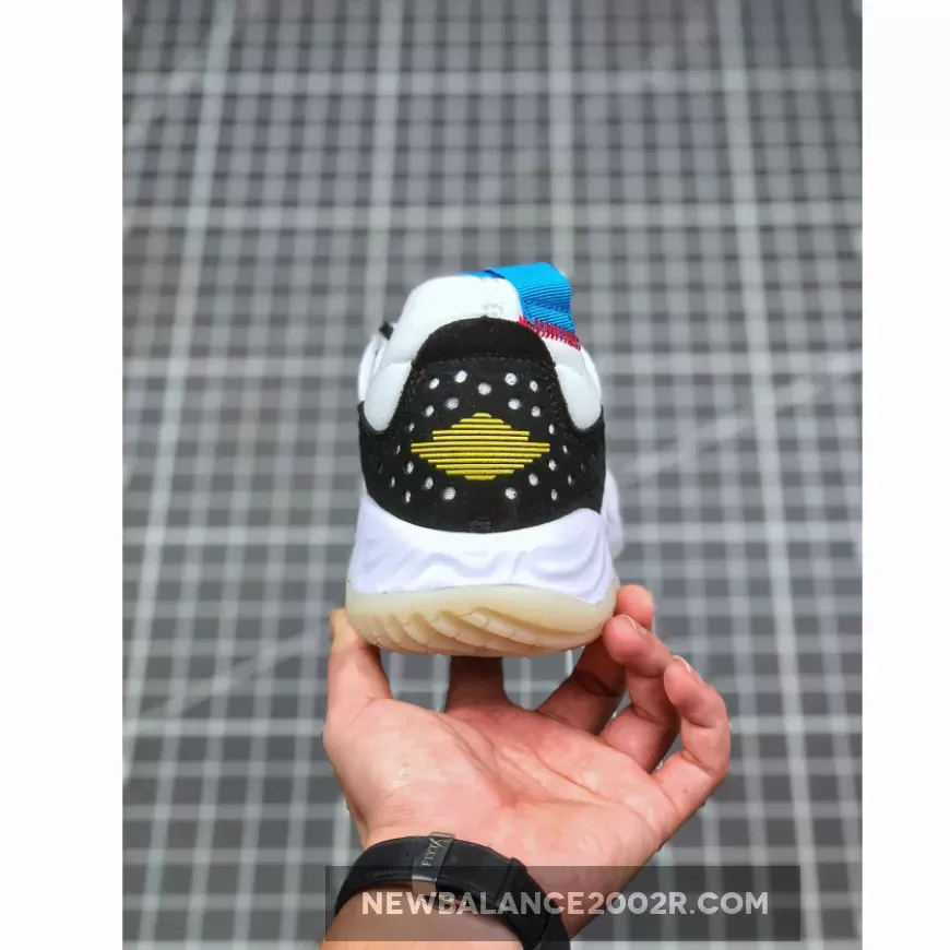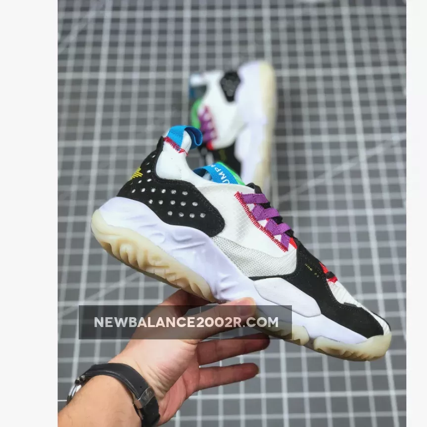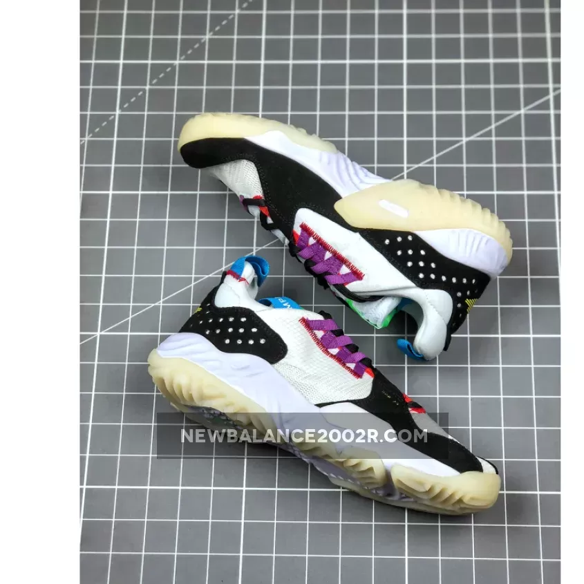 This offering of the shoe sports a Sail base with Black suede overlays highlighted with multi-colored accents in a range of Blue, Purple, Red, and Yellow tones. “000 23” is printed on the forefoot and tongue on the left shoe completed with a striped “Wings” logo on the heels and insoles atop a React cushioned sole.