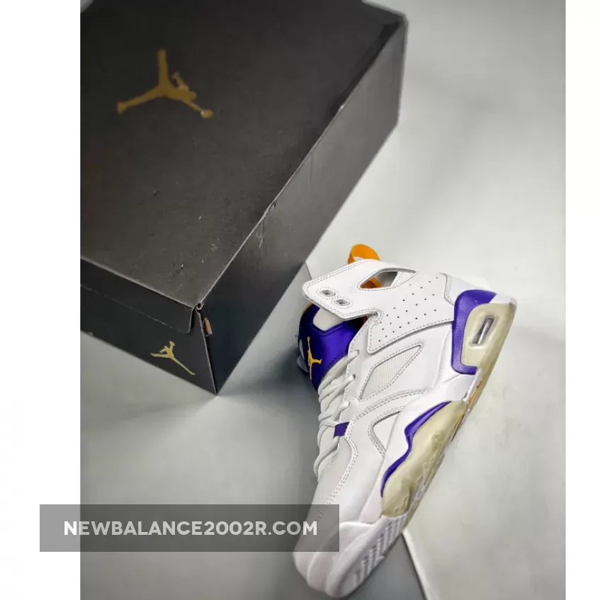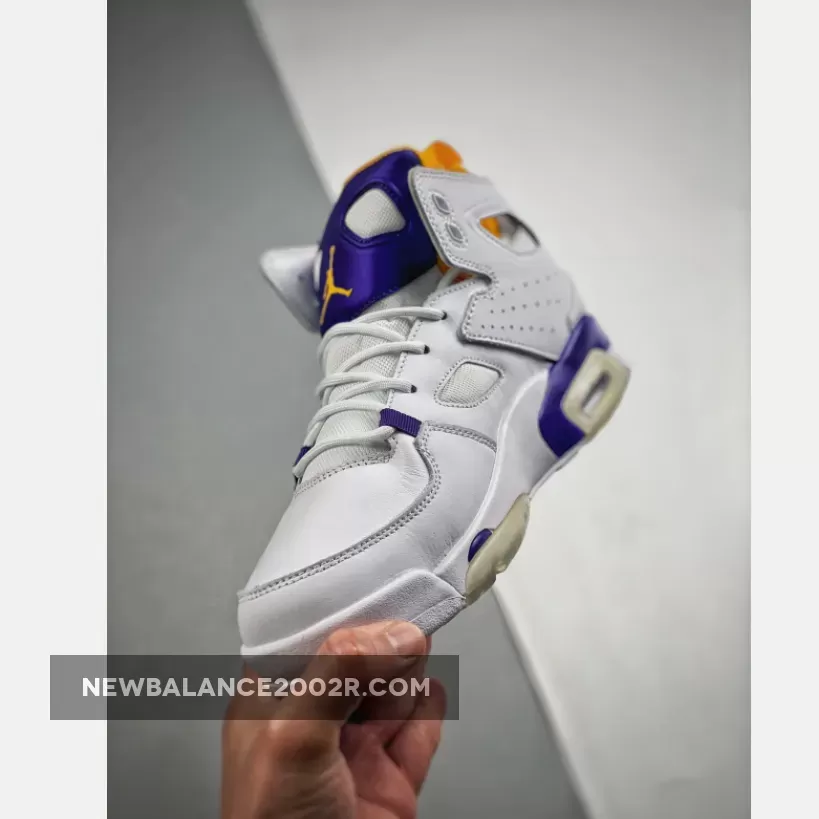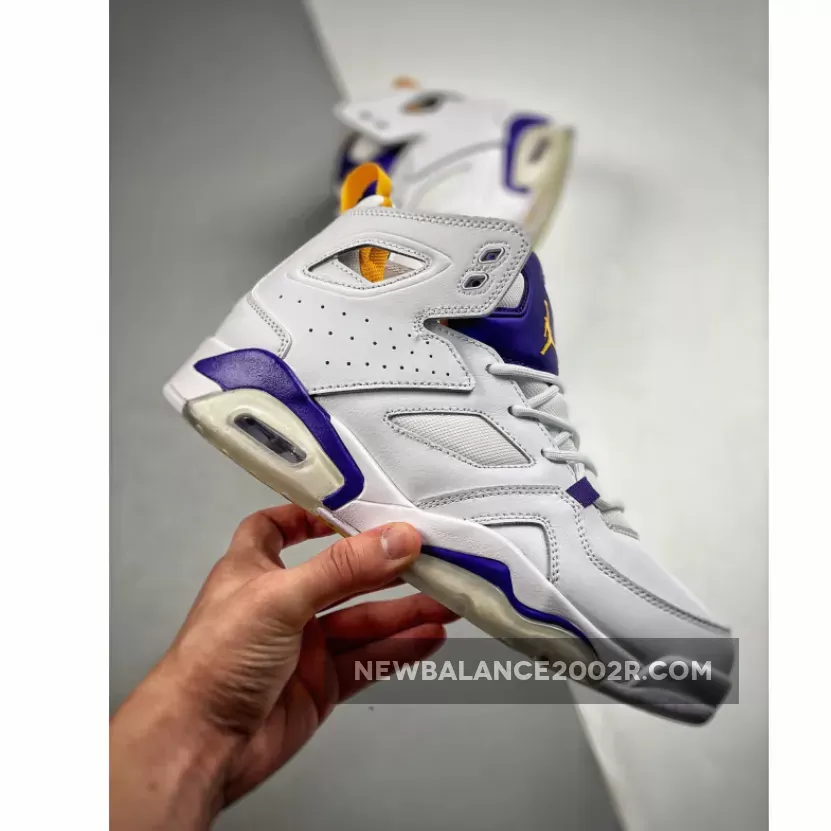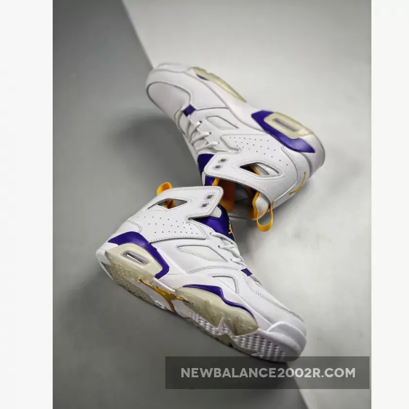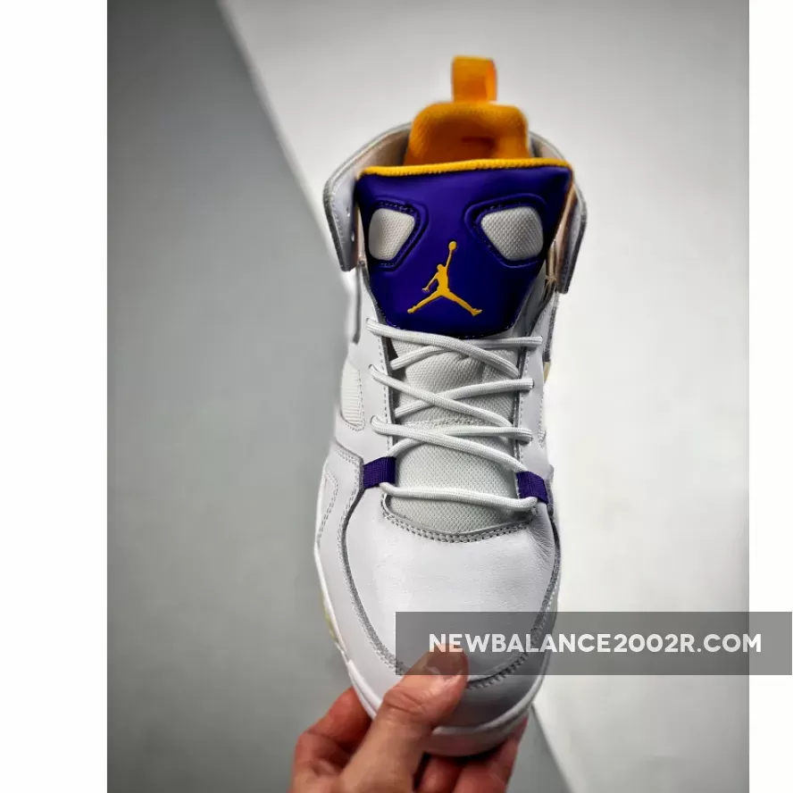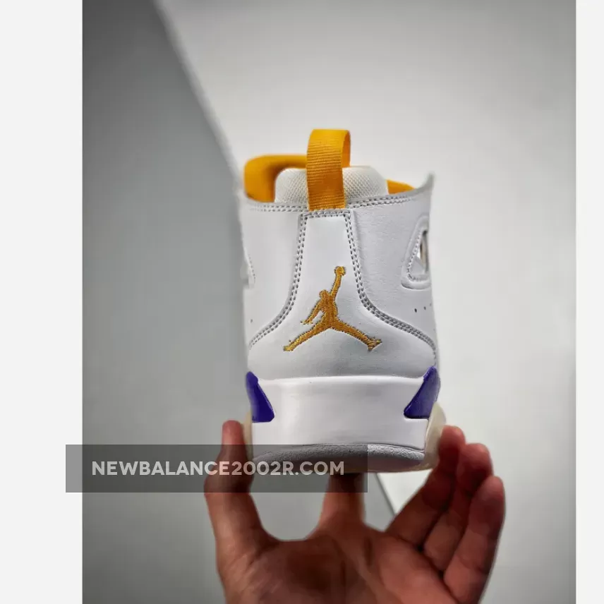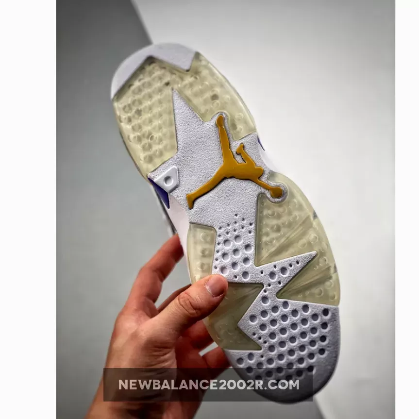 Dressed in a White, Court Purple, and University Gold color scheme. It comes constructed in a mix of genuine and synthetic leather containing an inner bootie, providing a snug and secure fit. Callouts to the popular Air Jordan 6 are spotted on the cutouts in the collar, tongue, visible Air cushioning, and outsole.