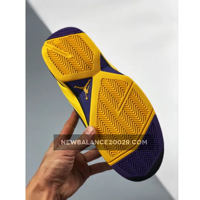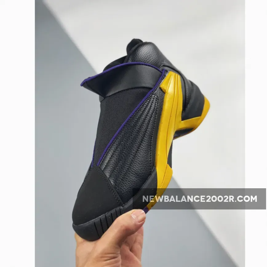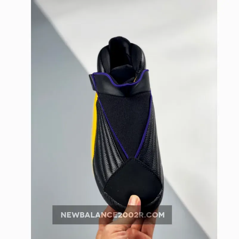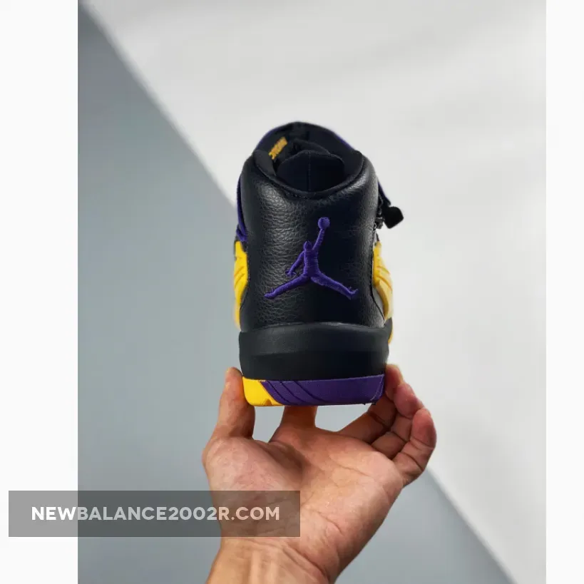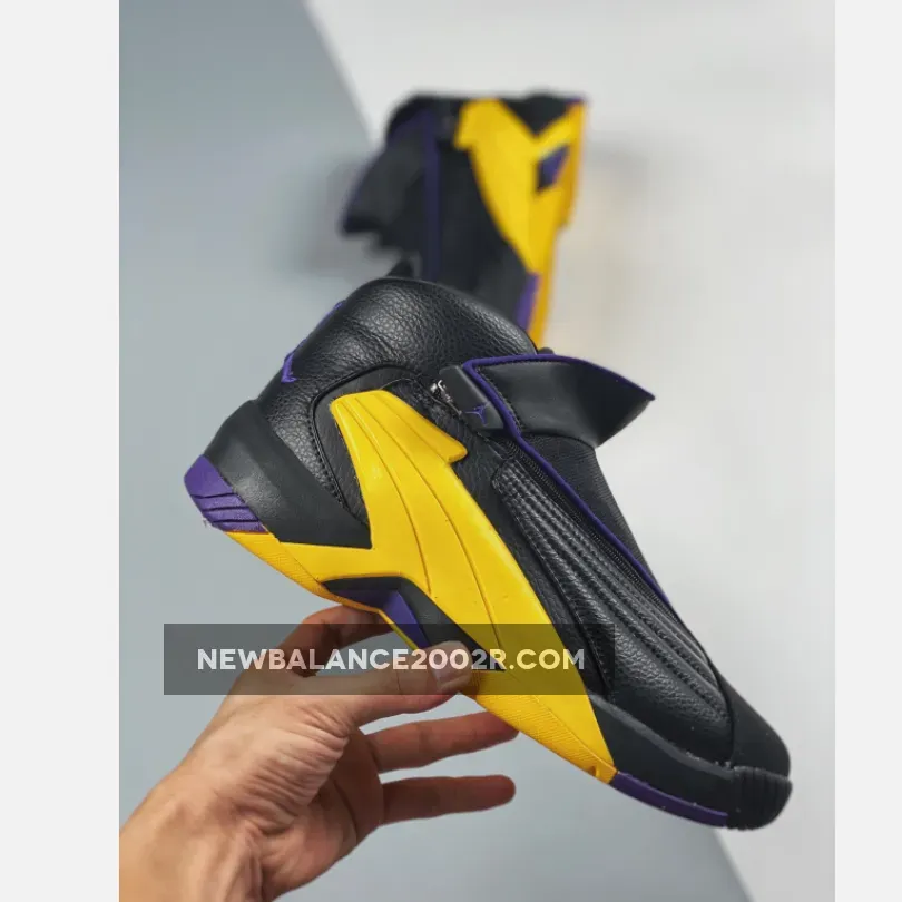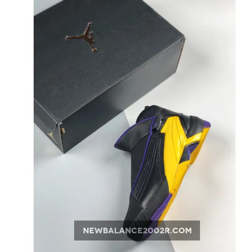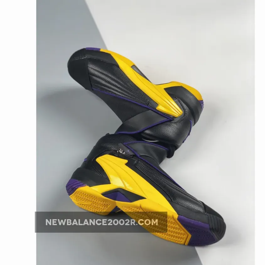 Dressed in a Black, Amarillo, and Court Purple color scheme. This release features a Black leather upper with its iconic zippered closure highlighted with Purple and Yellow accents.