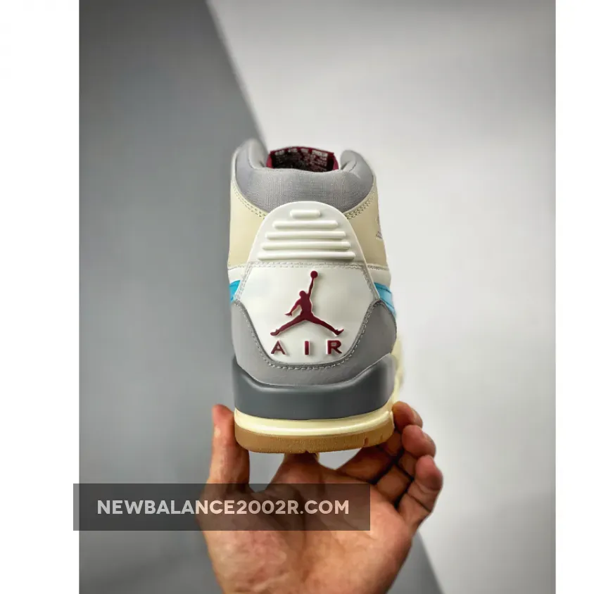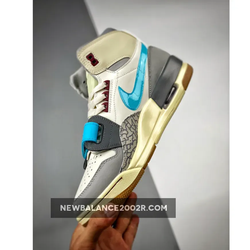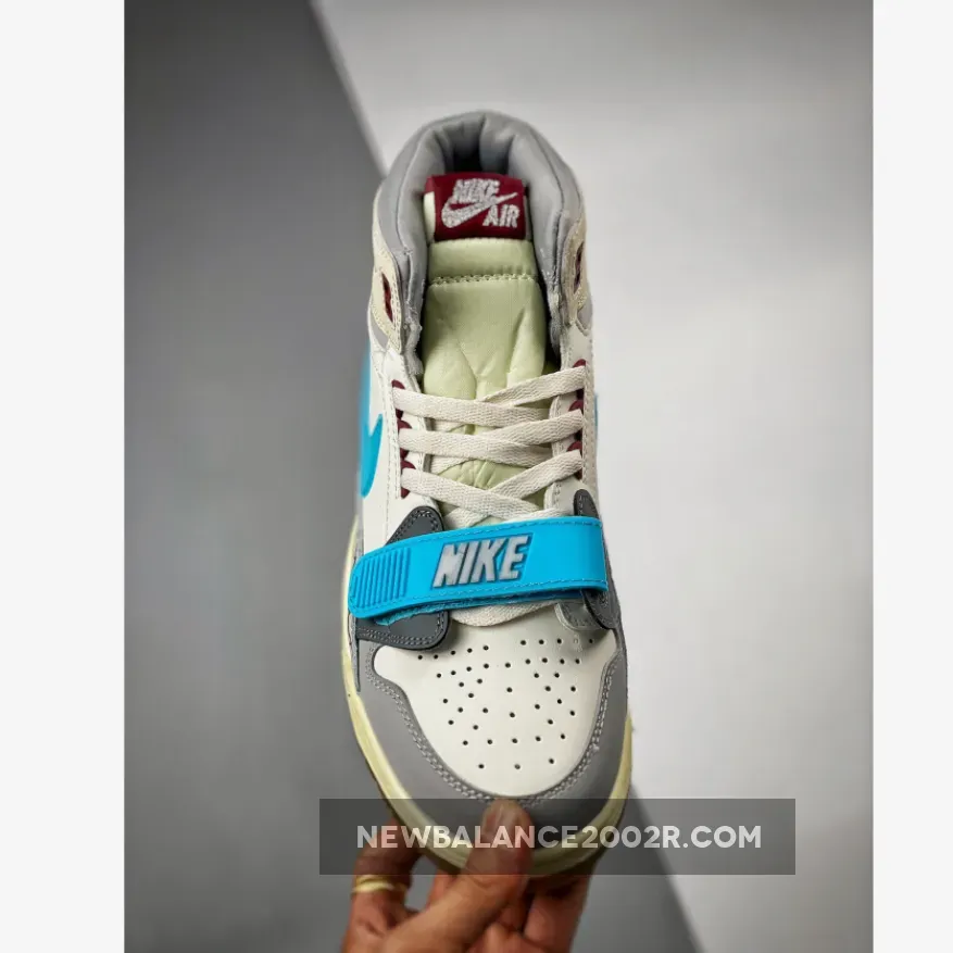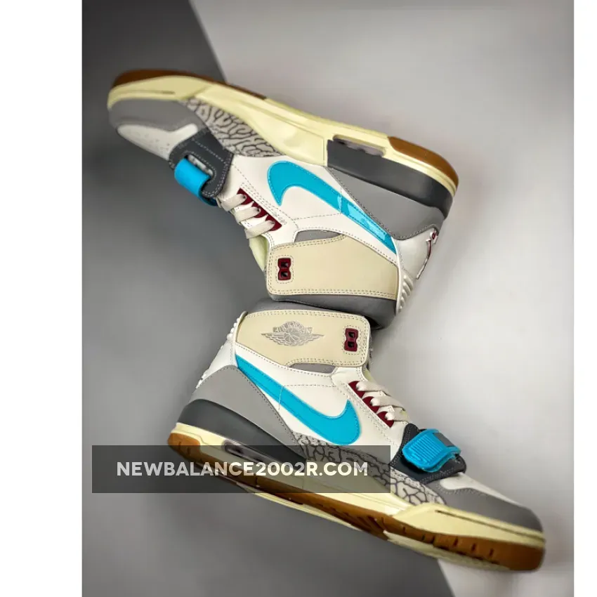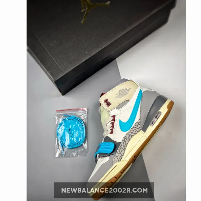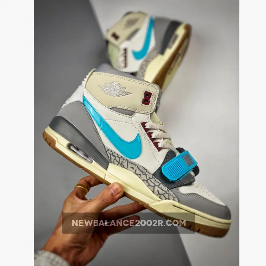 Keep your style cool and fresh with the Jordan Legacy 312 Blue Grey White. A splash of bright colour is added through the cyan-hued forefoot strap and Nike Swoosh. Meanwhile, the plush collar is supported by a neutral Air Jordan-branded grey overlay.