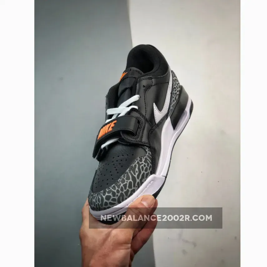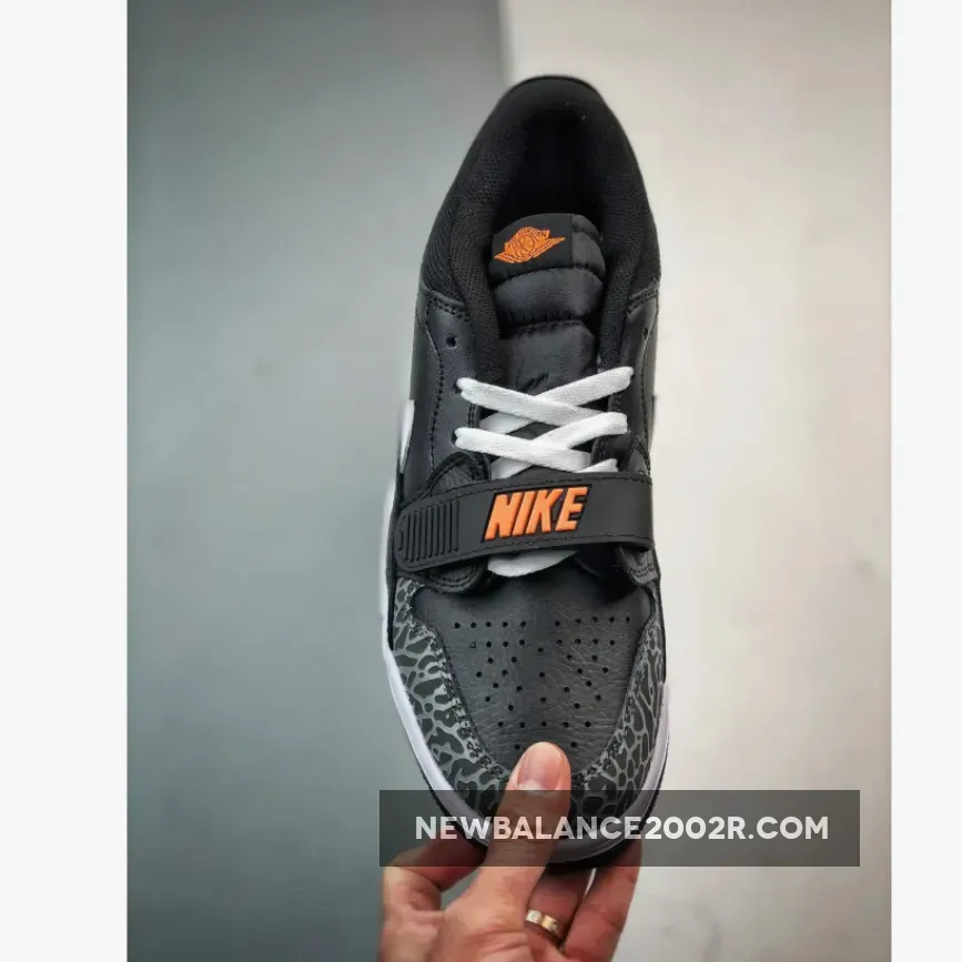 Additionally, the low-top trim features a vibrant orange hue, visible on the heel’s Jumpman logo, and the Nike insignias on the forefoot strap and tongue tab, offering a pop of color that complements the darker tones.