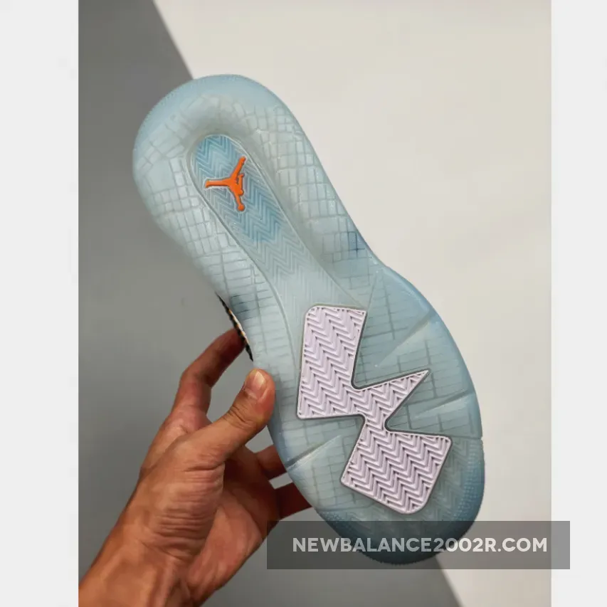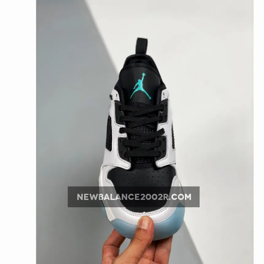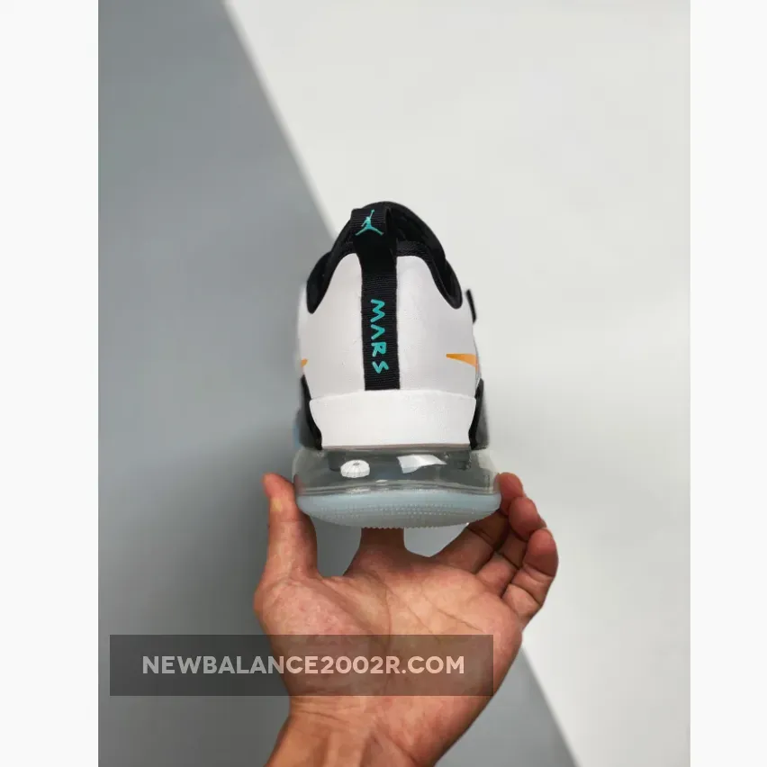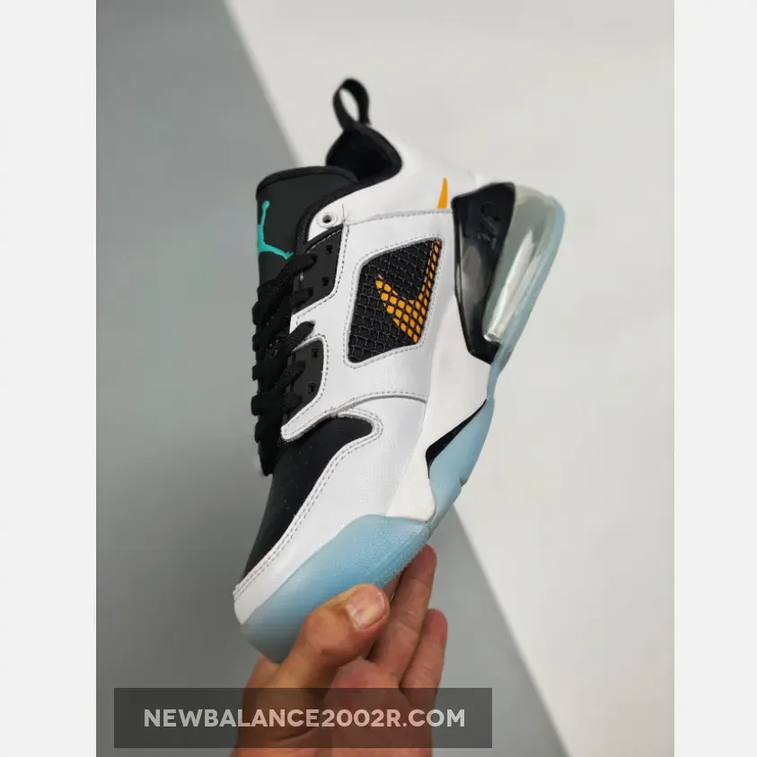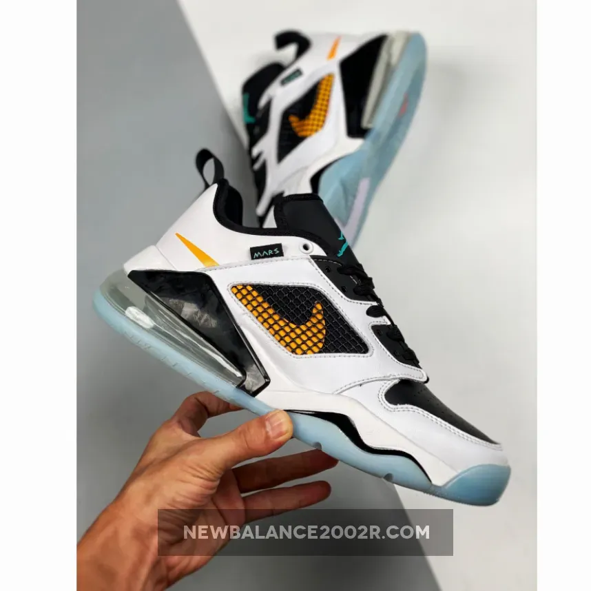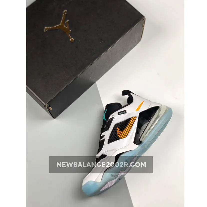 The Jordan Mars 270 Low seen above takes on a neutral upper with bright pops of color. The low top model gets done in a simple black and white leather construction on the upper which is then contrasted by orange Swooshes on the side panels and aqua detailing on the branding that appears on the tongue, insoles, and heels. A white midsole, a blue tinted Air Max 270 bag on the heel, and an icy translucent outsole complete the look on this Jordan Mars 270 Low.