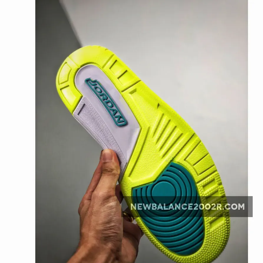 Having a mash-up of iconic Jordan elements with a shout-out to Chicago’s 312 area code, this offering sports classic vibrant tones. It features a White leather upper paired with Teal on the collar, tongues, Swooshes and branding on the strap. Other details includes Purple and Volt accents to complete that summer vibe.