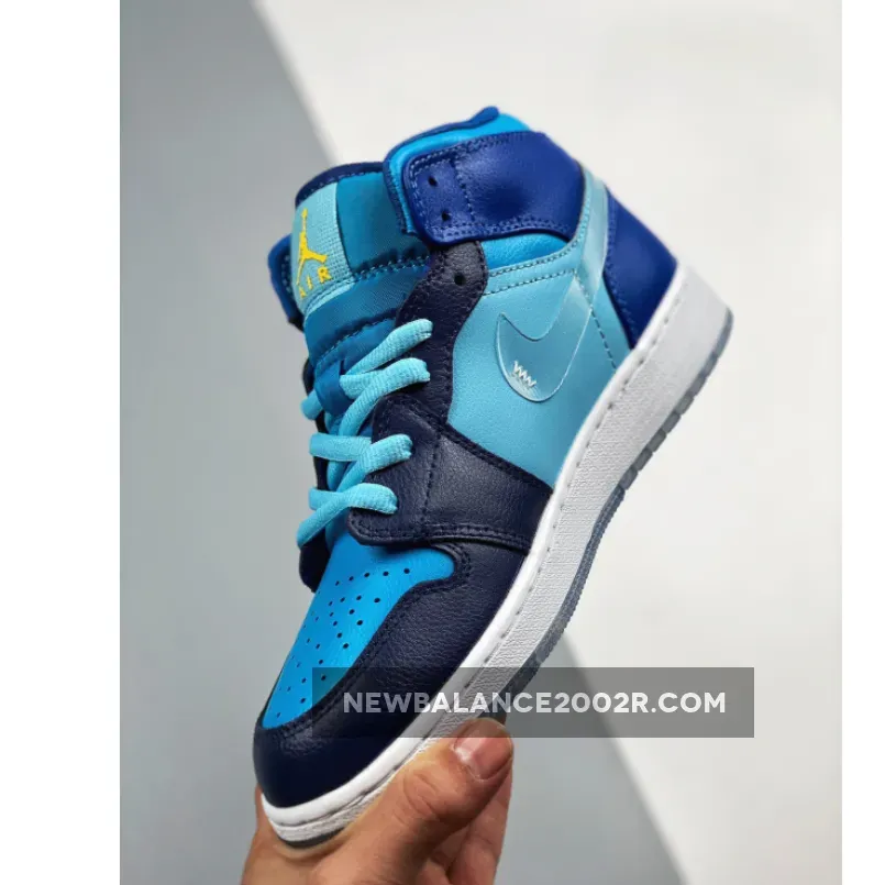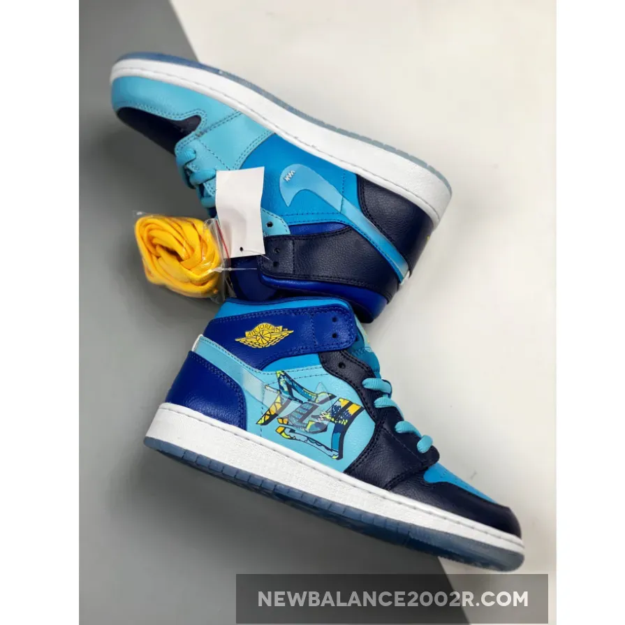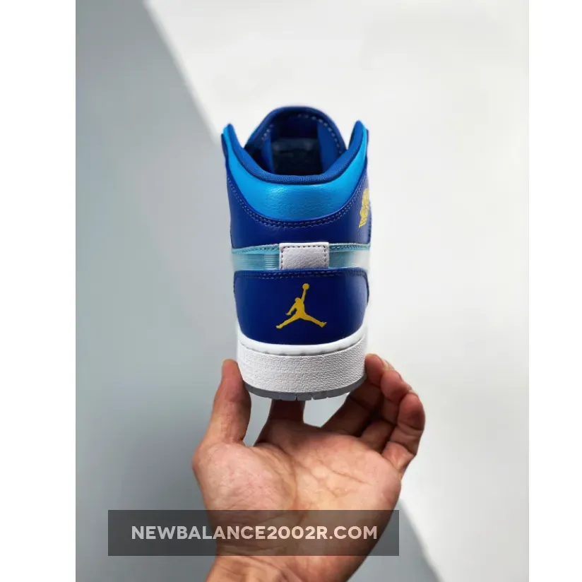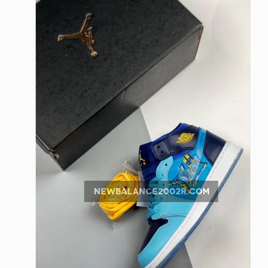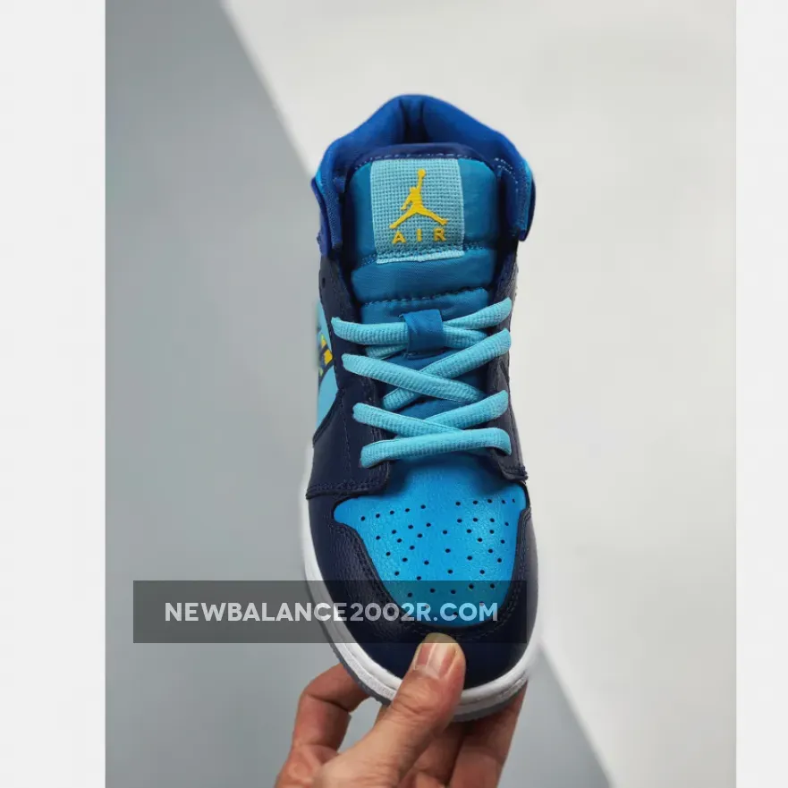 this Air Jordan 1 Mid features ‘Fly’ written on the panels along with a translucent mid-foot Swoosh. Utilizing shades of Blue throughout, the tongue and toe box is mismatched. Other details includes Yellow on the Wings logo, White midsole and a translucent outsole.
