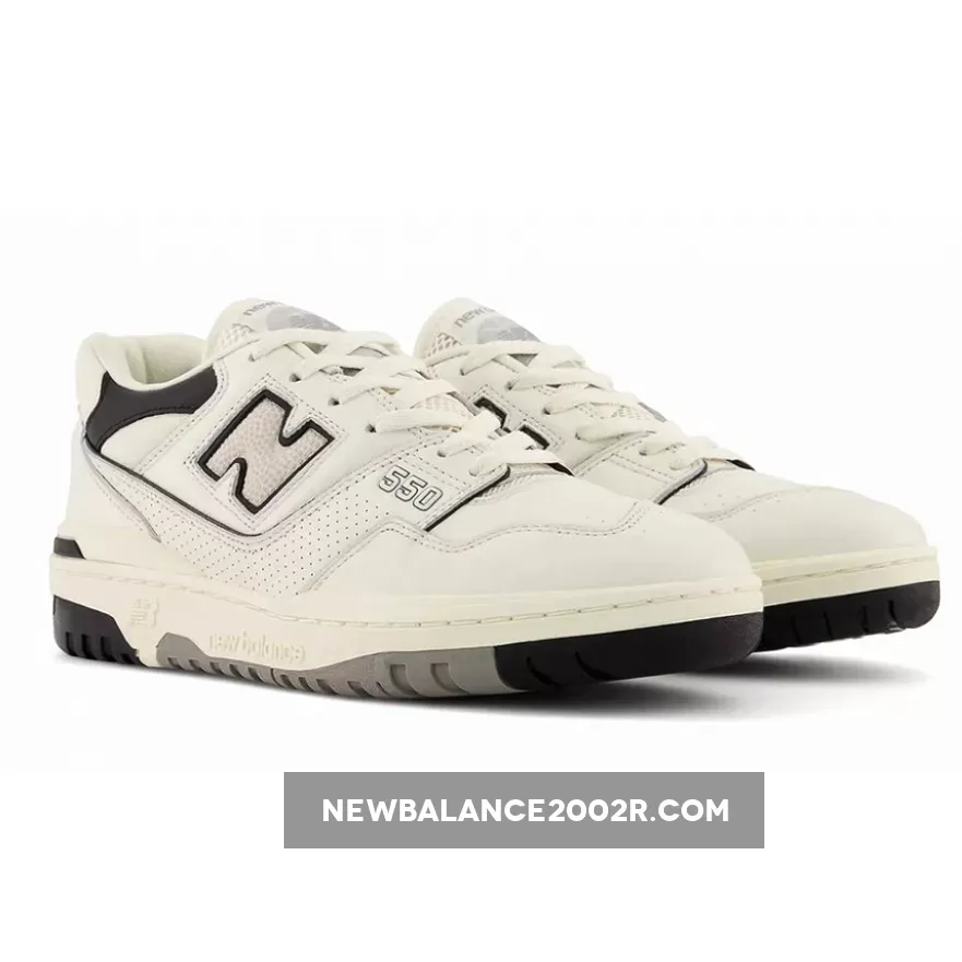 “The New Balance 550 ‘Sea Salt’ gives the vintage hoops shoe a neutral makeover devoid of color. The upper is constructed from off-white leather with a signature ‘N’ logo in grey pebbled leather. The low-cut mesh collar is overlaid with black leather detailing, matching the molded heel clip and the Flying NB graphic stamped on the black heel.If you’re looking for an all-around shoe you that can wear with countless outfits on countless occasions, the New Balance 550 Cream Black is a prime candidate. Simple but striking, it features an off white leather upper that’s contrasted by understated black accents. Adding a little flair to this modest pair is the “N” branding on the side panel which showcases a textured look. Elsewhere, traditional 550 detailings such as the breathable tongue and classy perforations are present.