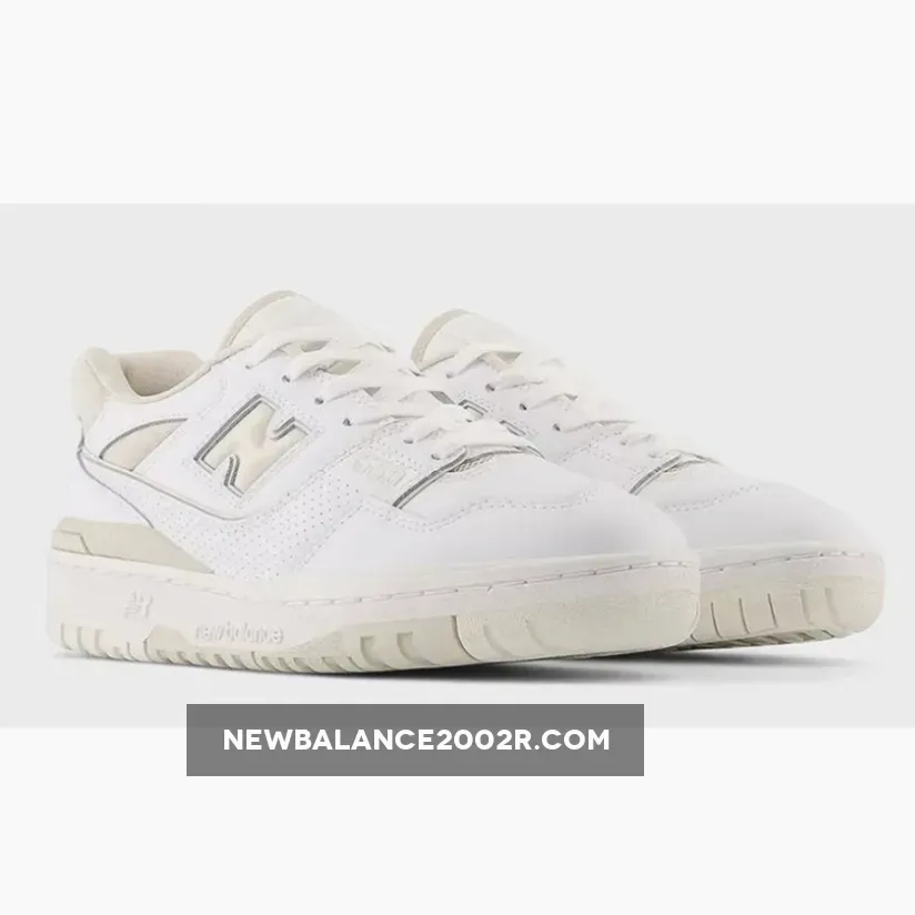 “The New Balance women’s 550 ‘Silver Birch’ brings an understated two-tone palette to the late ‘80s basketball shoe. The low-top carries a white leather upper with a light tan ‘N’ logo on the quarter panel and microperforated detailing on the midfoot overlay. A padded textile collar combines with a breathable nylon tongue to deliver a comfortable fit. Anchoring the sneaker is a traditional rubber cupsole, featuring an exposed EVA wedge at the medial sidewall.Clean and classic — that’s the New Balance 550 White Beige. Following the traditional look of a modern 550, this pair features supple leather construction and perforated side panels for extra breathability.