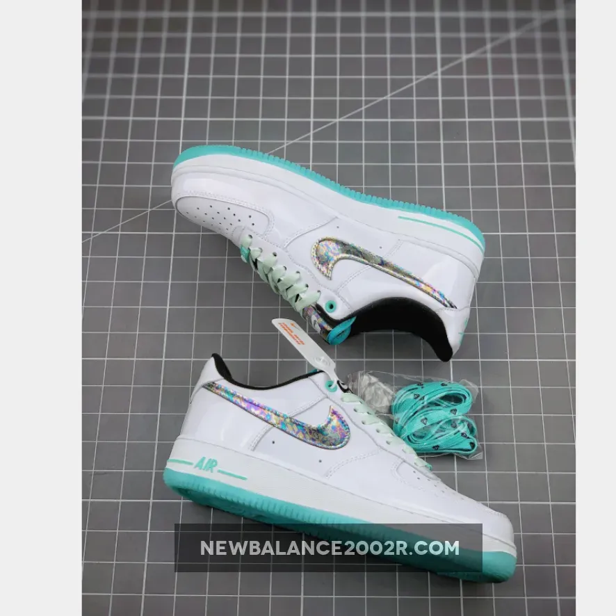 The abalone shell-like swoosh, which is an iridescent collage of blues, greens, and purples, sits atop a clean white leather base. The black used on the tongue and the inside sharply deviates from the stark white. Furthering the sea theme and adding extra pops of color, a bright aqua shade paints the outsole, piping on the tongue, and branding on the heel and midsole. This color gets softened to a mint-like shade for the laces, creating a balance of colors that allows for the shimmery swoosh to stand out.