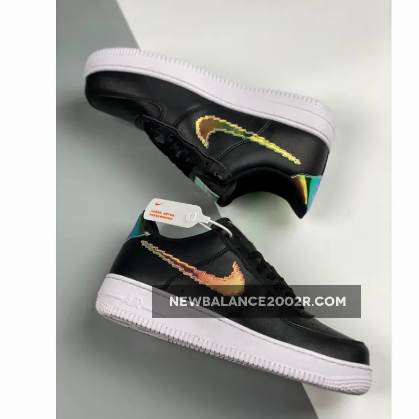 This offering of the Nike Air Force 1 comes dressed in a Black, Multi-Color, and White color blocking with some added eye-catching details. It features a Black leather upper highlighted with iridescent pixel Swooshes, tongues and heels as well as pixel branding on the insoles.