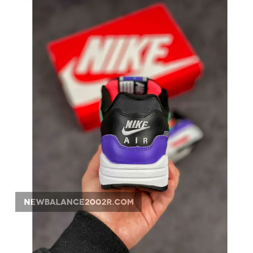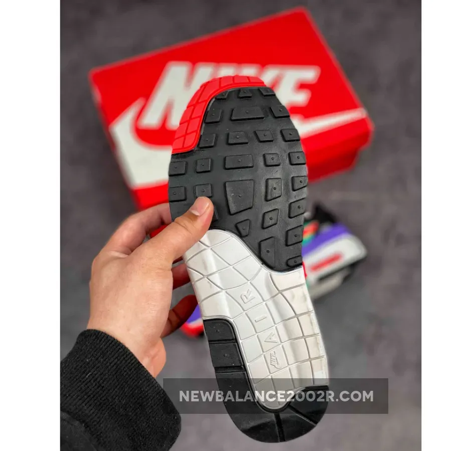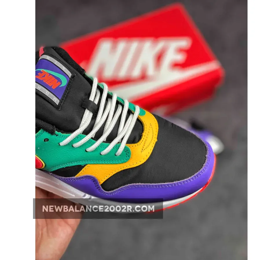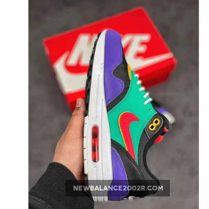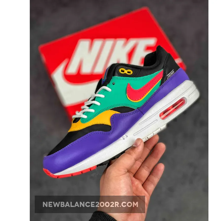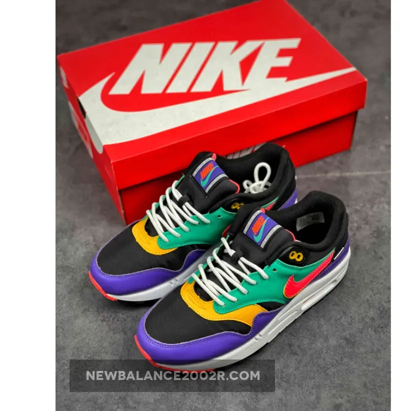 A straight nod to Nike Windbreakers from the ’90s, this Nike Air Max 1 features a Black upper with Yellow, Teal, Crimson, and Orange tones on the overlays.