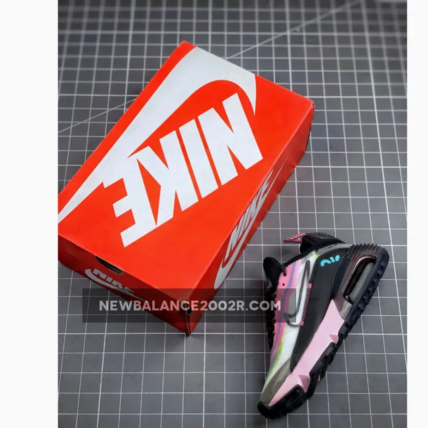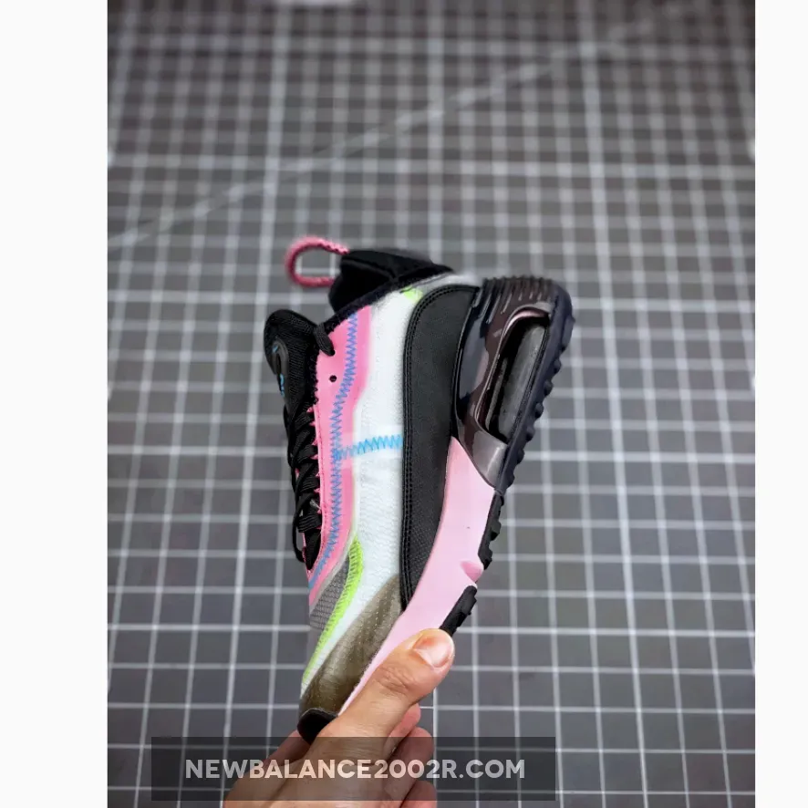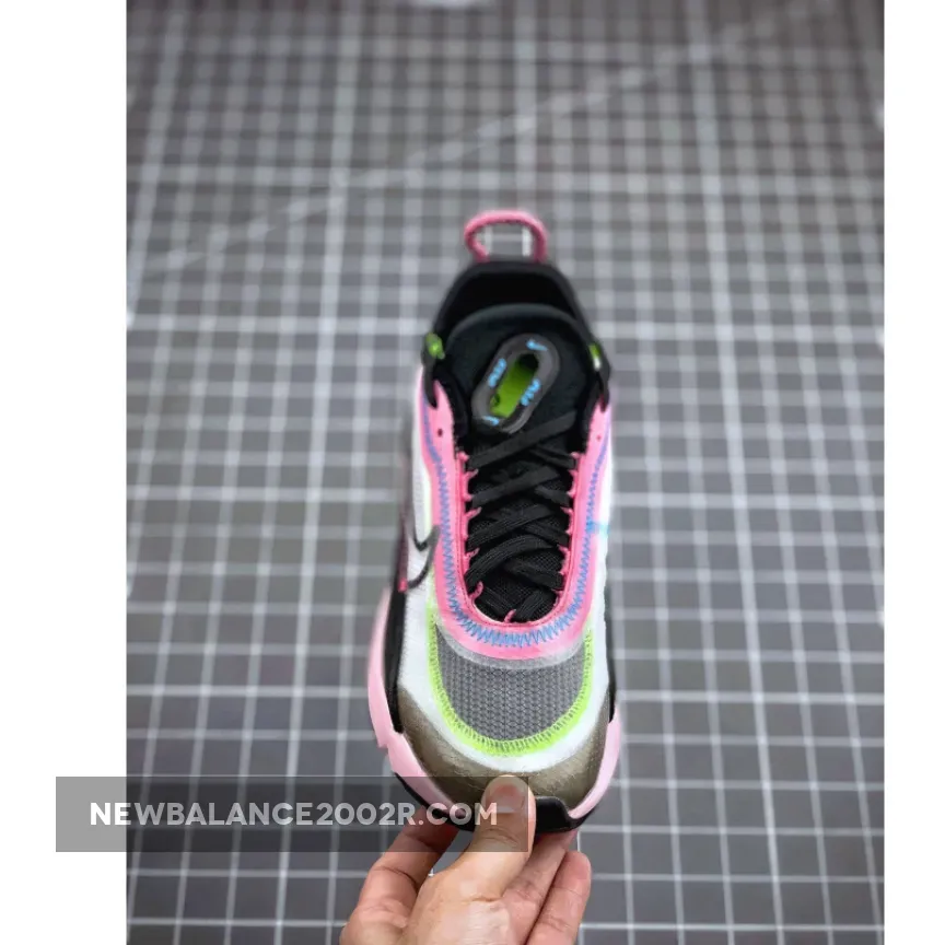 Dressed in a White, Black, Pink Foam, Lotus Pink, Volt, and Blue Gaze color scheme. This Nike Air Max 2090 features a transparent mesh upper with Black textile leather on the mudguards along with Black mesh on the tongues and heels.
