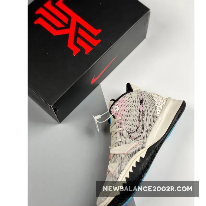 This Nike Kyrie 7 comes dressed in a Pale Ivory, Chlorine Blue, and Black color combination. Constructed with mesh on the upper and plastic overlays, while an array of colors splash the tongue and Swoosh logos. Next, we have playful drawings and mathematic graphics on the heel.