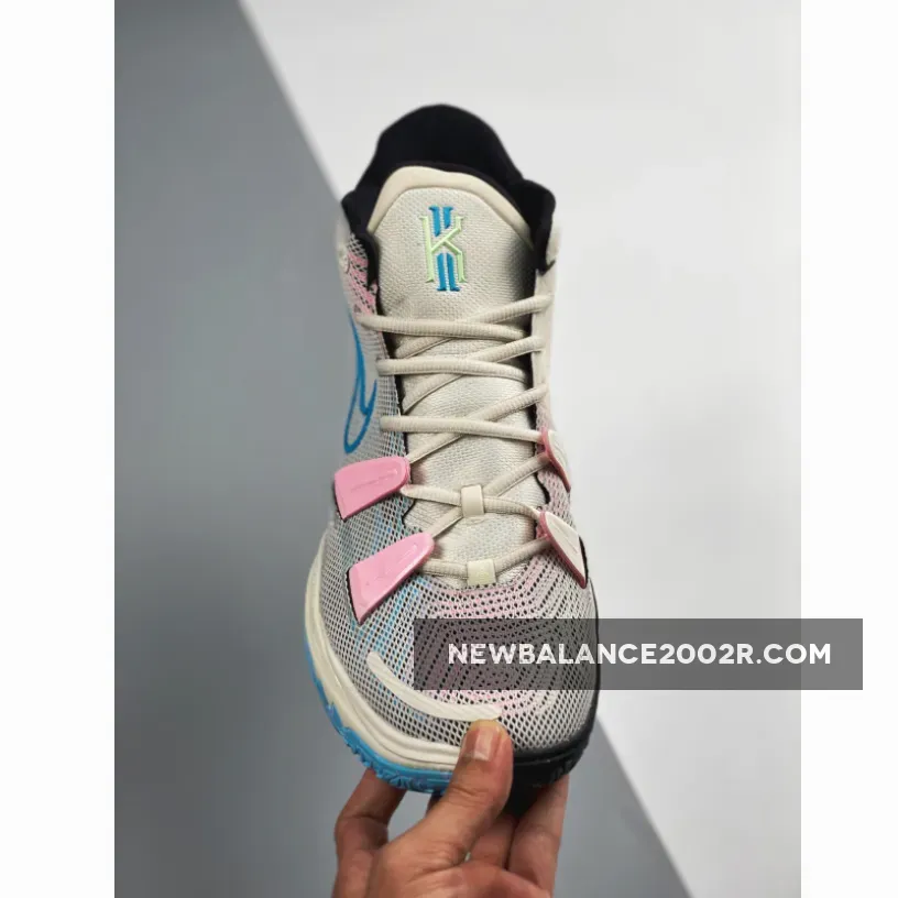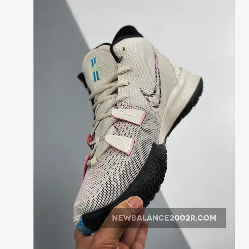 The Nike Kyrie 7’s Pale Ivory/Chlorine Blue-Black colorway boasts a stylish design. The mesh upper and plastic overlays provide a comfortable and durable fit. The playful graphics and mathematic patterns on the heel enhance the unique aesthetic. Overall, a visually striking and functional basketball shoe for serious players.