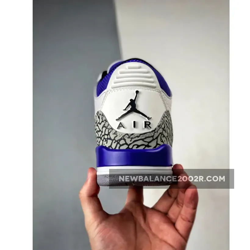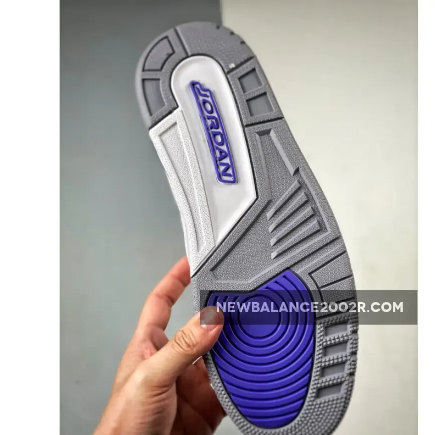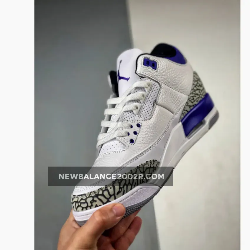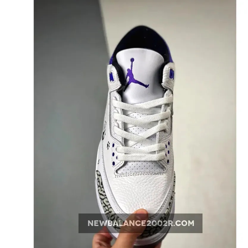 This Air Jordan 3 starts off with a White tumbled leather construction on the upper with tonal detailing noted on the mudguards, heel tabs, midsole, laces, and perforated tongues. The highlight Dark Iris (purple) hue then lands on the perforated ankle collar, upper and lower eyelets, inner tongue, Jumpman logos on the tongue, and midsole. Finishing details include black and grey elephant print on the toes and heels, black Jumpman logos on the heels, black inner liners, and grey rubber outsoles.
