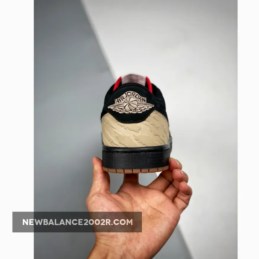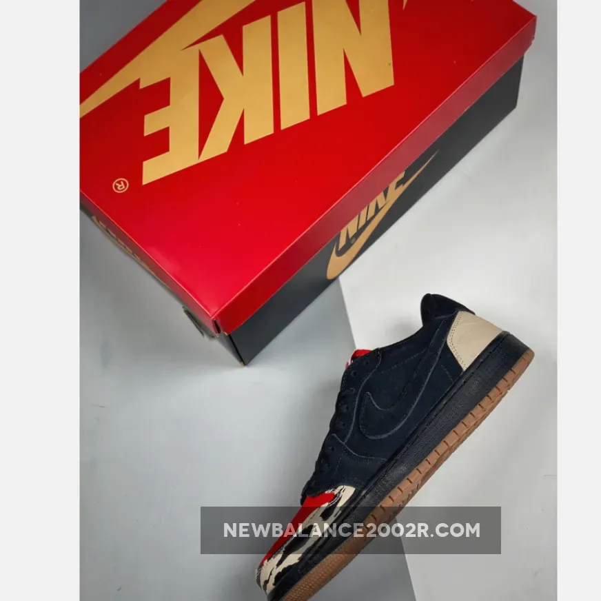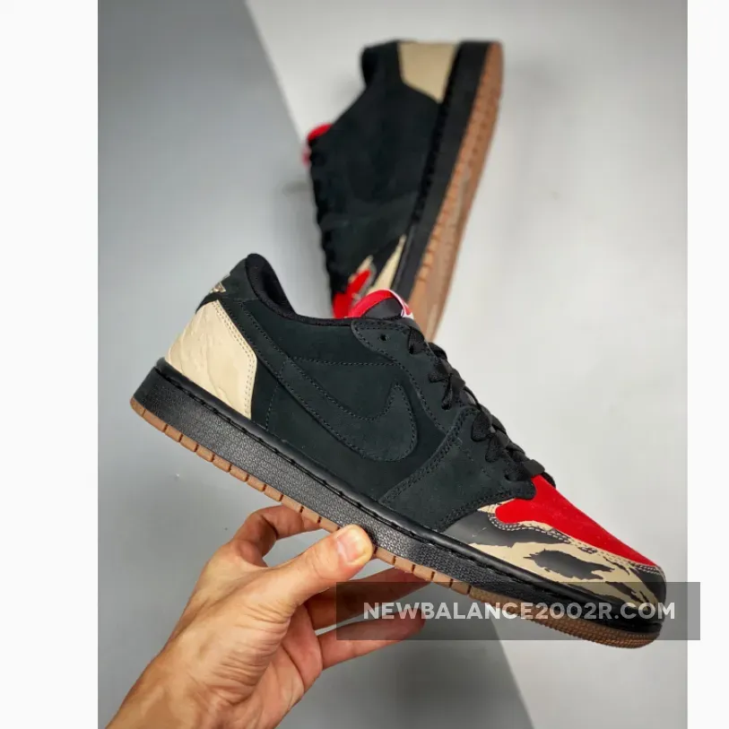 Originally teased by Travis Scott, this collaborative SoleFly x Air Jordan 1 Low is apparently inspired by the Air Carnivore form 1993 – shown on the pattern that dresses the midsole, and 2003’s “Bison” Nike SB Dunk Low – its Red suede toe box. The rest of its upper is constructed in Black suede with matching laces and nylon tongues. SoleFly’s logo is embroidered on the left heel while the shoe is completed with a Gum rubber outsole.