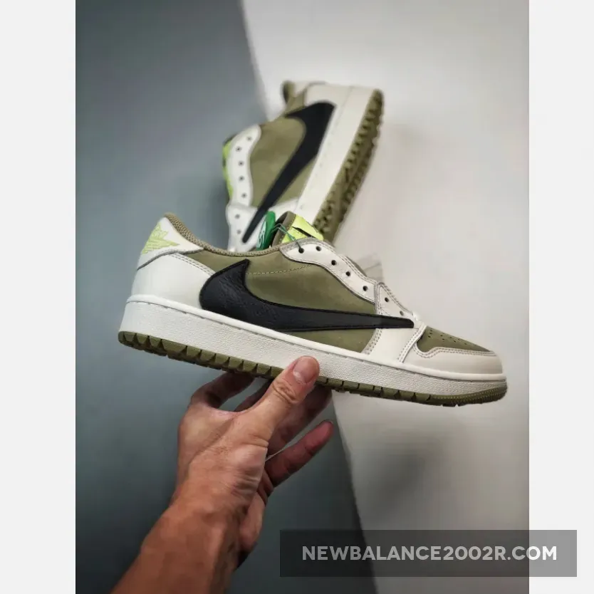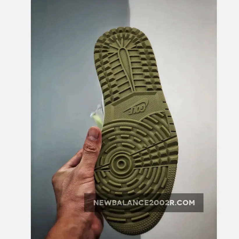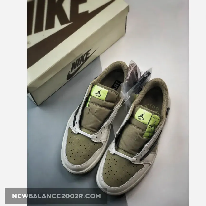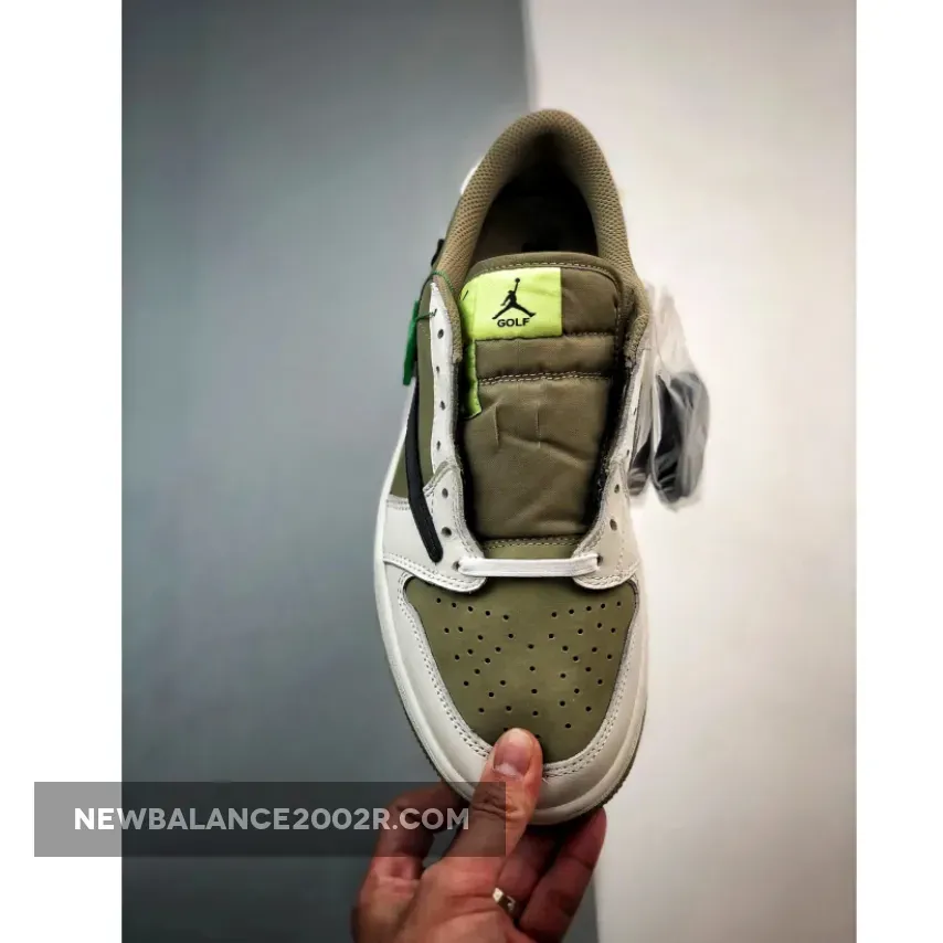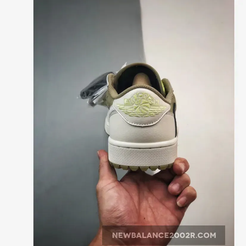 The Travis Scott x Air Jordan 1 Low Golf adds a performance upper and golf branding. These shoes feature an Olive suede base layer with White leather overlays on the upper.