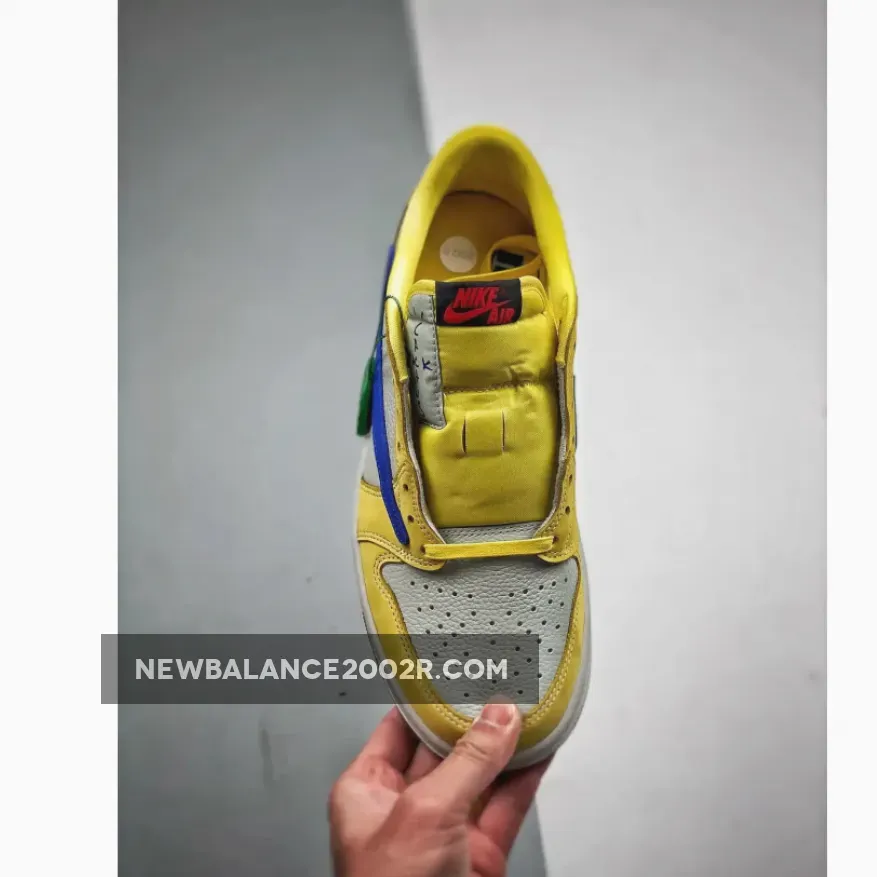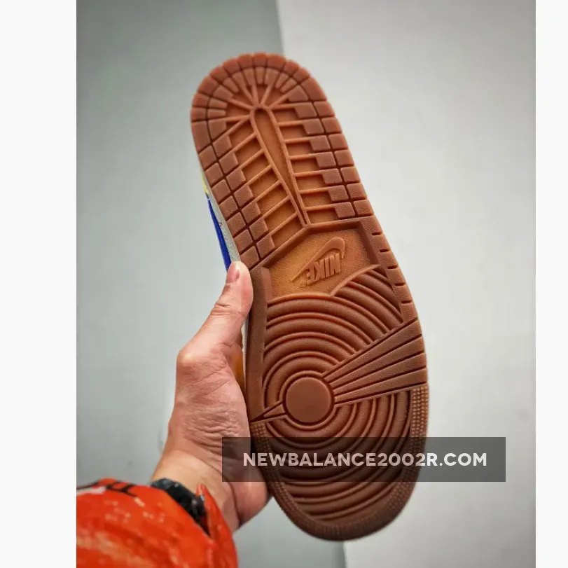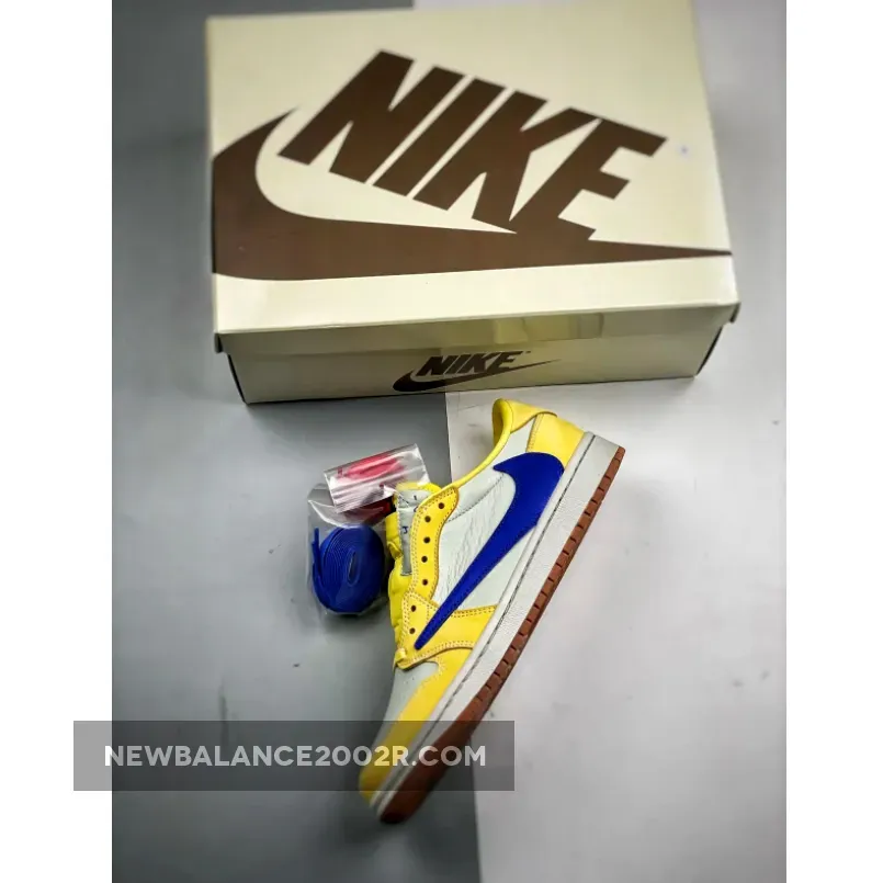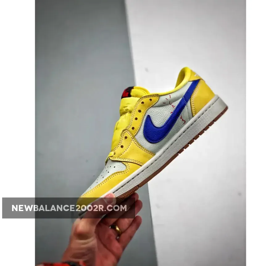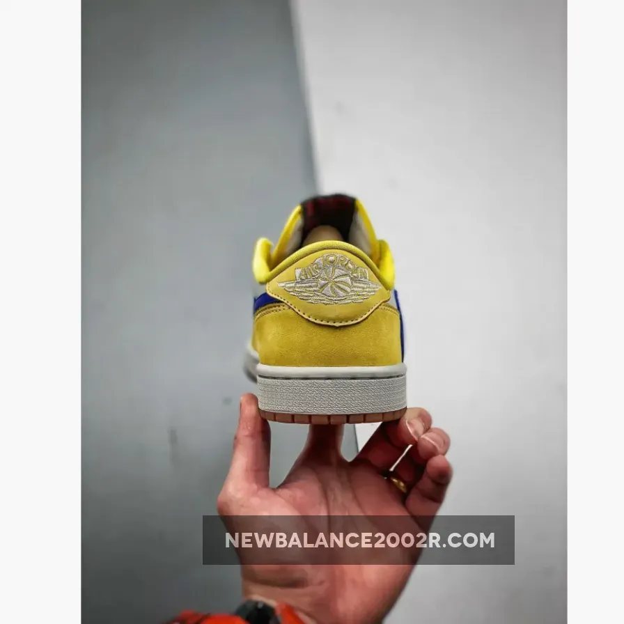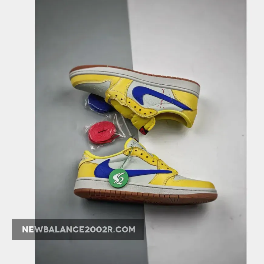 Sporting a Canary, Racer Blue, Light Silver, and Gum Medium Brown color combination. This Air Jordan 1 Low is inspired by Travis Scott’s high school, Elkins High Knights.