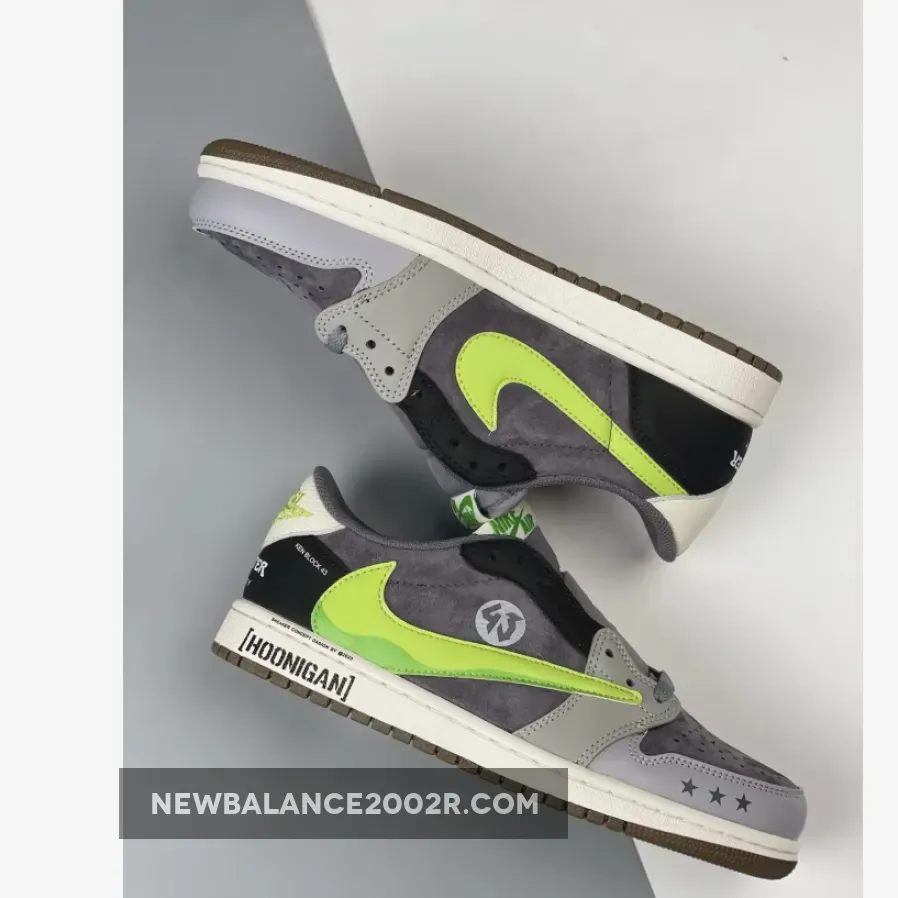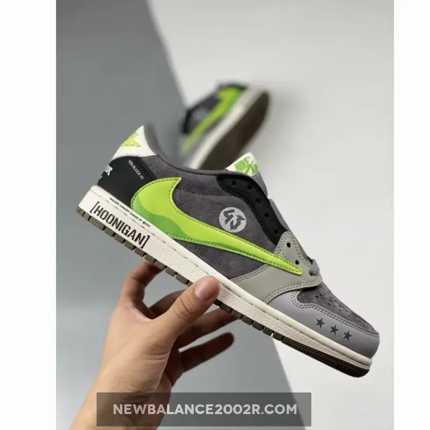 The appearance is very good-looking. The grey & black vamp is decoreated with bright green. The Swoosh logo position has number 43. The side of shoe head has 3 stars’ deoration. There are many details on the shoes. The outsole is brown.