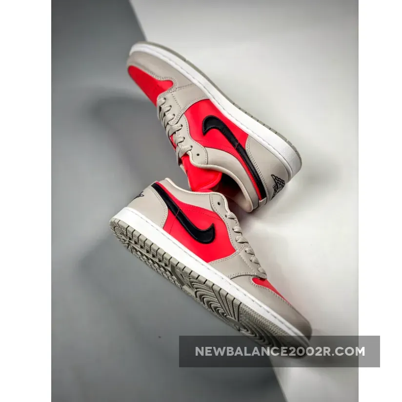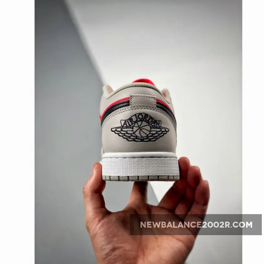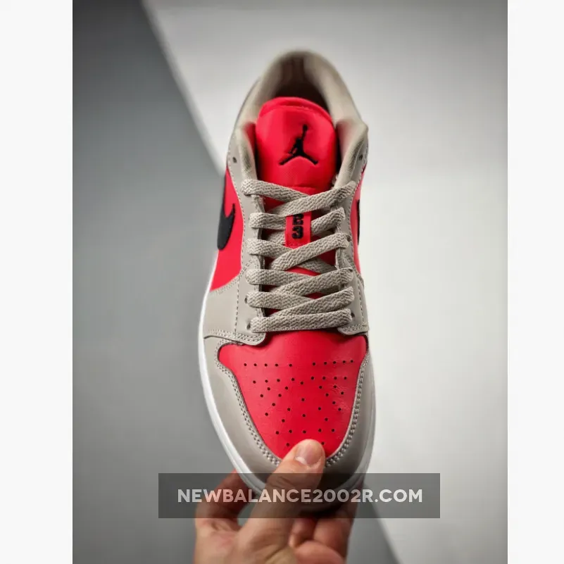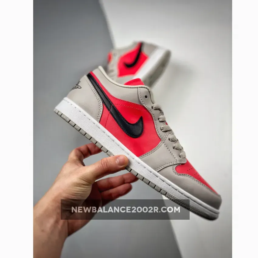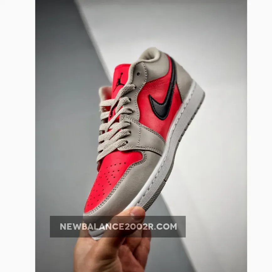 Dressed in a Light Iron Ore, Black, and Siren Red color scheme. This offering of the low-top Air Jordan 1 comes in a leather build featuring a Siren Red base with Black Swooshes and Light Iron Ore overlays. Black embroidered branding on the mesh tongues and heels atop a White midsole and Grey rubber outsole completes the design.